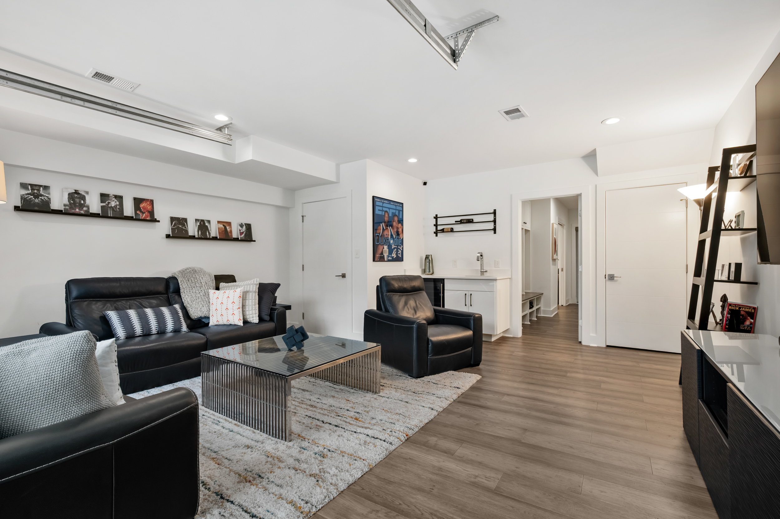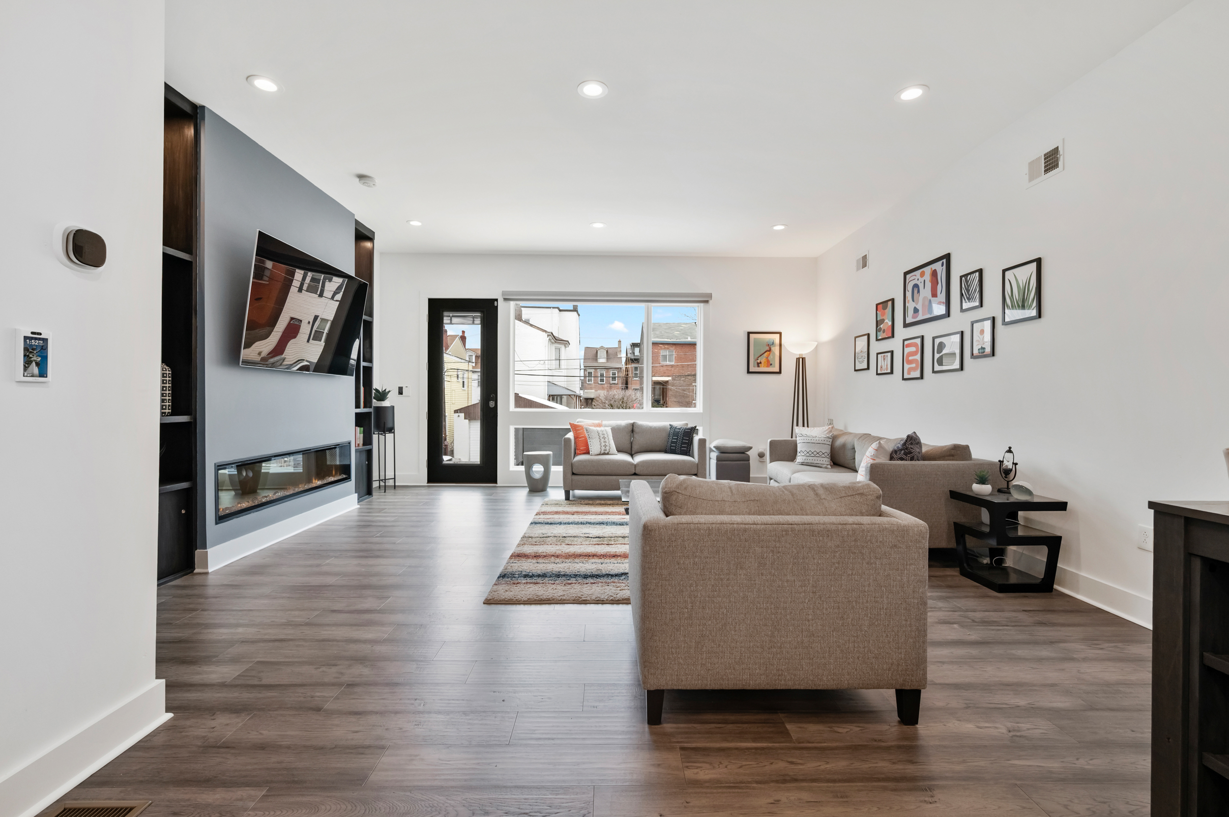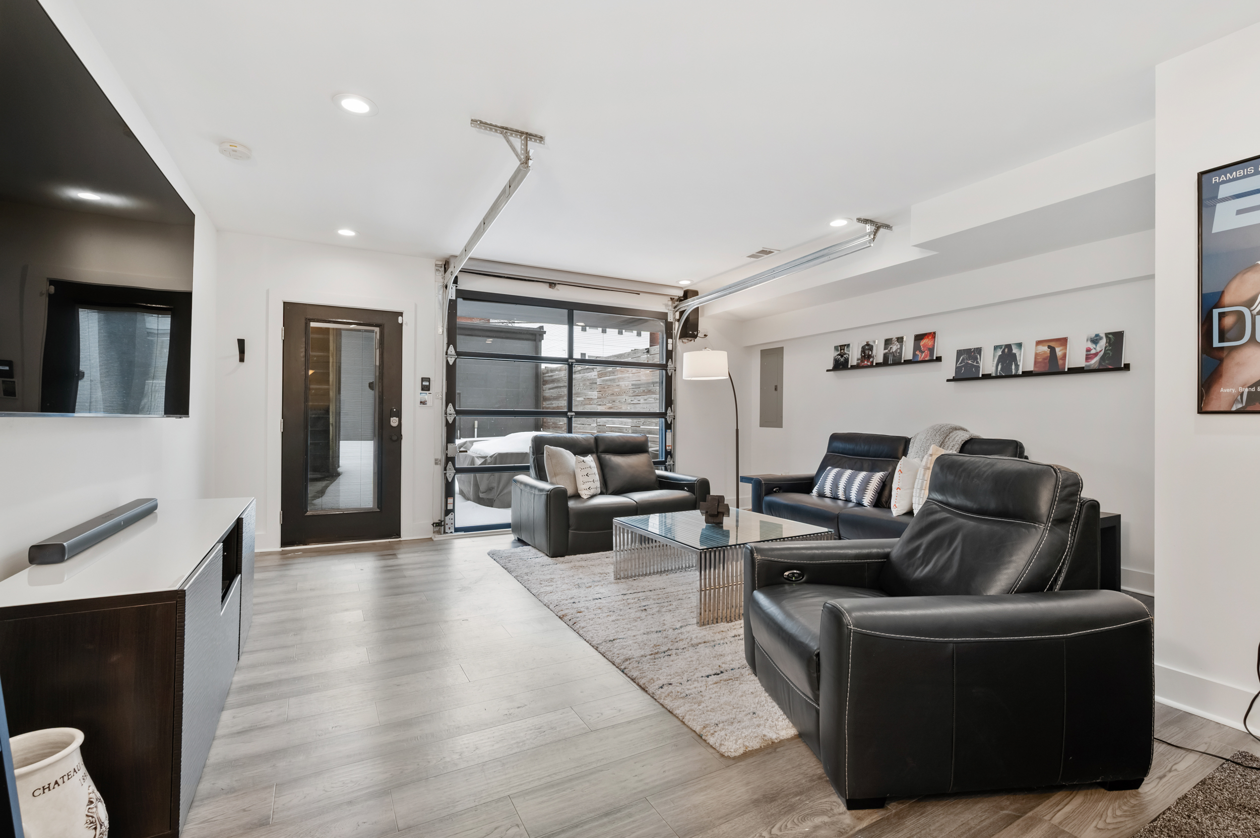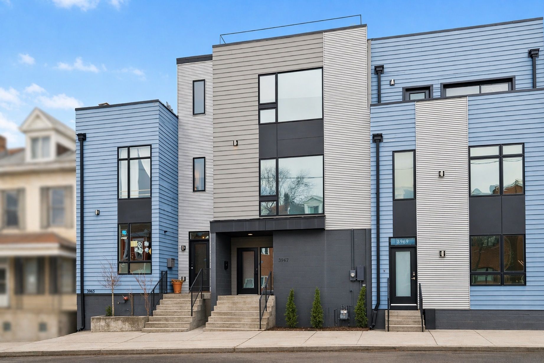Custom-built smart home offering 4 levels of living and 3 levels designed for entertaining in the heart of Bloomfield. This modern residence features glass garage doors that open to create seamless indoor-outdoor living, sound-reducing windows, and numerous custom upgrades throughout. The main living level includes an open-concept kitchen with an oversized quartz island, modern cabinetry, a beverage center, and a wine fridge. Large windows provide abundant natural light while maintaining privacy and comfort. The primary suite includes a private en-suite bath and generous closet space. Two additional bedrooms offer flexibility for guests, an office, or a fitness space. The lower level is designed for entertaining with a media/entertainment room and wet bar area that opens to the fenced turfed yard. Outdoor features include a rooftop deck with city views, a 20x20 fenced yard with low-maintenance turf, and a detached 2-car garage. Conveniently located near Lawrenceville, the Strip District, hospitals, universities, dining, and downtown Pittsburgh