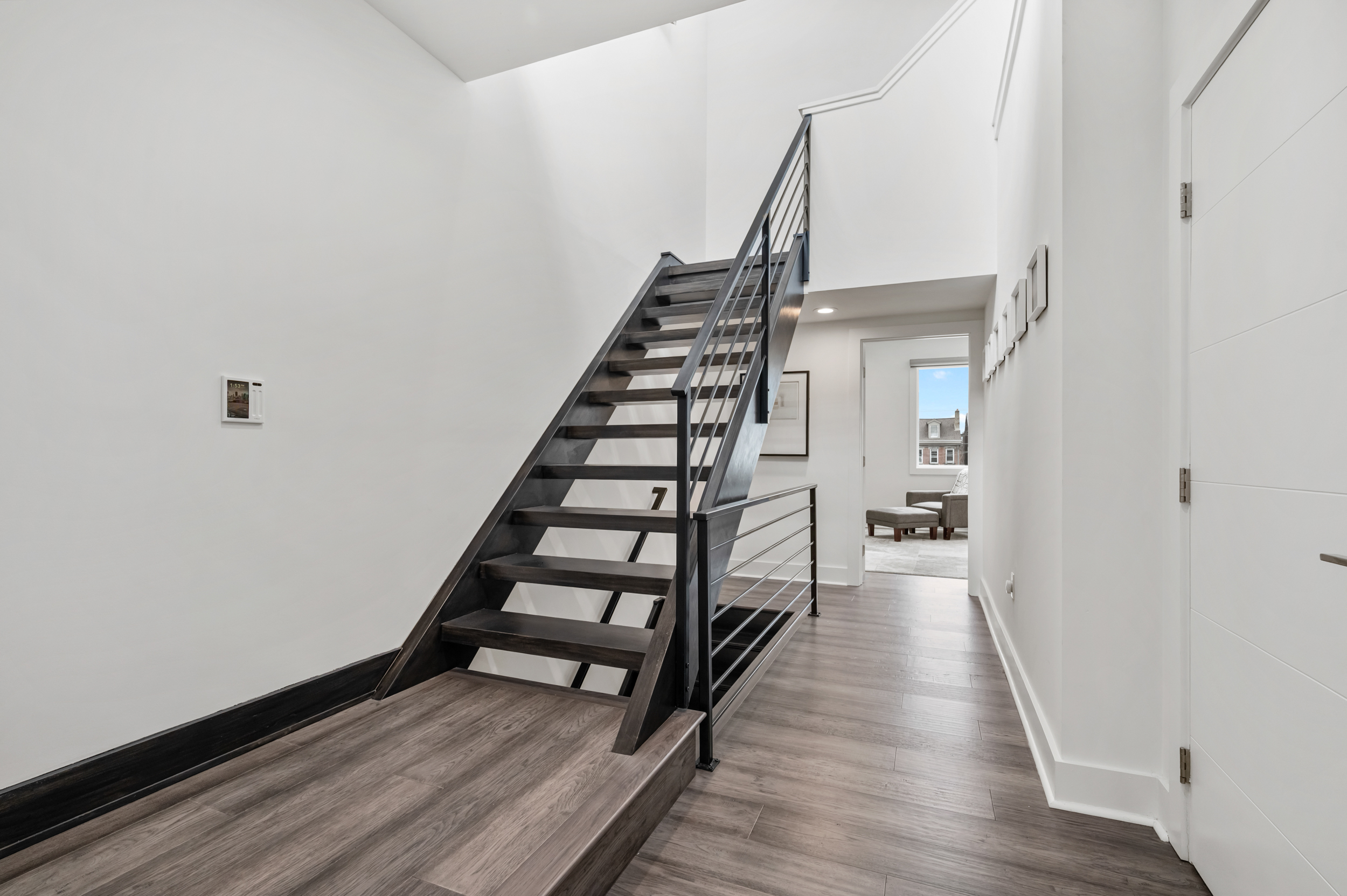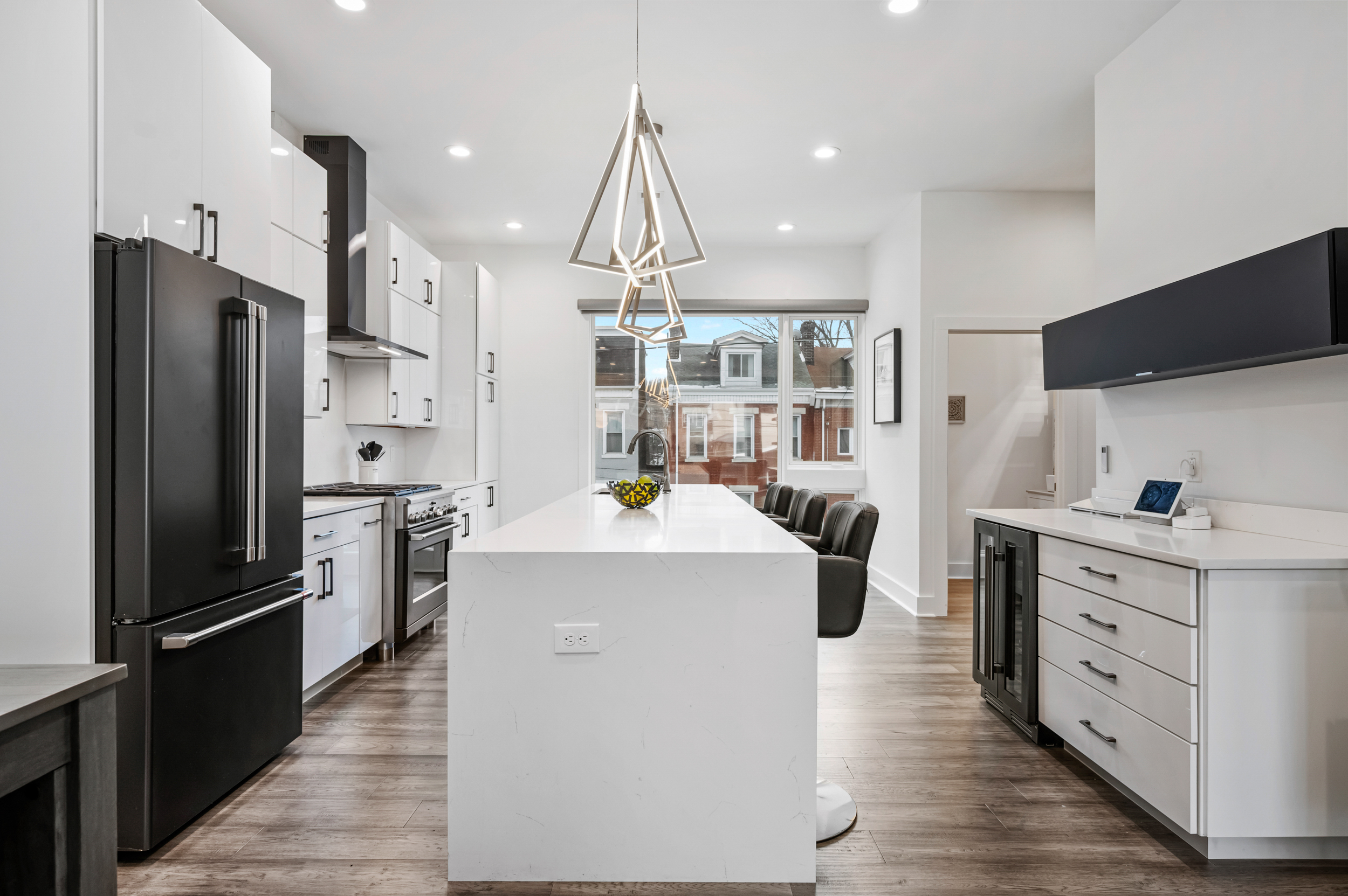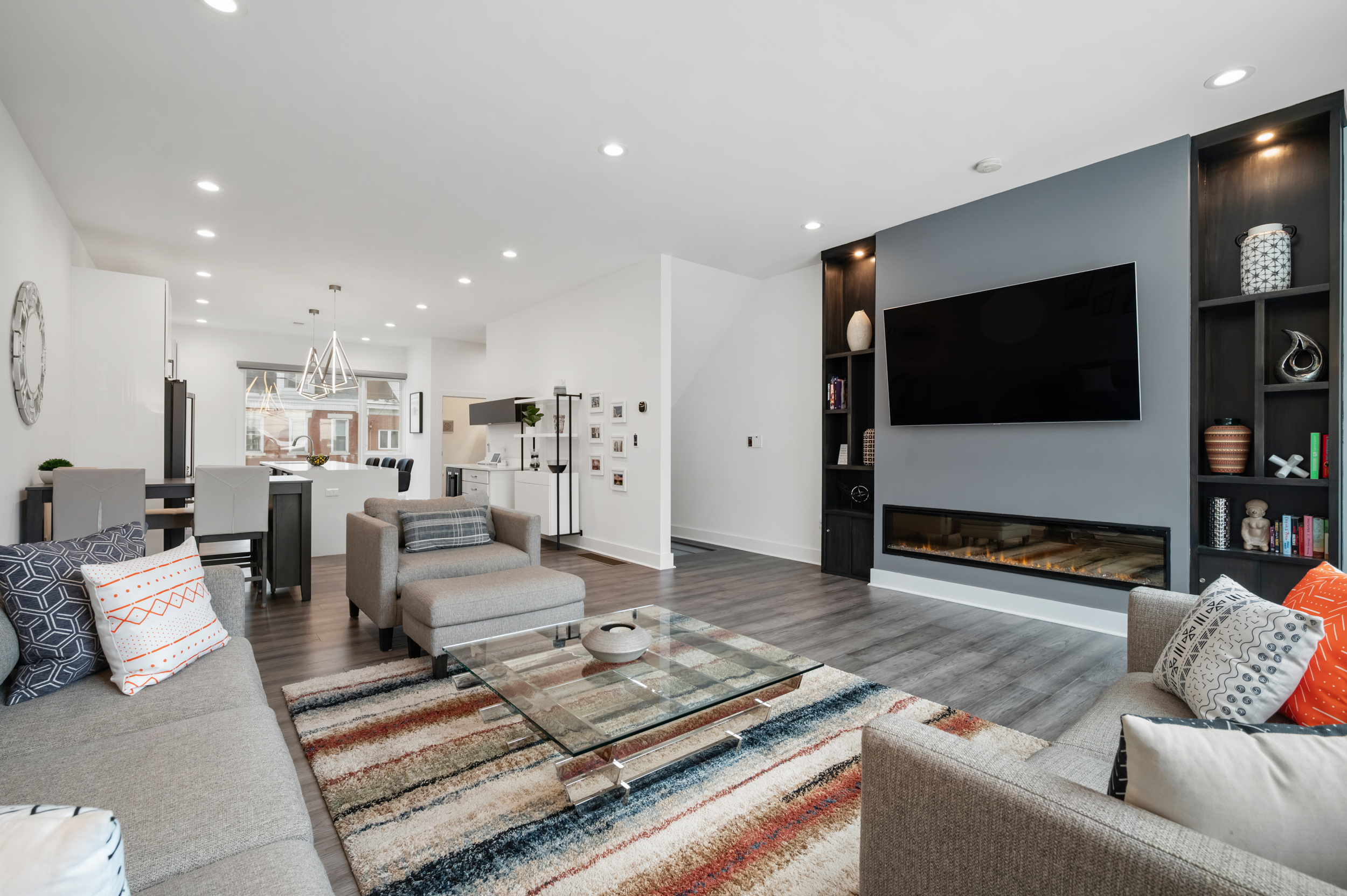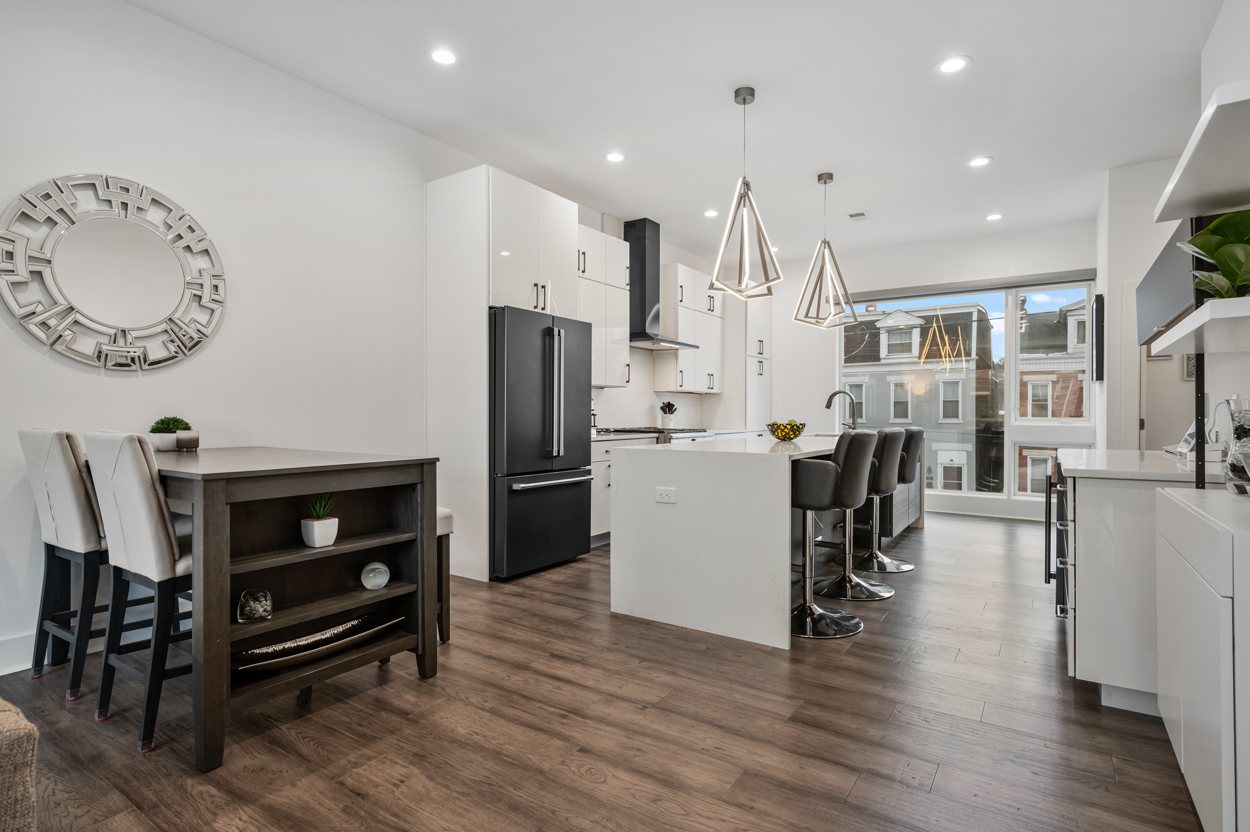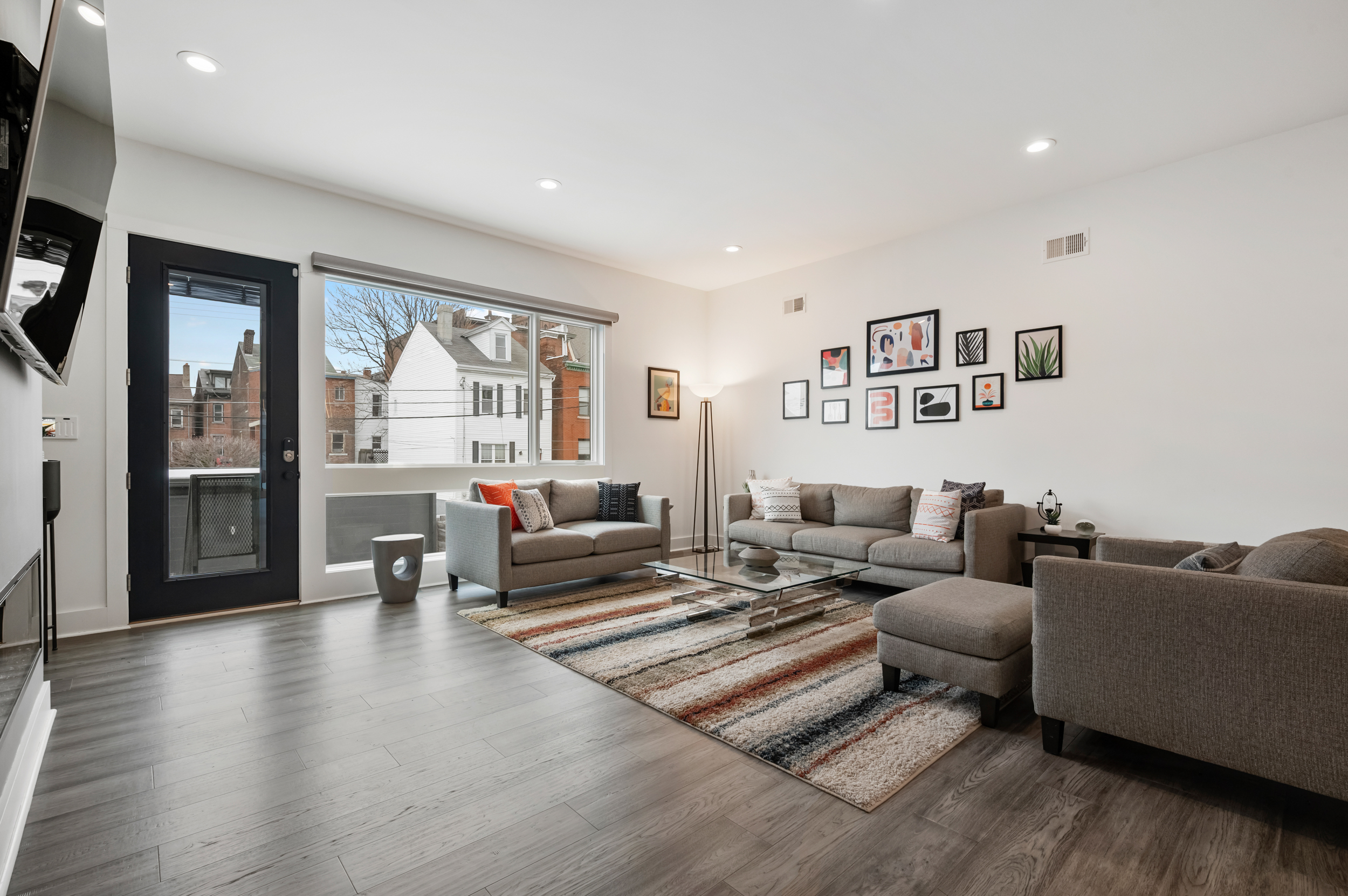Custom-built smart home offering 4 levels of living and 3 levels designed for entertaining in the heart of Bloomfield. This modern residence features glass garage doors that open to create seamless indoor-outdoor living, sound-reducing windows, and numerous custom upgrades throughout. The main living level includes an open-concept kitchen with an oversized quartz island, modern cabinetry, a beverage center, and a wine fridge. Large windows provide abundant natural light while maintaining privacy and comfort. The primary suite includes a private en-suite bath and generous closet space. Two additional bedrooms offer flexibility for guests, an office, or a fitness space. The lower level is designed for entertaining with a media/entertainment room and wet bar area that opens to the fenced turfed yard. Outdoor features include a rooftop deck with city views, a 20x20 fenced yard with low-maintenance turf, and a detached 2-car garage. Conveniently located near Lawrenceville, the Strip District, hospitals, universities, dining, and downtown Pittsburgh