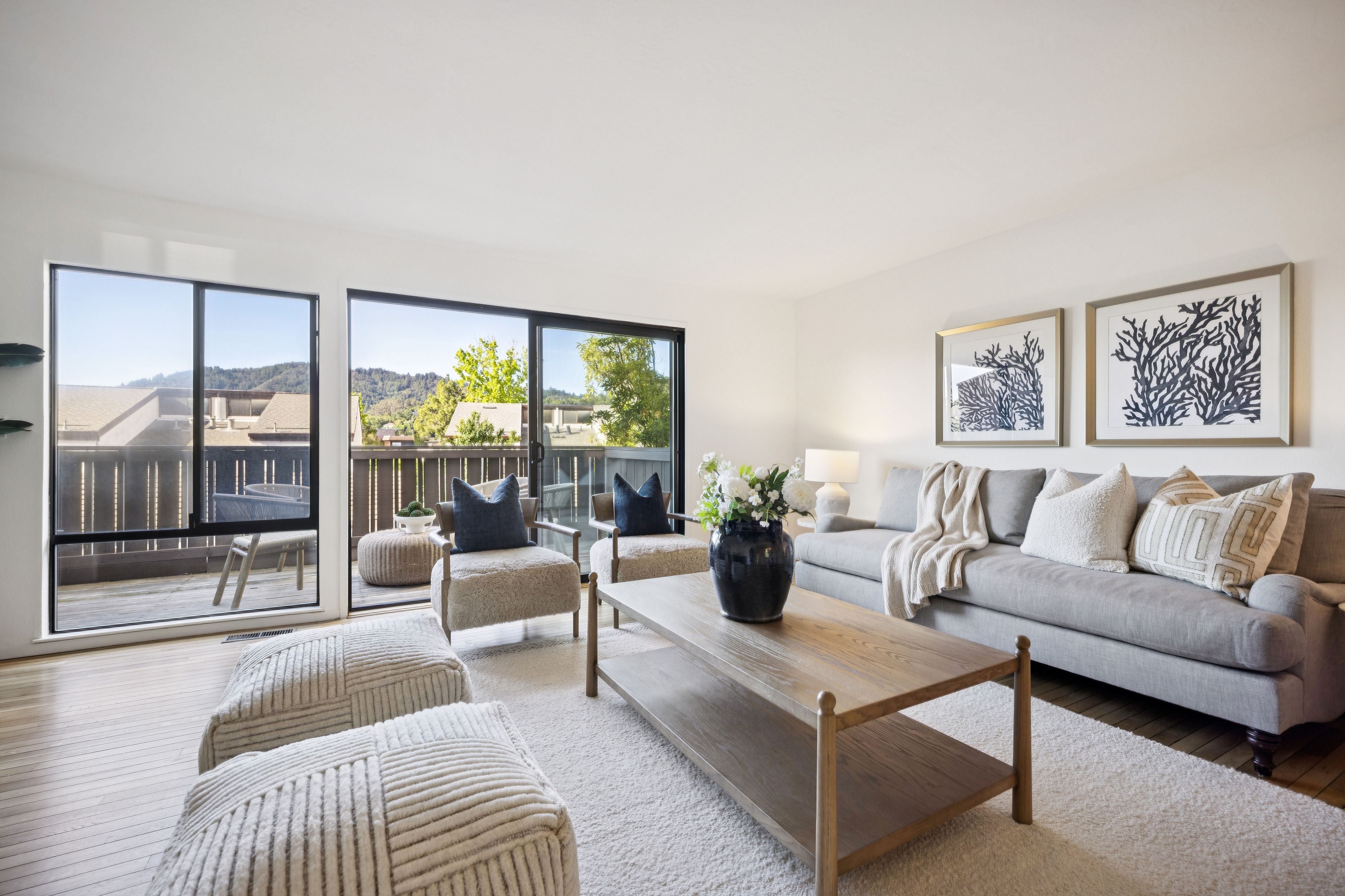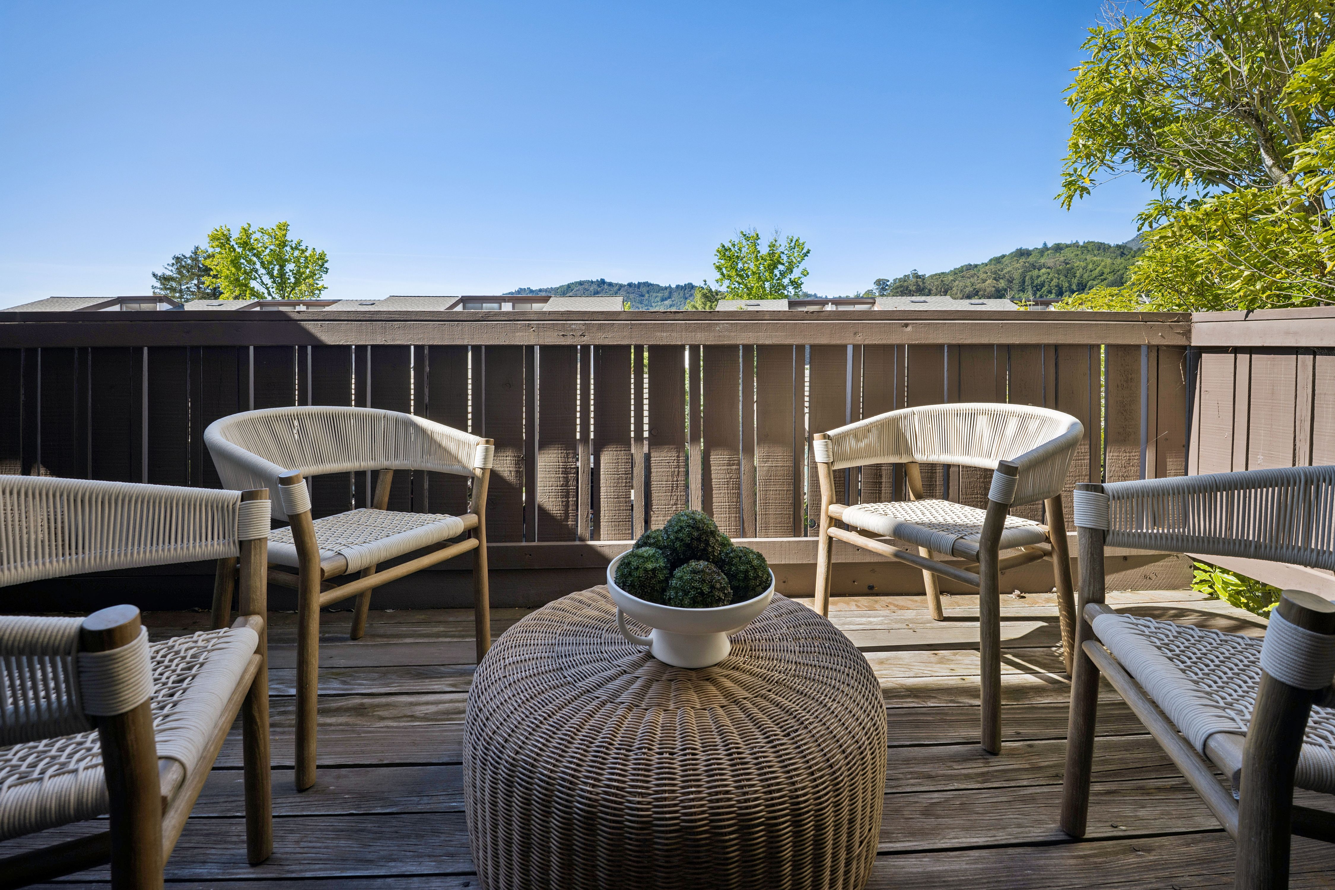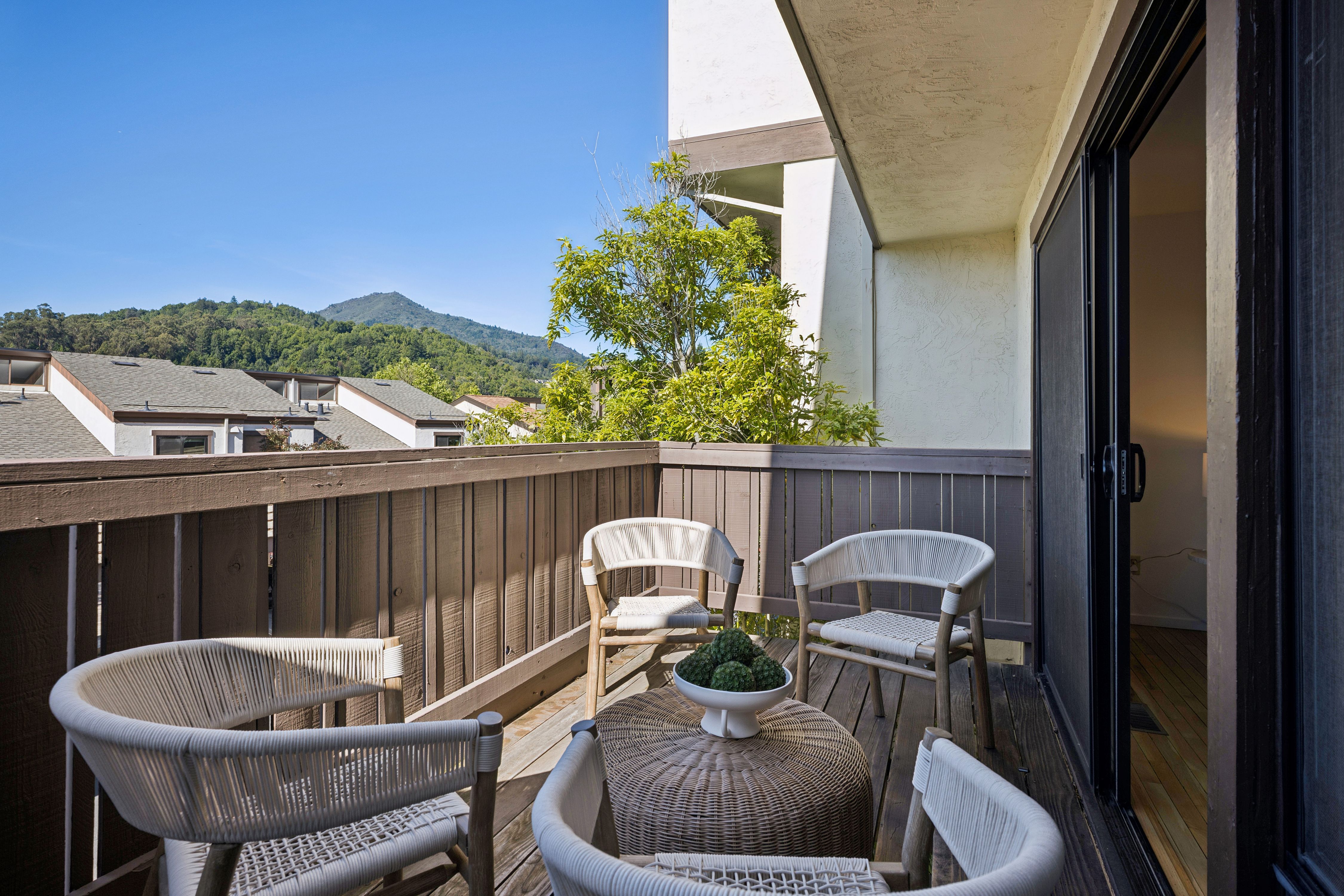Ideally located three bedroom/two-and-a-half bath townhome with over 1,600 square feet of living space. The well-designed floorplan includes an attached two-car garage, oversized laundry room, and bonus space for a workshop or storage—ideal for work-from-home living.The spacious living and dining area features hardwood floors and opens to a private view deck. The kitchen offers quartz countertops and ample storage.Upstairs, the primary suite features cathedral ceilings, a walk-in closet with custom built-ins, and an ensuite bath. Two additional well-sized bedrooms share a full bath with shower over tub. The community includes a pool and is close to Corte Madera Creek, walking paths, Bon Air Shopping Center, medical offices, and Hwy 101. Located in the coveted Kentfield School District with access to Redwood High School.Quiet cul-de-sac setting with southwest exposure for great natural light and Mount Tam views. Rarely available floorplan – don’t miss this one.