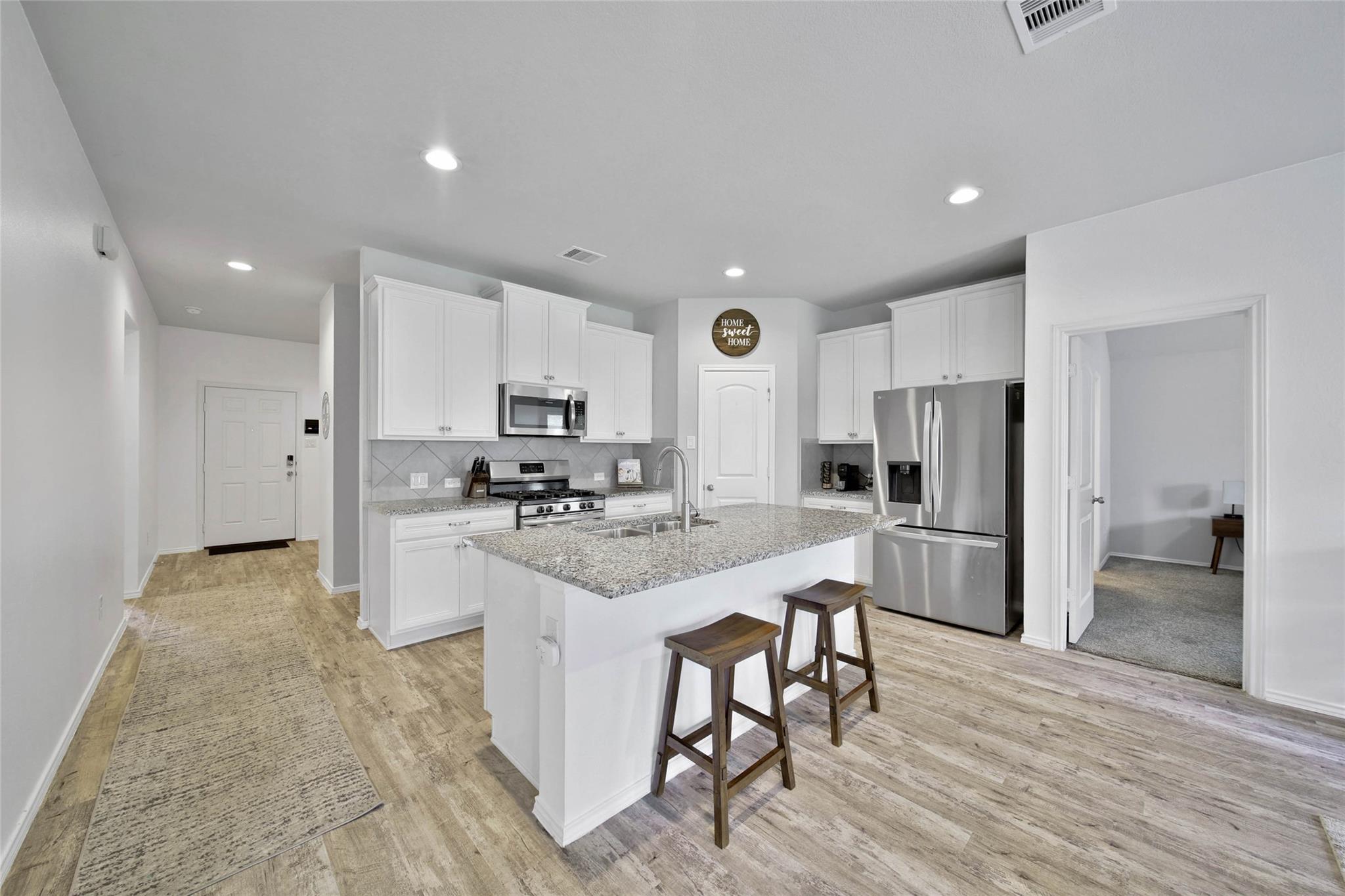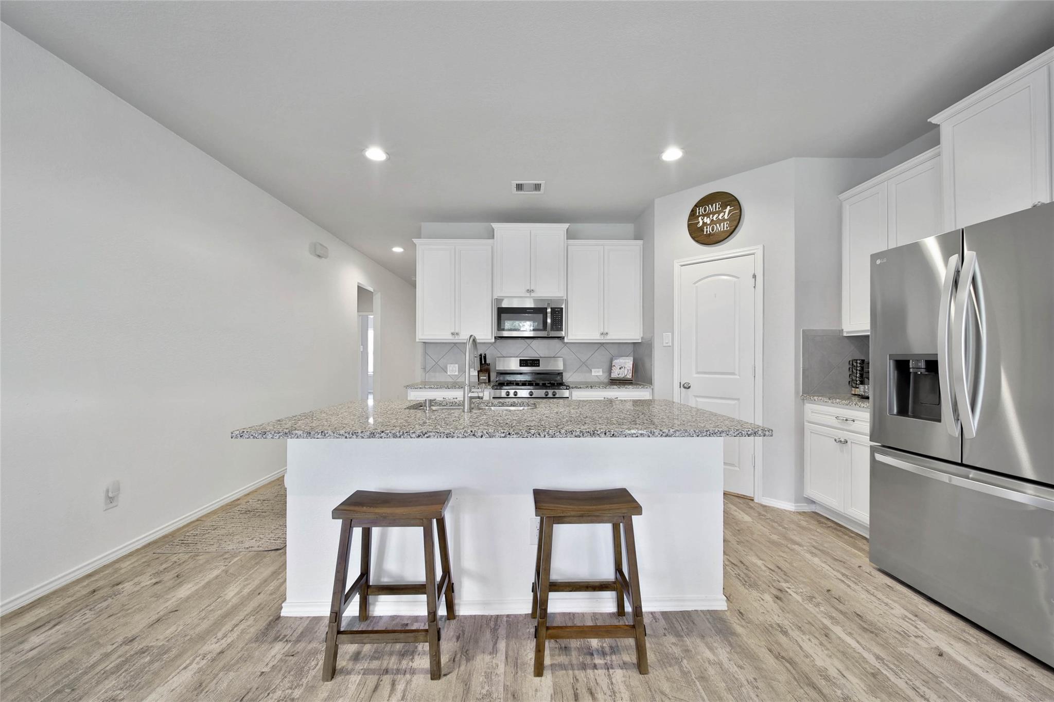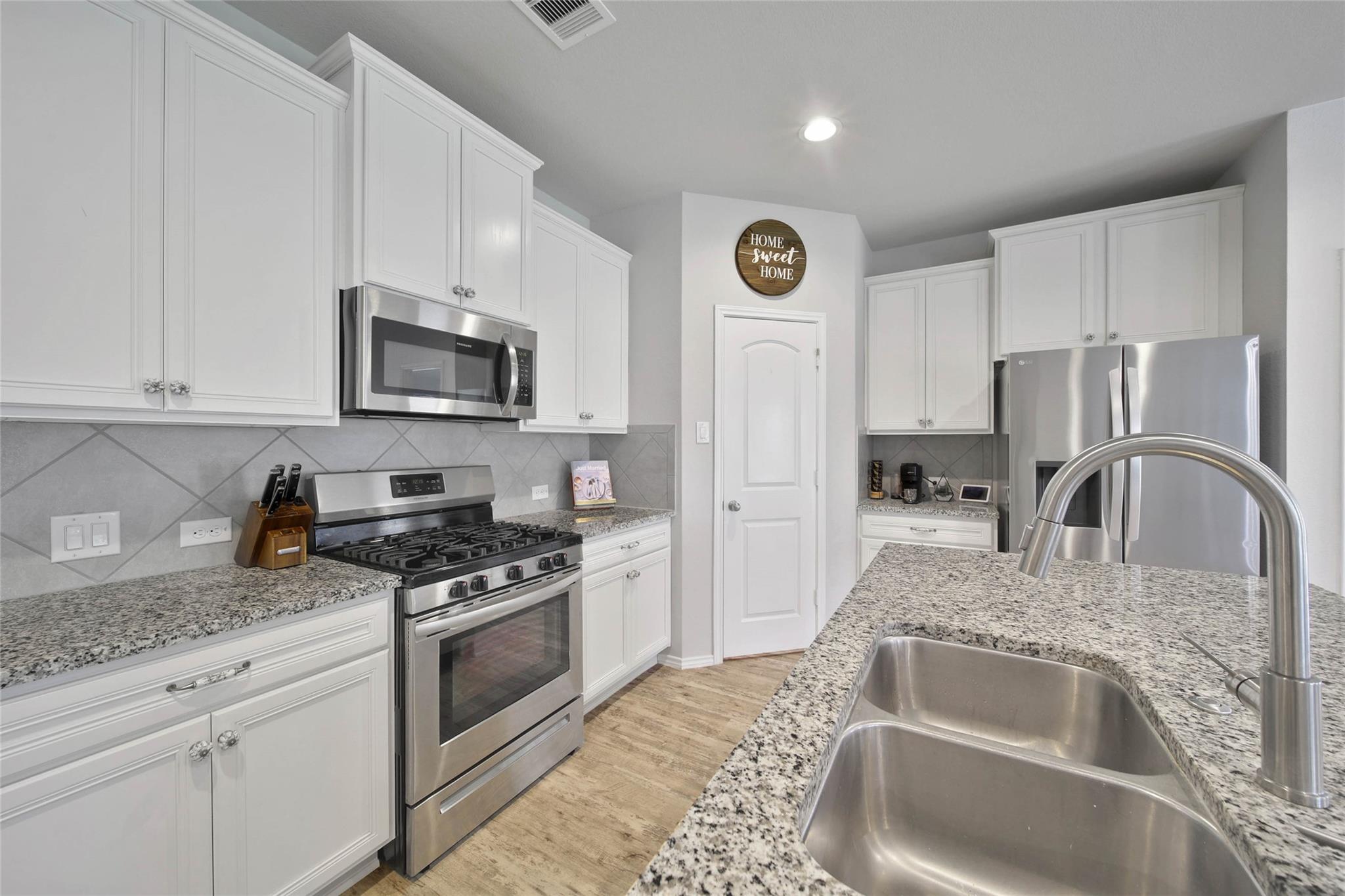 Ideal 3-bedroom, 2-bath home in a prime location with a standout backyard that opens directly to Carl Barton Jr. Park. The brick and stone exterior and lush lawn create inviting curb appeal. Inside, a spacious entry flows into a functional open-concept, split-bedroom layout ideal for modern living. Two well-sized secondary bedrooms and a full bath sit at the front of the home. The island kitchen overlooks the living and dining areas and features rich cabinetry, granite countertops, stainless steel appliances, island seating, and a large pantry. The private primary suite offers an ensuite bath with dual sinks, soaking tub, separate shower, and an oversized walk-in closet. A spacious laundry room provides extra storage and garage access. Enjoy a large backyard with direct access to the 201-acre Carl Barton Jr. Park, featuring trails, playgrounds, athletic fields, fishing ponds, and picnic areas - an exceptional extension of your outdoor living space. World class shopping and dining nearby!
