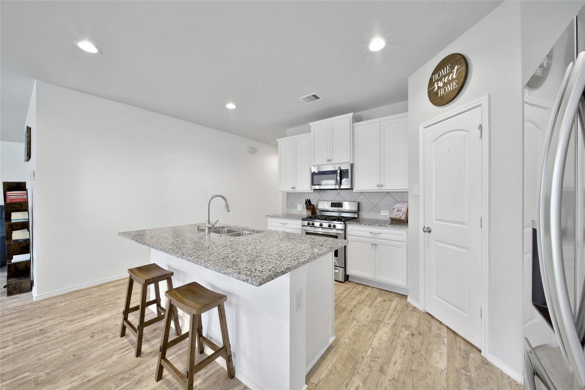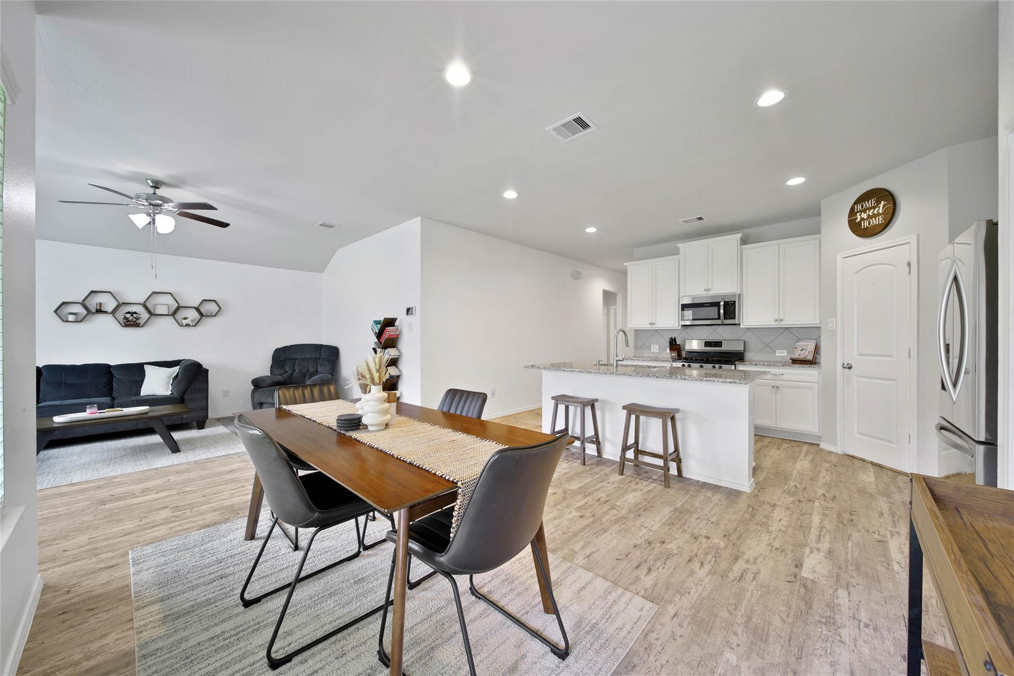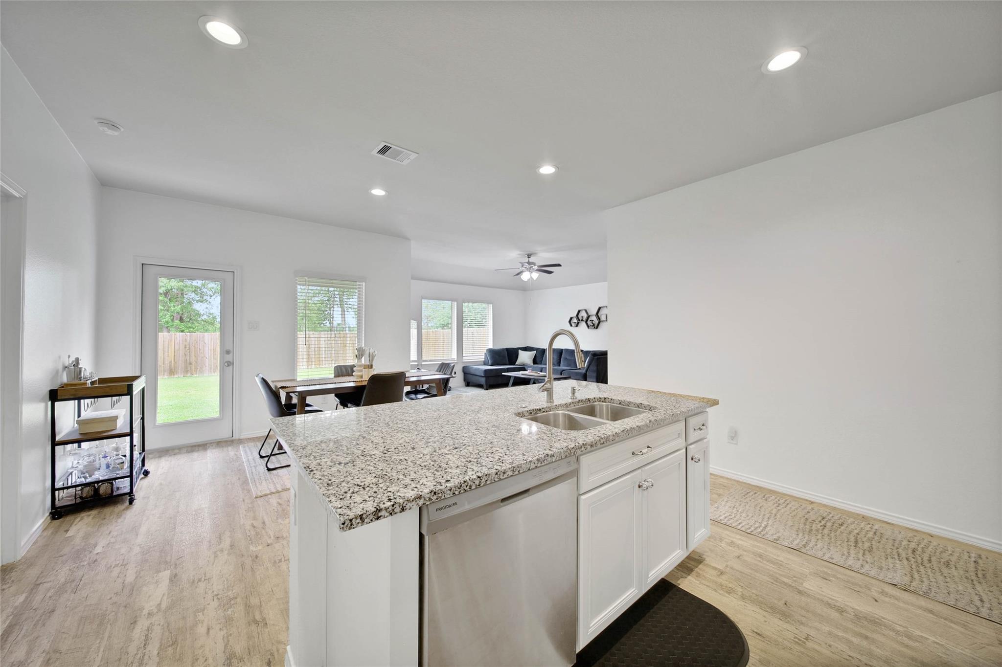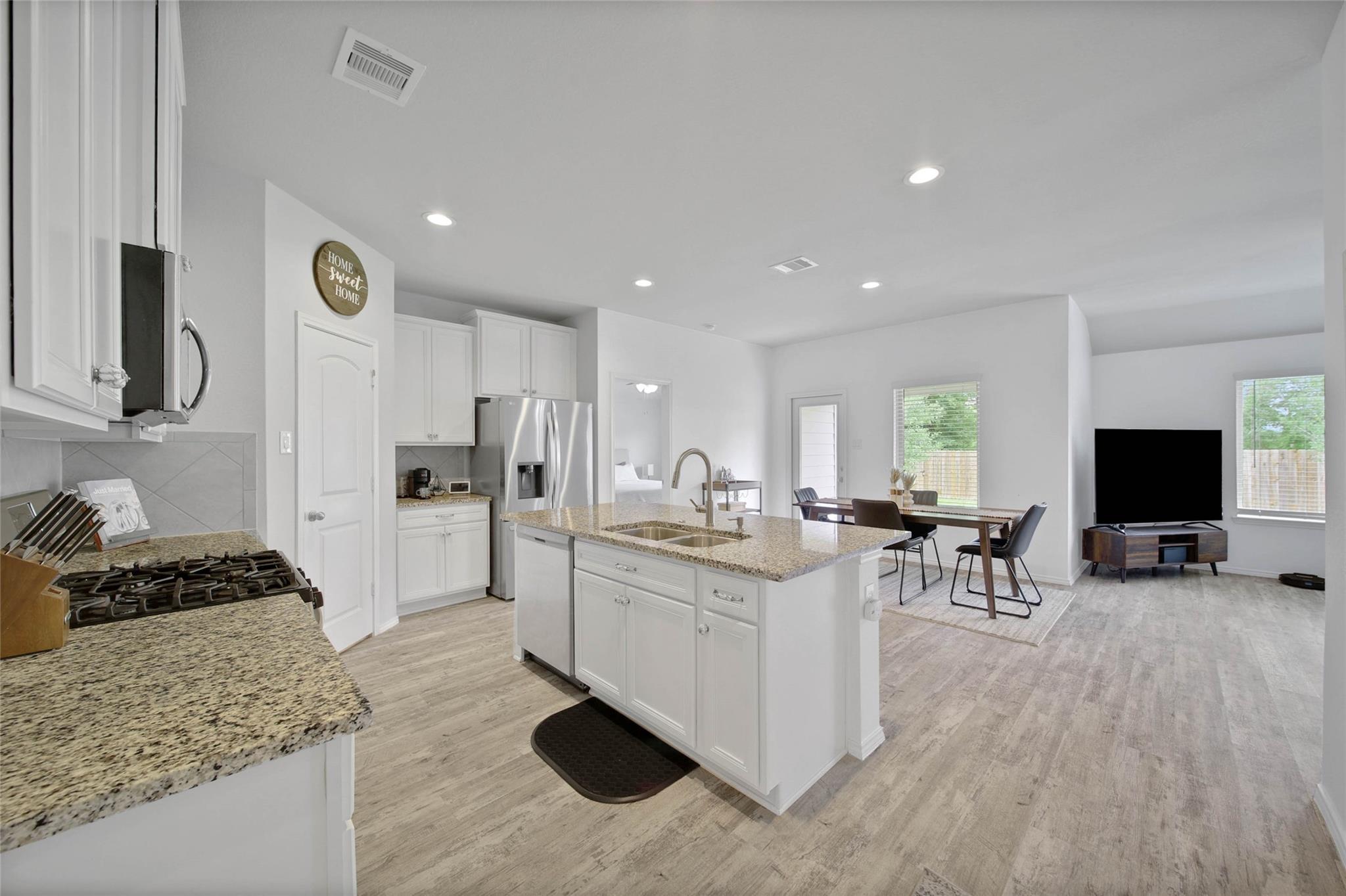 Ideal 3-bedroom, 2-bath home in a prime location with a standout backyard that opens directly to Carl Barton Jr. Park. The brick and stone exterior and lush lawn create inviting curb appeal. Inside, a spacious entry flows into a functional open-concept, split-bedroom layout ideal for modern living. Two well-sized secondary bedrooms and a full bath sit at the front of the home. The island kitchen overlooks the living and dining areas and features rich cabinetry, granite countertops, stainless steel appliances, island seating, and a large pantry. The private primary suite offers an ensuite bath with dual sinks, soaking tub, separate shower, and an oversized walk-in closet. A spacious laundry room provides extra storage and garage access. Enjoy a large backyard with direct access to the 201-acre Carl Barton Jr. Park, featuring trails, playgrounds, athletic fields, fishing ponds, and picnic areas - an exceptional extension of your outdoor living space. World class shopping and dining nearby!