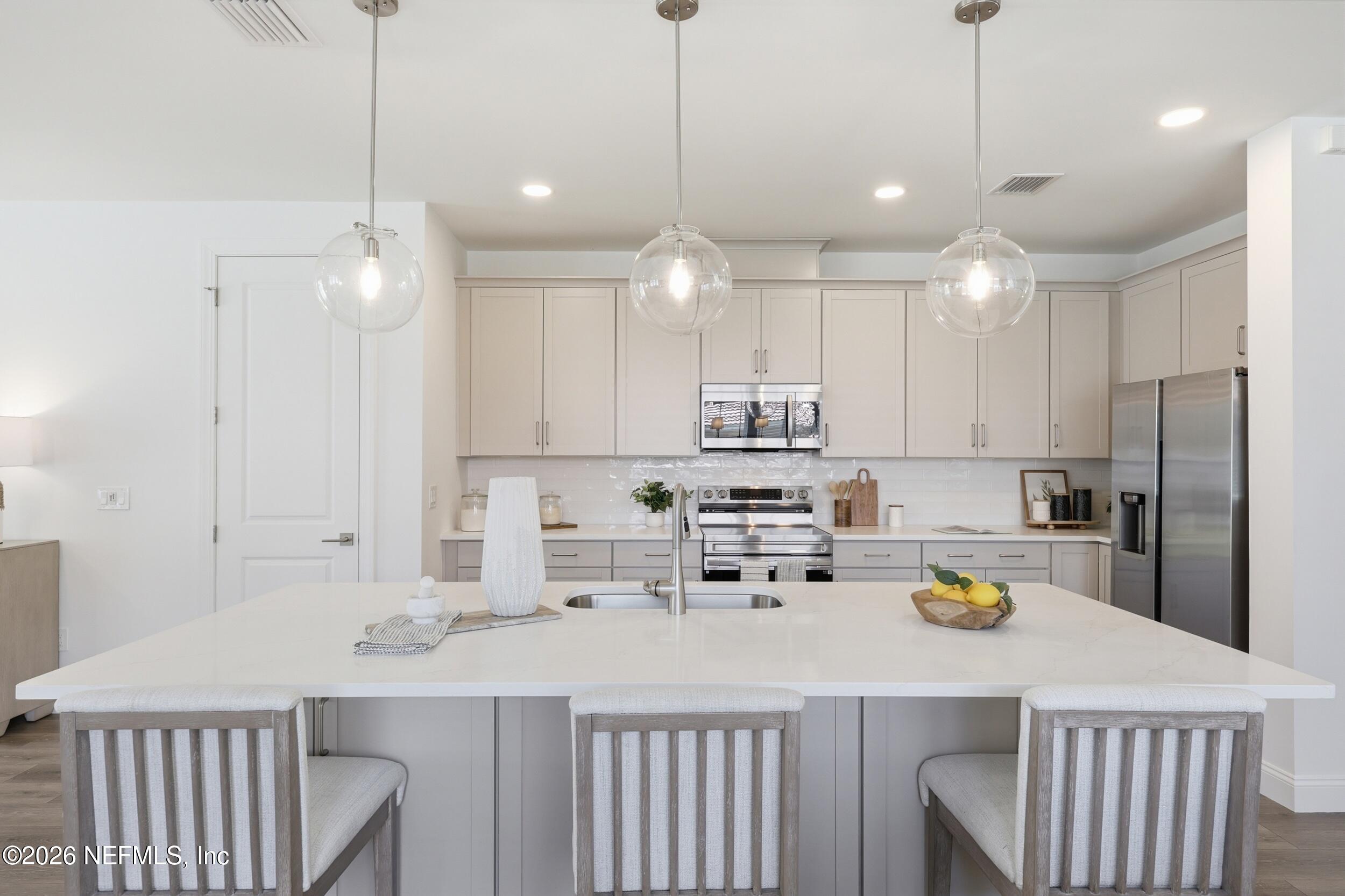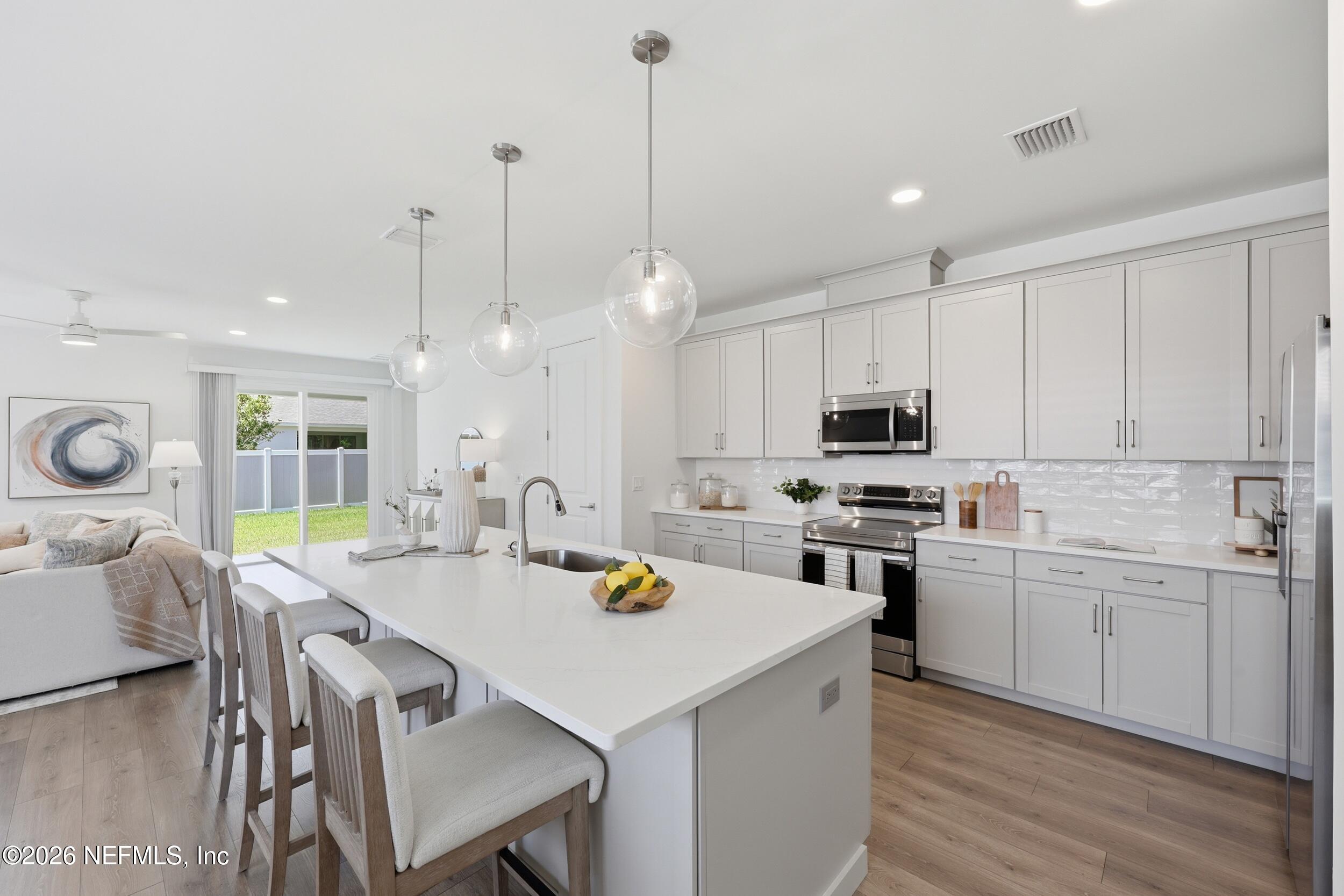 This is your opportunity to own a move-in ready, energy-efficient, smart home in Palm Coast--where comfort, quality construction, and modern living come together. Luxury within reach starts here. This is not just new construction--this is a high-performance, energy-efficient home designed to outperform the competition. Features include; Advanced Heating & Cooling: High-efficiency system with zoned technology for optimal comfort TechShield Radiant Barrier Roof System for improved energy savings Enhanced Insulation: Insulsafe SP fiberglass blown-in insulation Energy Star Appliances & LED Lighting for lower utility costs PlyGem 1500 Series Windows for efficiency and durability Tankless Water Heater (min. 3 GPM) + Moen low-flow plumbing fixtures Smart Home Technology Package Includes: Cat6 high-performance wiring Qolsys IQ2 smart panel SkyBell video doorbell Z-Wave integration Keyless entry system Built for Durability & Peace of Mind ZIP Panel System & Huber Advantech subflooring Engineere truss construction system Blower Door & Duct Blast testing + Quality Assurance inspections Complete gutter & downspout system for superior water management Professionally graded lot with approved drainage (swale system) Low-maintenance landscaping Welcome to 144 Point Pleasant Drive in Palm Coast's desirable Belle Terre neighborhood--where Southern living meets modern luxury in this move-in ready new construction home. From the welcoming covered front porch to the extended covered back patio, this home invites you to relax, unwind, and enjoy Florida living at its finest. This thoughtfully designed Kershaw model offers 1,890 square feet of single-story living along with a highly sought-after three-car garage, providing ample space for vehicles, storage, or hobbies. At the heart of the home, a bright and inviting family room serves as the central gathering space, seamlessly connecting to an eat-in breakfast area and a spacious oversized kitchen island--perfect for entertaining and everyday living. Large windows fill the home with abundant natural light, enhancing the open-concept design. The split floor plan delivers both privacy and functionality, with two secondary bedrooms located at the front of the home, while the owner's suite is privately situated at the rear, creating a peaceful and relaxing retreat. Conveniently located in Belle Terre, this home is just minutes from: Shopping & dining, Schools & parks, I-95 for easy commuting and Florida's beautiful beaches!