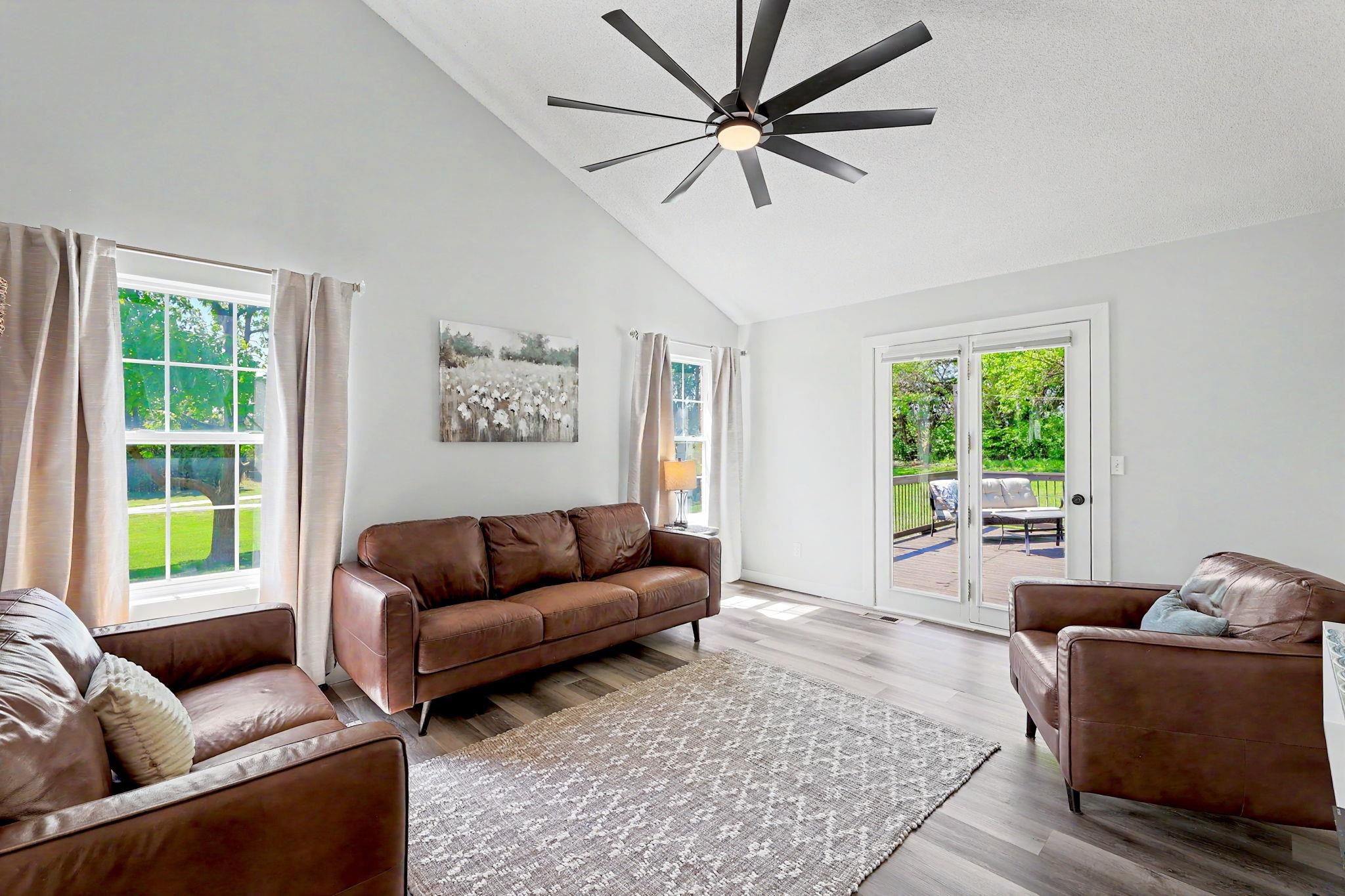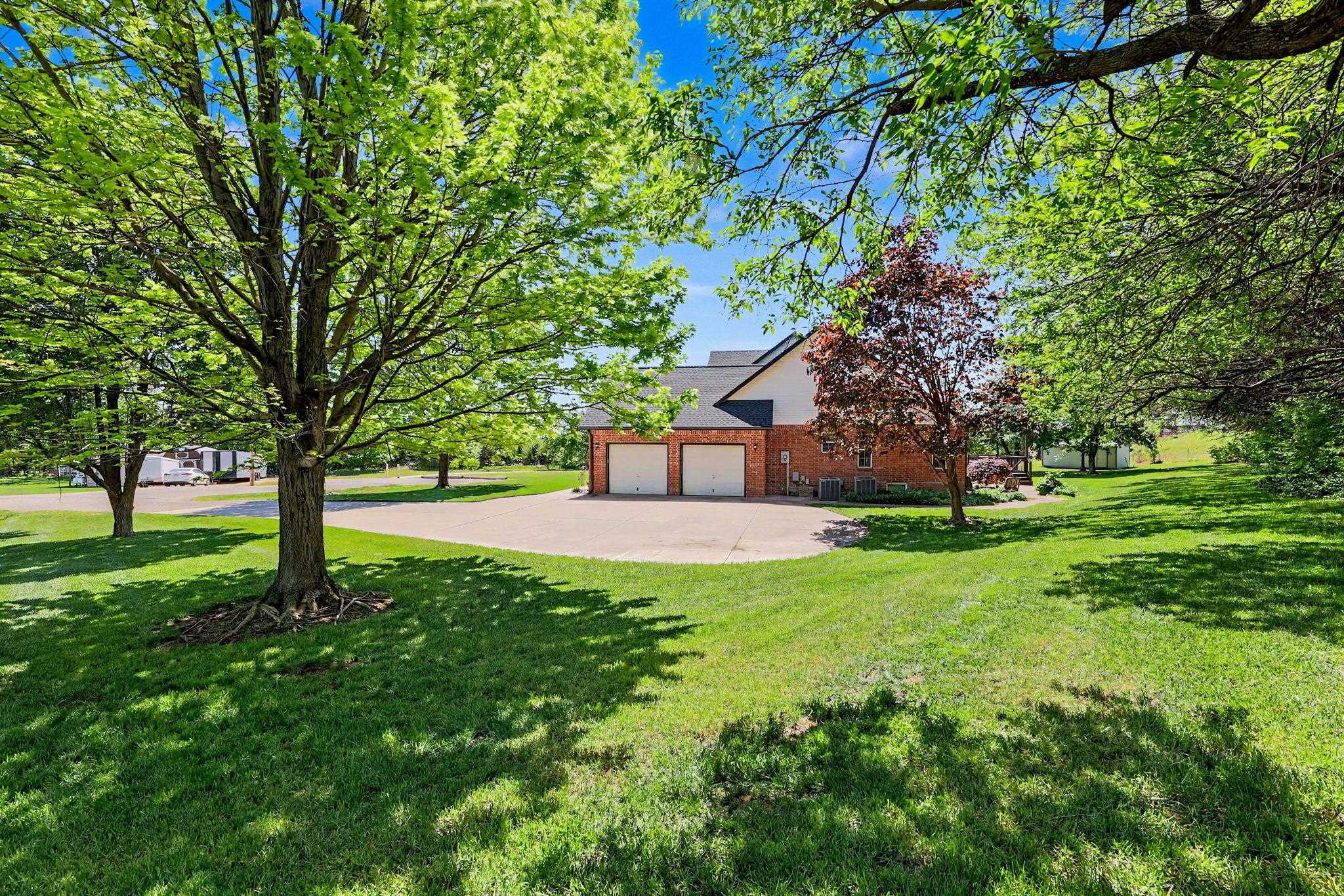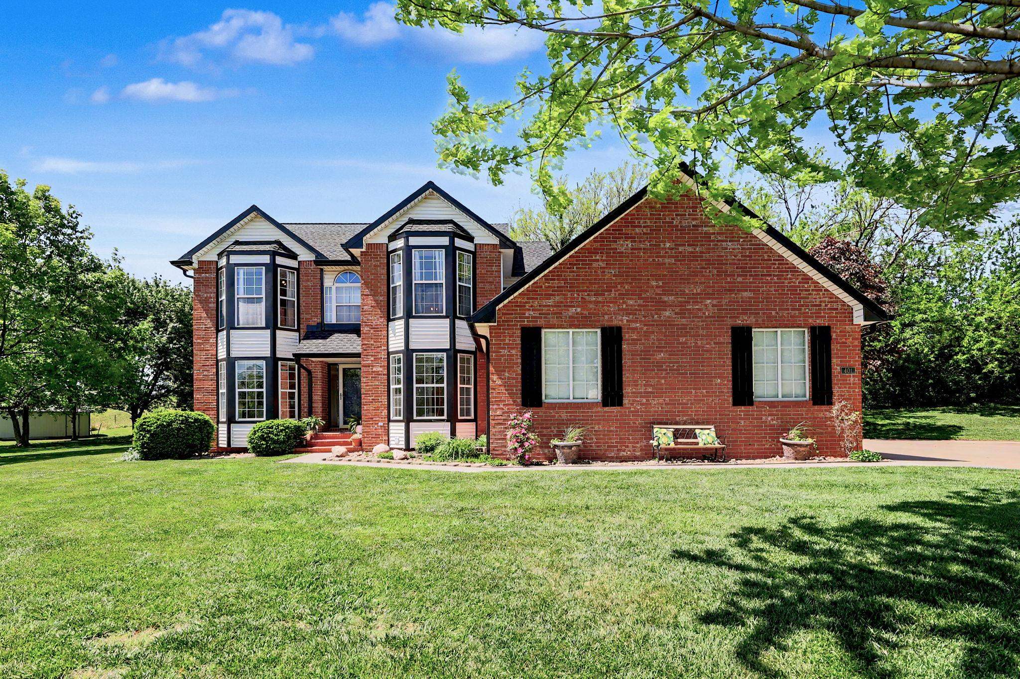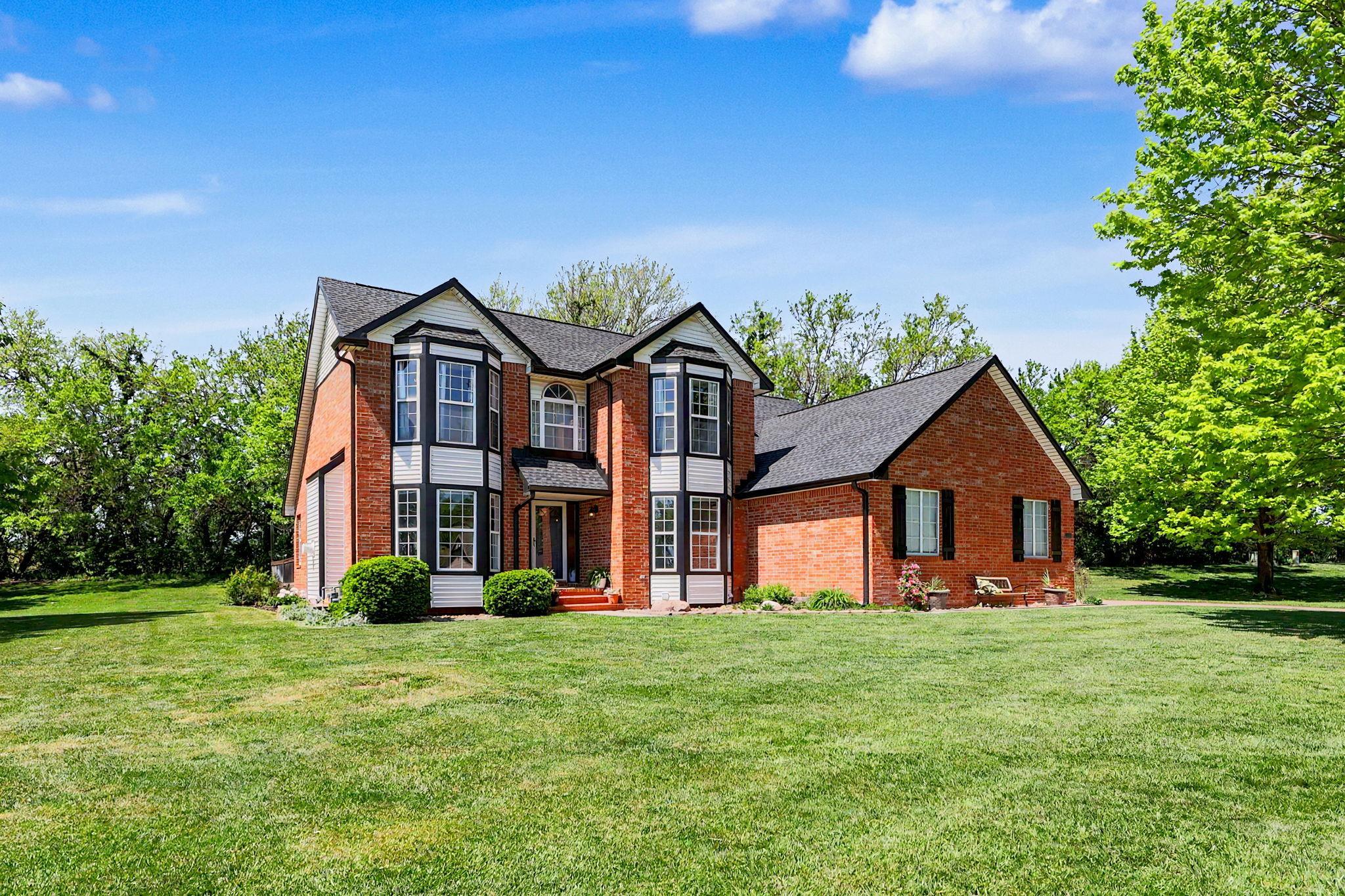 Come see this stately five bedroom, three and a half bath, three car garage home in the highly esteemed Trail Ridge Estates Neighborhood in the heart of Mulvane. This home is nestled in the back of the neighborhood at the end of a cul-de-sac which allows for extra parking and minimal neighbors with plenty of yard space. The property has tons of upgrades and exudes pride of ownership. On the exterior, it comes with a newer roof and gutters (2025), new exterior trim paint, new shutters, custom landscaping and a plush green lawn with irrigation well. This two story brick home has a large private back deck and patio right off of the living room, perfect for entertaining. Inside, there is large formal dining room with decorative fireplace, new flooring and trim throughout the main level, vaulted ceiling in the living room, and tons of natural light throughout. Kitchen has plenty of cabinet and granite countertop space and comes with two pantry areas with custom butcherblock countertops and built in shelving. There is a huge main floor laundry with butcherblock countertops and seating with cubbies for storage. Laundry room has huge bay window that beautifully shows off the space and has decorative barn door access. Off of the laundry sits a guest half bathroom. The master bedroom is on the main floor with new luxury vinyl plank flooring, coffered ceiling, and access to the separate back private patio. Master bathroom has new double sink quartz countertops, new tile bathtub surround, and new faucets. Upstairs there are three bedrooms and one bathroom where the bedrooms are a good size. In the basement, there is an additional bedroom and bathroom along with a large family room and built in office or craft area. The living room can easily be set up like a theatre room to watch the game with wiring access in one of the unfinished storage rooms. There is ample storage with a huge rustic barn door access for an additional workout room or storage. Outside, make sure to see the extra detached garage. Set up your private showing today!