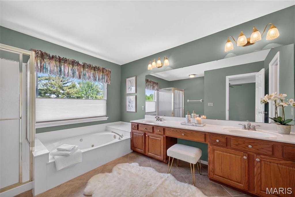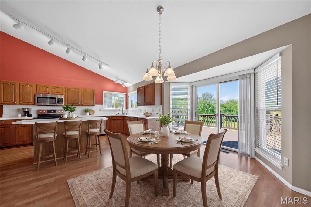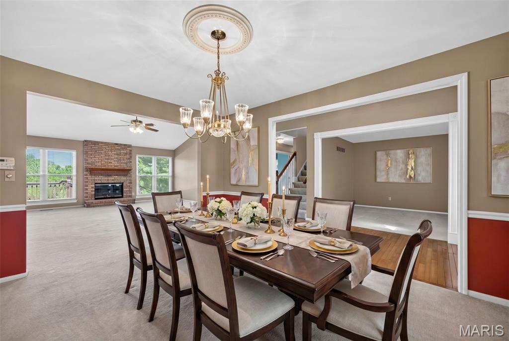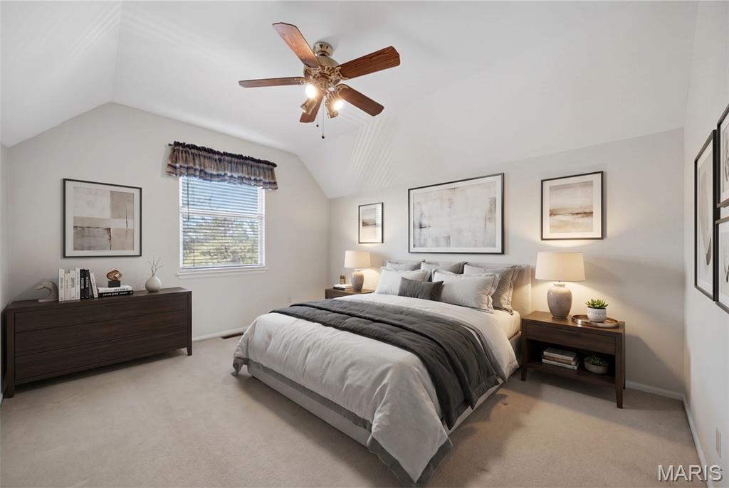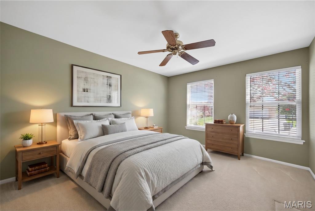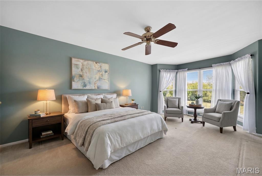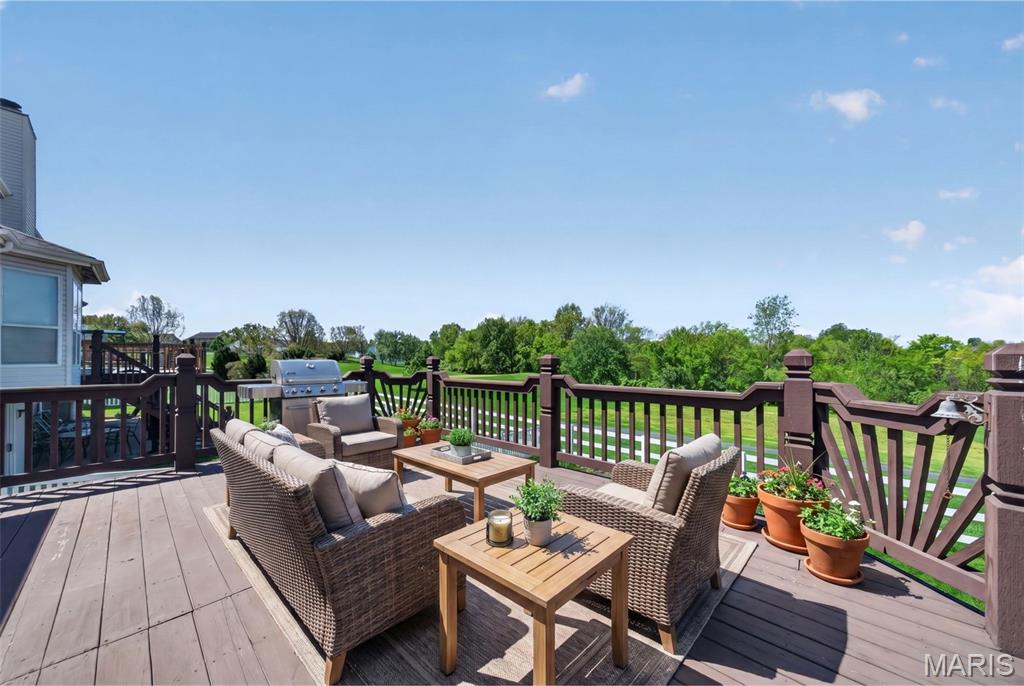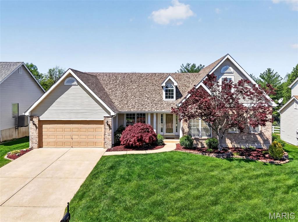 Impeccably maintained, one owner home with an open view of the 17th hole at The Falls Golf Course! This impressive 1.5 Story home offers two bedrooms on the main, 2 bedrooms upstairs and a finished lower level with large rec room, cedar closet, and an Office/Flex Room for a total of 3,679 sq ft of finished living space. The exterior is well cared for with brick, vinyl siding, large covered front porch, two car garage, coach lights, landscaping and lawn irrigation. Features included vaulted Entry Foyer, Den and Dining Room with cased openings, vaulted Great Room with a gas fireplace featuring floor to ceiling brick, a wet bar, Breakfast Room with bay window, main floor Laundry Room, Kitchen with vaulted ceilings, wood raised panel cabinets, Island with seating bar, stainless steel appliances, Bosch dishwasher and tile backsplash. The spacious Primary Bedroom Suite has double door entry and a bay window. There is a shower, soaking tub and a double bowl vanity with a dressing table in the Primary Bath. The roof has newer architectural Shingles, downspouts and facia, all replaced in 2024. Windows along the back of the home in the Kitchen, Breakfast Room, Great Room and Primary Bedroom were replaced in 2024. Residents can enjoy the neighborhood pool and tennis/pickleball courts. There is easy access to Highways 70, 364 and 40/61, shopping, restaurants, parks, services and more. Students will attend desirable Fort Zumwalt schools. Beautiful home, lovely golf course setting, amazing location!