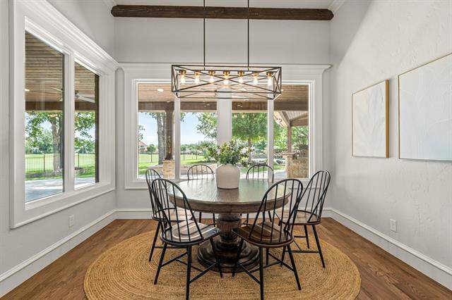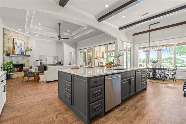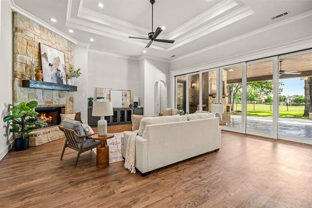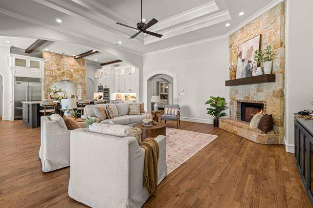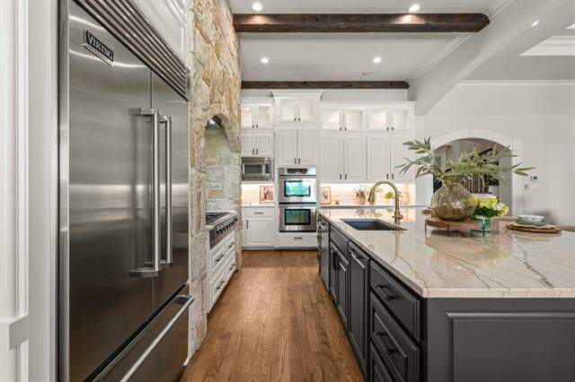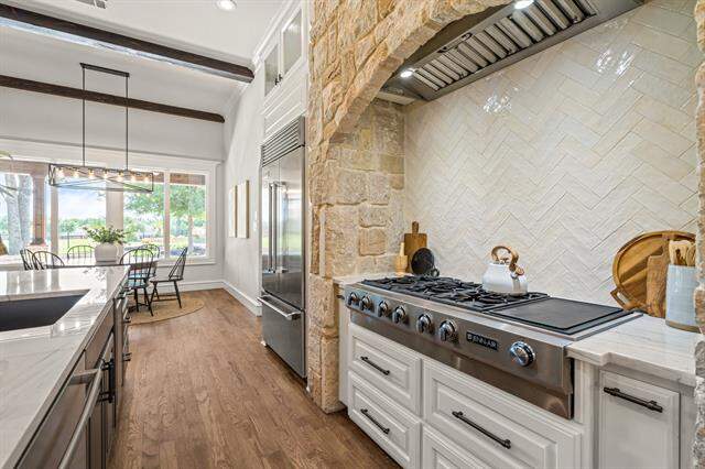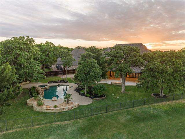 Overlooking the 14th Fairway of Trophy Club's Whitworth Course and nestled at the end of a quiet cul-de-sac in The Knoll (gated), this custom-built 5-bedroom home offers expansive golf course frontage and serene views from nearly every room. Remodeled in 2025-2026, every space has been refreshed with thoughtful design and modern finishes that blend comfort, luxury, and functionality. Refinished hardwood floors, quartzite and quartz counters, updated lighting, new carpet, designer selected backsplash and floor tiles. At the heart of the home, a stunning quartzite-topped kitchen island invites gatherings and conversation, opening seamlessly to the light-filled family room with center-opening sliding doors that frame the outdoor living area and picturesque golf course beyond. The open-concept layout is ideal for entertaining or relaxed weekends at home. Step outside to a spacious covered patio featuring travertine pavers, a gas fireplace, a large firepit, outdoor grilling station and sparkling pool shaded by mature trees-perfect for cooling off on summer afternoons or hosting friends for evening get-togethers. The first-floor primary suite provides scenic views and a beautifully remodeled bath with dual walk-in shower. A private guest room on the main level offers flexibility for visitors. A formal office provides privacy to tackle work from home. Upstairs you'll find three additional bedrooms, a large game room with wet bar, vaulted ceiling media room with stone accent wall, and a generous craft-laundry room featuring a sink, stacked washer-dryer space, and extensive counter space for folding laundry, wrapping gifts, or creative projects. This home blends sophistication and ease of living with timeless finishes, dramatic architecture, and a prime Trophy Club location just moments from award-winning schools, parks, and community amenities. Mechanical updates include a roof (2021), tankless water heater, and two recently updated HVAC systems and central vacuum.
