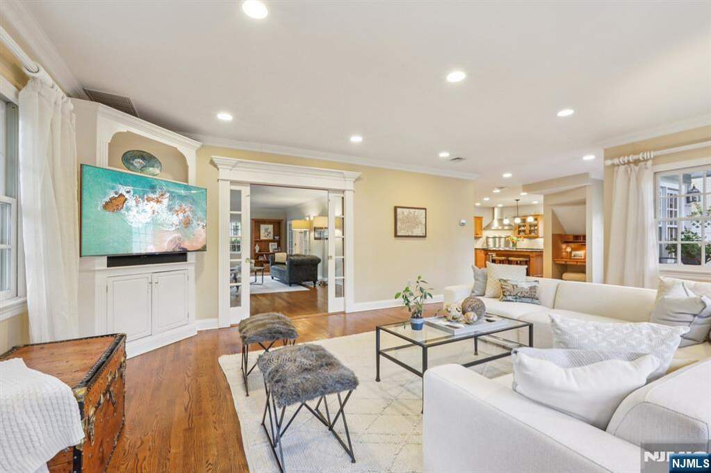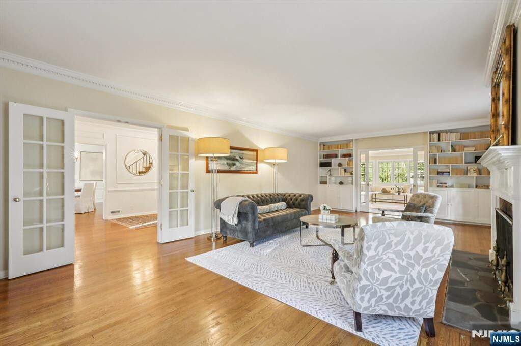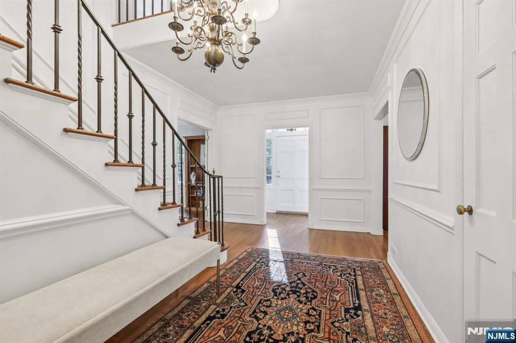 From the moment you arrive, this extraordinary Dutch Colonial impresses with character, craftsmanship, and timeless warmth. Enter the grand foyer and you are greeted by rich hardwood floors, soaring ceilings, and extensive millwork throughout. A wrought iron staircase rises to a sweeping balcony above, a breathtaking first impression. The main level flows beautifully. The spacious living room, anchored by a fireplace and built-ins, connects through pocket French doors to a family room spanning the rear of the home with a windowed wall of views to the backyard greenery. It connects to a sun-drenched eating area off the chef's kitchen, where a center island takes center stage and a back staircase adds easy functionality. A formal dining room and powder room complete the first floor. Upstairs, the primary suite offers a full bath with spa tub, joined by three additional bedrooms, an updated hall bath, and second-floor laundry. The third floor adds two more rooms that function as bedrooms or offices with a full bath. The finished lower level features a rec room, gym, small resistance pool, and mudroom. Outside, the backyard is expansive and lush with mature trees, a sweeping lawn, and a tucked-away fireplace area perfect for cool evenings. Located in one of Ridgewood's most idyllic neighborhoods, just moments from a bustling downtown, great dining, shopping, easy NYC access, and top-ranked NJ schools. This your home sweet home!