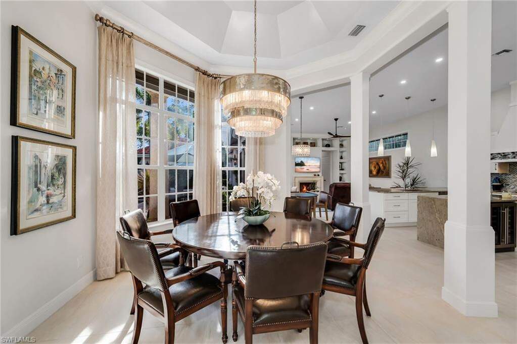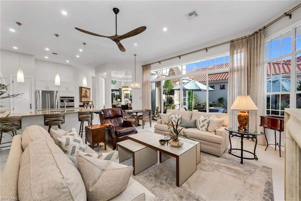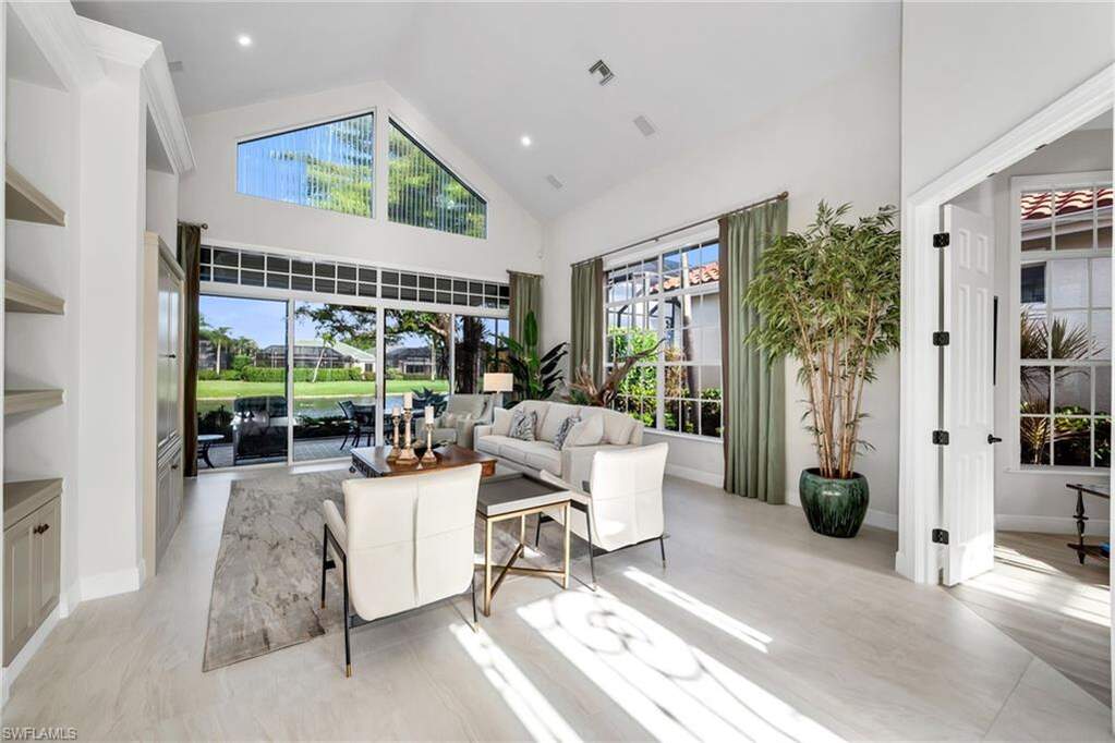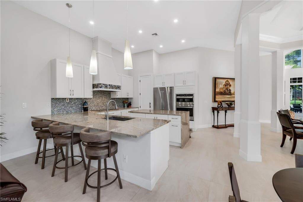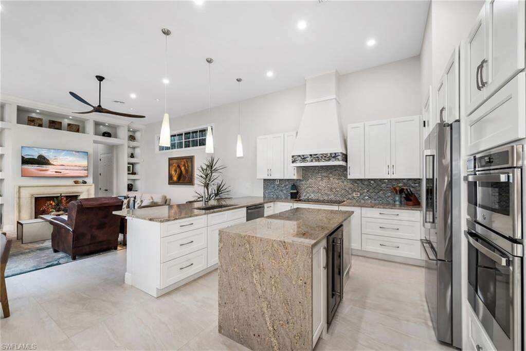Nestled on a paved street in the quaint and highly desirable Mira Lago community-comprised of just 29 homes-this recently updated residence offers a blend of comfort and understated elegance. The tree-lined street is shaded by mature live oaks and surrounded by beautifully maintained homes adorned with vibrant bougainvillea, while the sweet scent of blooming jasmine enhances the neighborhood's charm. Inside, the home features warm, neutral finishes throughout, highlighted by expansive 36" x 36" porcelain flooring in the main living areas and primary bedroom. The thoughtfully designed kitchen showcases custom cabinetry, a spacious island with waterfall quartz countertops, and premium appliances including a Bosch refrigerator, Thermador cooktop, and GE Profile double oven with microwave combo. Additional features include a GE front-load washer and dryer, a private driveway, and inviting pool area ideal for outdoor enjoyment. The roof was replaced in 2021, offering added peace of mind. Experience all that Bonita Bay Community offers with a new beach facility on the Gulf, 3 parks, miles of walking and jogging paths, pickleball, playgrounds, access to a private marina and restaurant and more. Optional memberships are available at the Bonita Bay Club featuring the finest club lifestyle available with the Bonita Bay Club's dining, five 18-hole golf courses, tennis, pickleball, fitness and spa facilities.