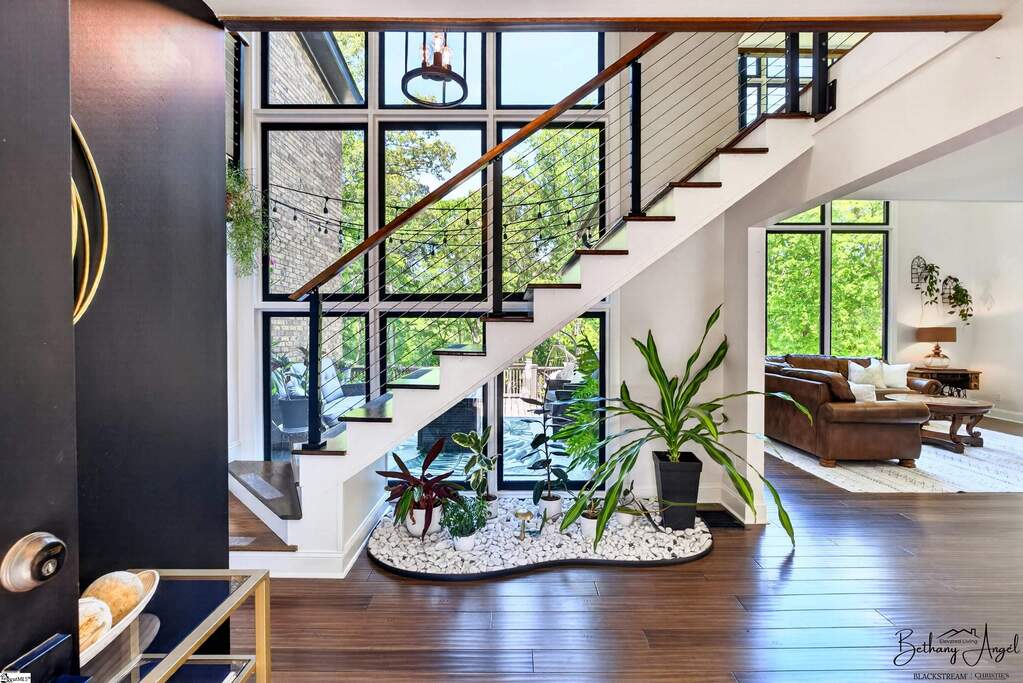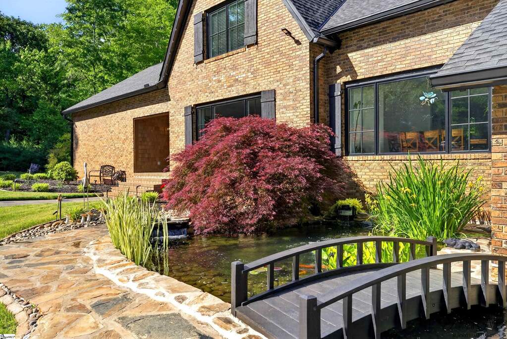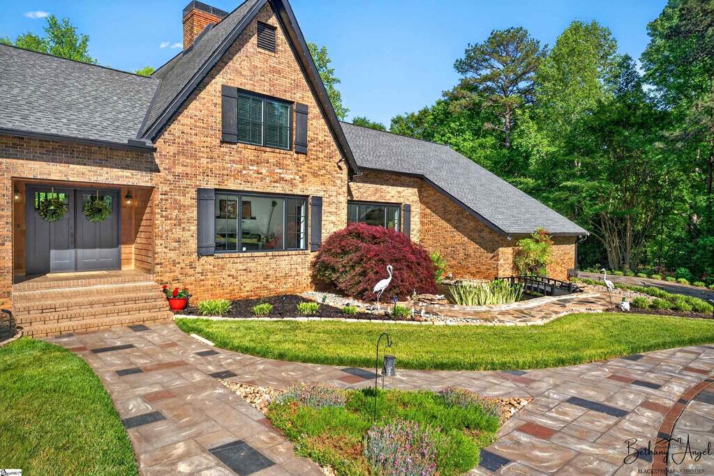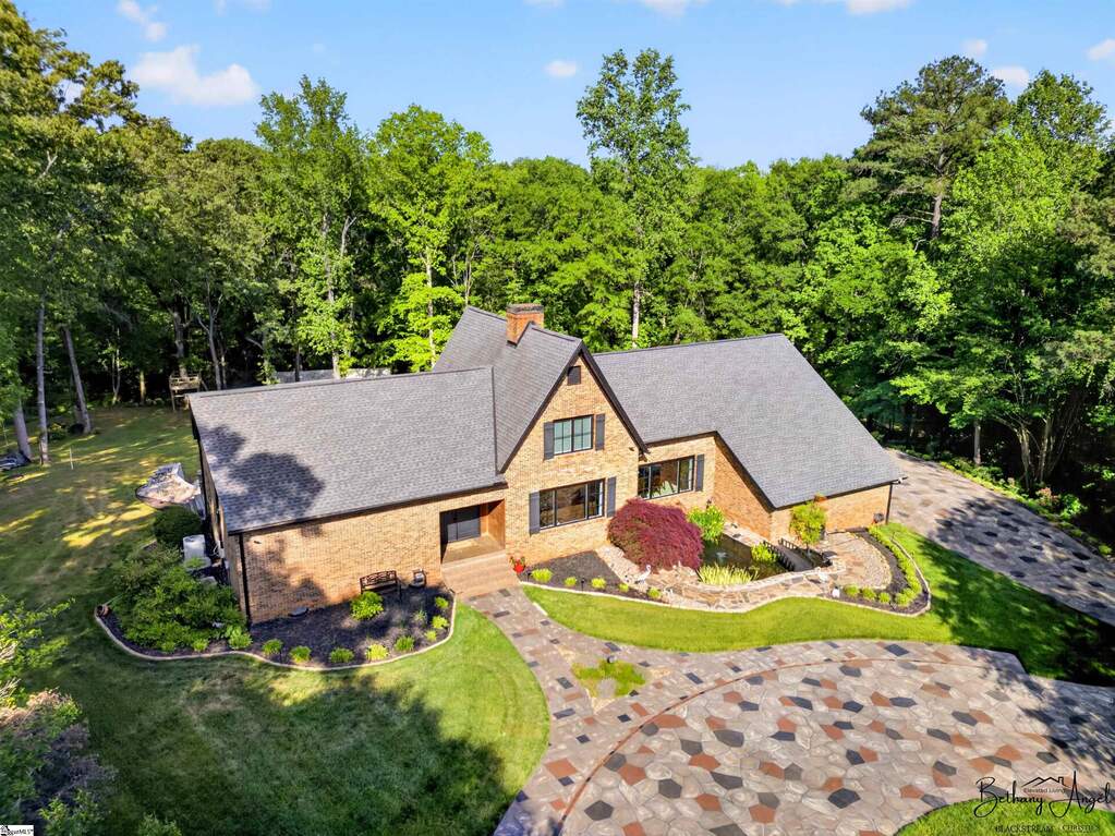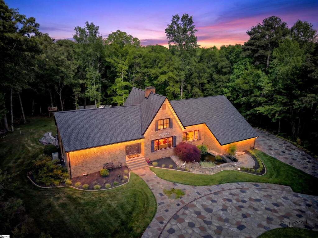 Set along the banks of the Middle Tyger River in the Twin Lakes community, this all-brick estate offers a rare blend of privacy, presence, and natural beauty-tucked at the end of a quiet cul-de-sac on a wooded homesite. An artisan finished circular drive creates a graceful arrival, framed by manicured grounds and a tranquil koi pond. Inside, double doors open to a dramatic two-story foyer where soaring ceilings and natural light immediately set the tone-elevated, yet welcoming. The main level unfolds with intention. A piano sitting room transitions seamlessly into a formal dining space, guiding you into a chef's kitchen appointed with expansive granite surfaces and a sunlit breakfast nook overlooking the landscape. Just beyond, the great room captivates with walls of windows and a striking brick gas fireplace-offering both scale and warmth. A main-level primary suite provides a private retreat, featuring dual vanities, a walk-in rain shower, soaking tub, and generous closet space. Upstairs, four spacious bedrooms and two full baths offer flexibility for family and guests, connected by a beautifully designed cable rail staircase. The walk-out lower level expands the home's livability, with a second primary suite, a cozy den anchored by a brick fireplace, and dedicated spaces for fitness and entertaining. Outdoors, the experience becomes truly special. Hammocks sway beneath mature trees, wildlife moves quietly through the landscape, and evenings invite gathering-whether around the patio fire or down by the river's edge. A tree fort and workshop add a sense of character and discovery, creating a setting that feels both grounded and unforgettable. A home defined by space, light, and a connection to nature-crafted for both everyday living and lasting moments.