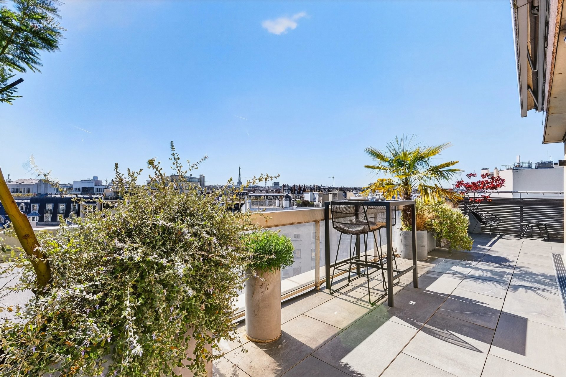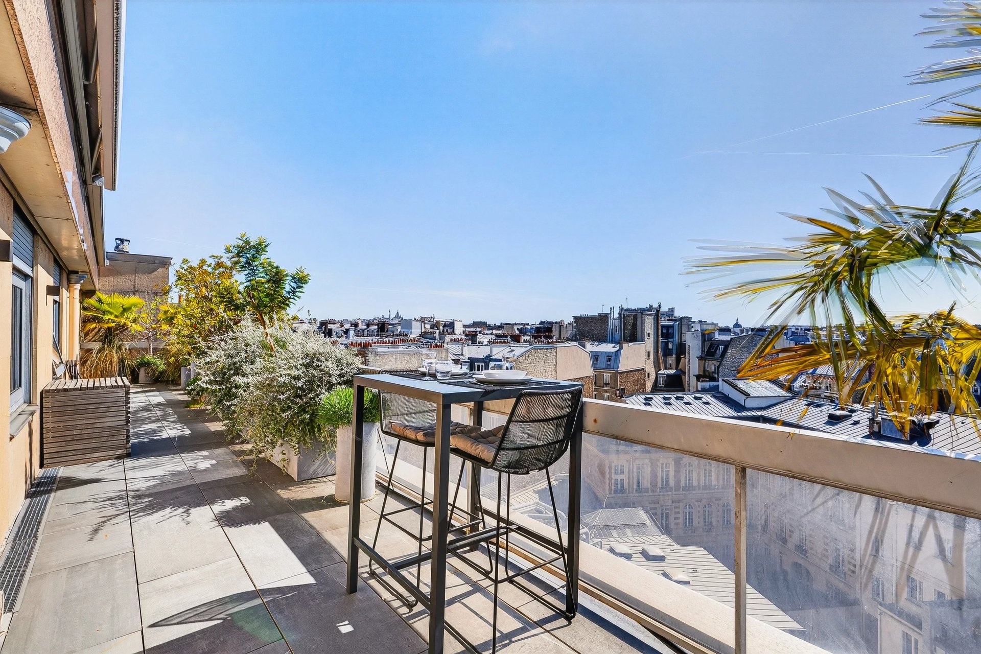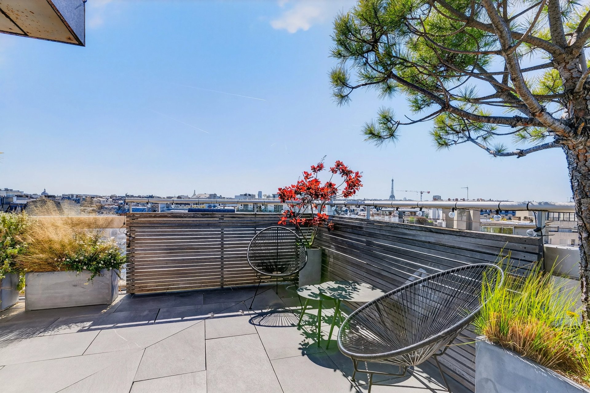The landscaped terrace surrounds the apartment and offers spectacular views over the rooftops and the most beautiful monuments of Paris.