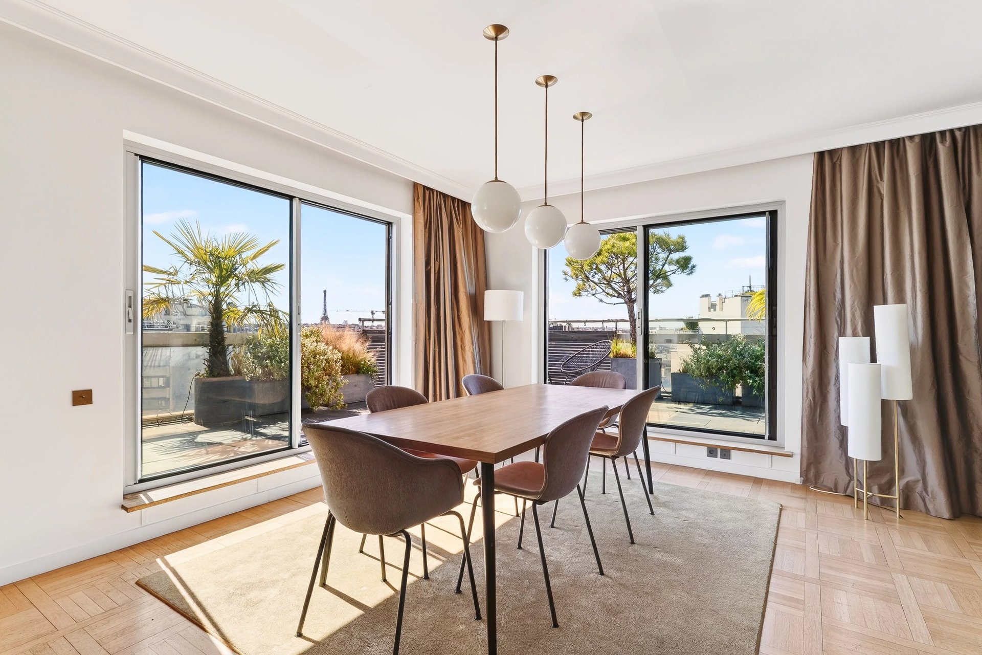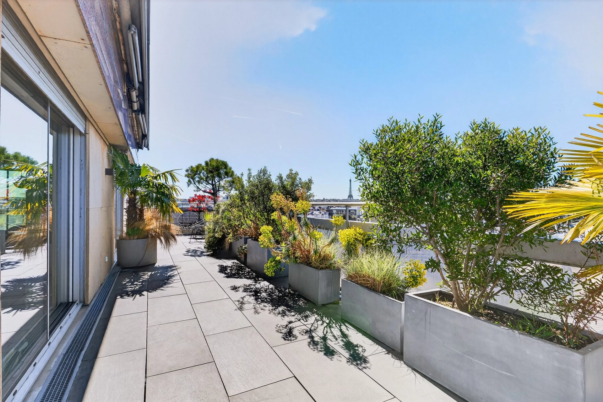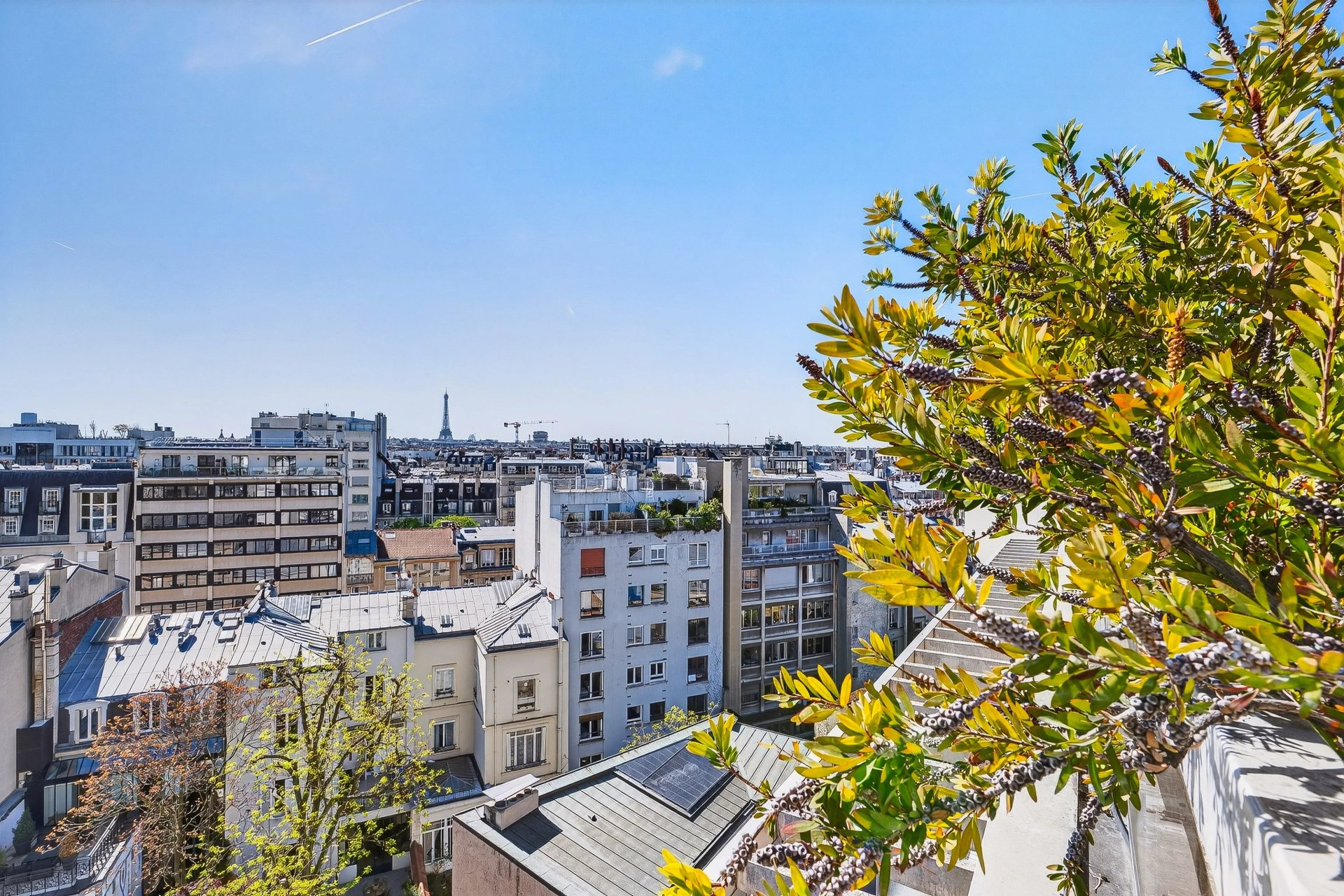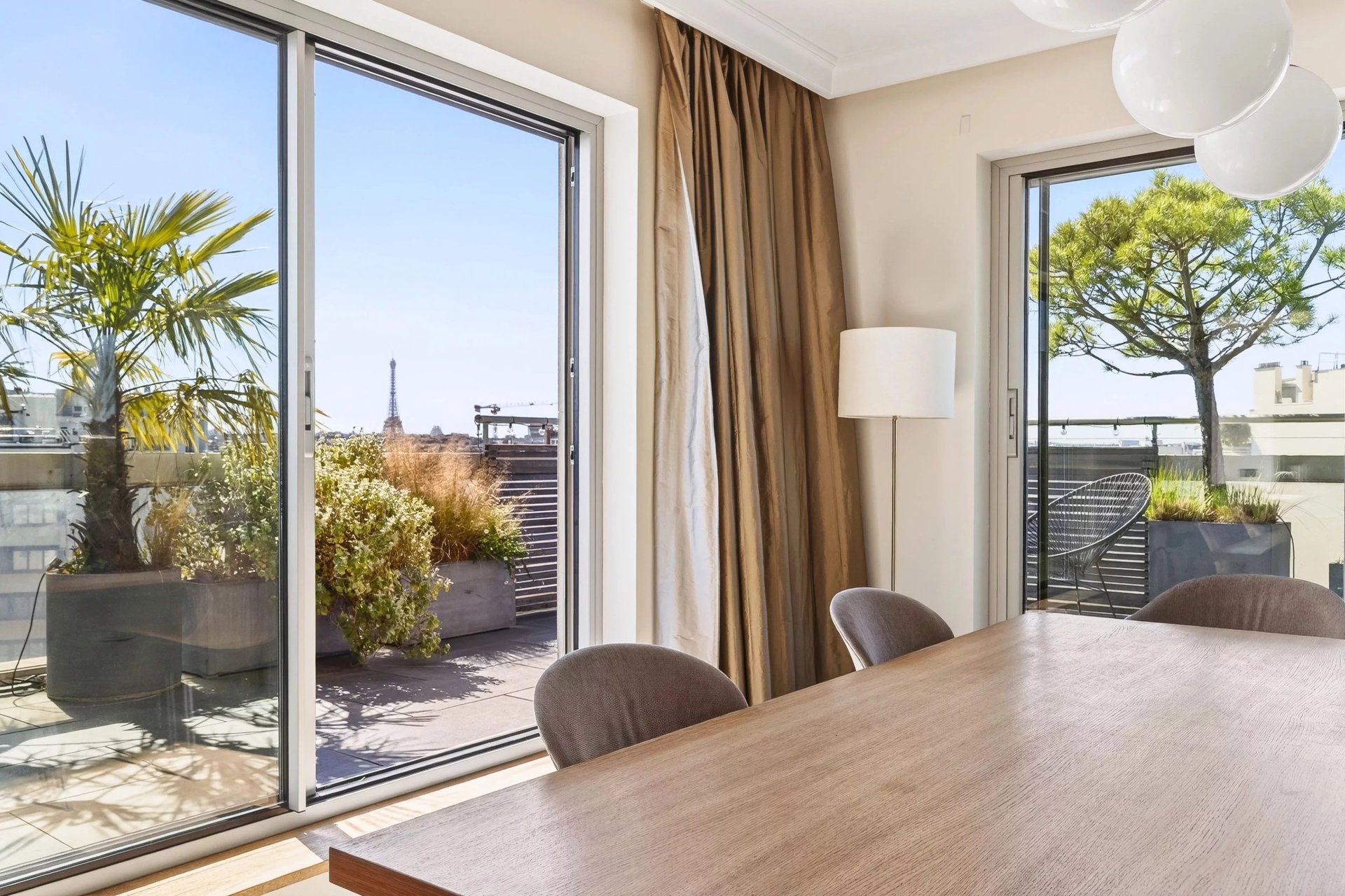 The landscaped terrace surrounds the apartment and offers spectacular views over the rooftops and the most beautiful monuments of Paris.