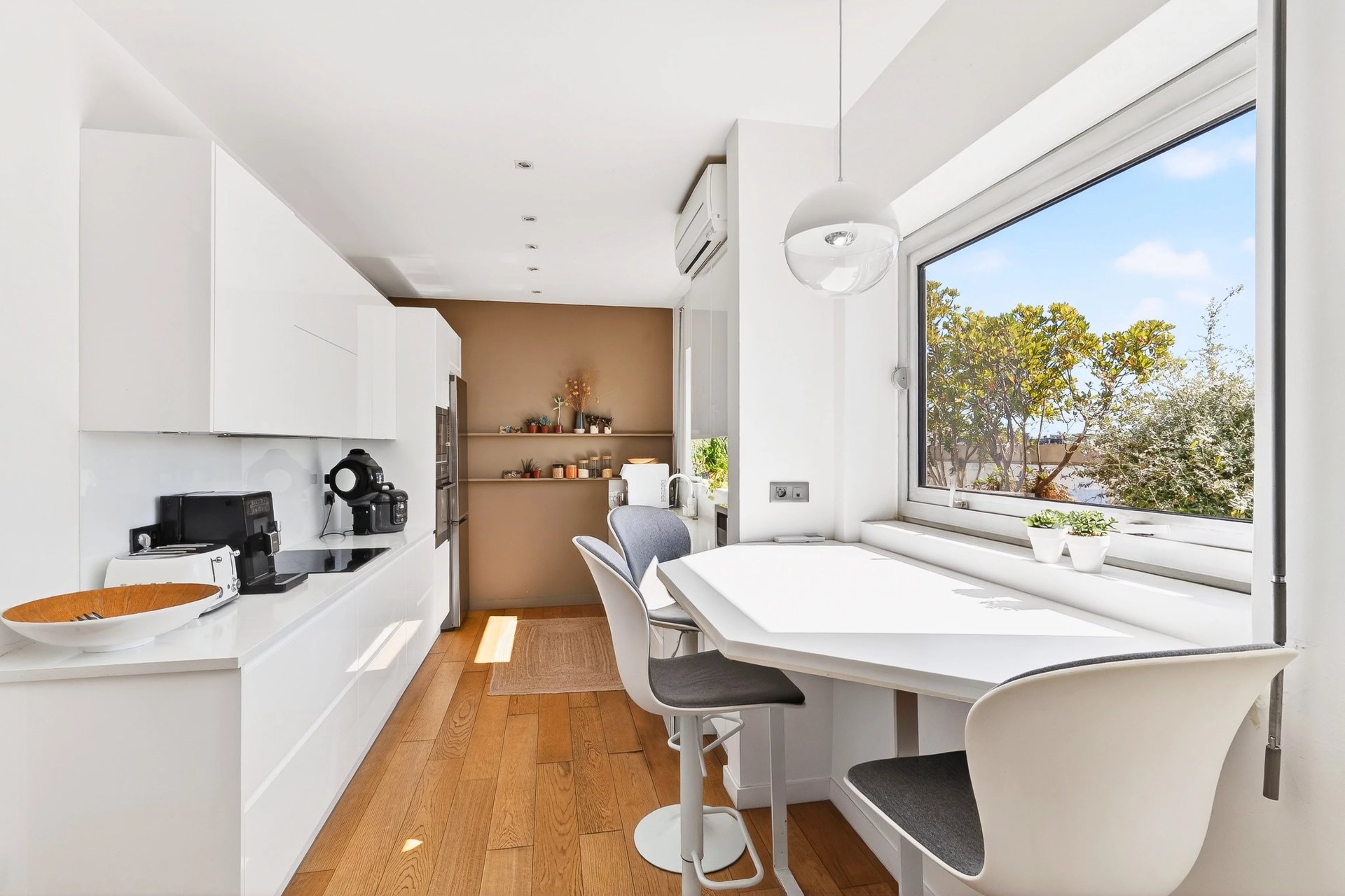 The elevator leads to the 7th floor, and the main staircase continues to the eighth. The apartment, the only one on this floor, comprises: an entrance hall, a spacious double living room surrounded by French doors with direct access to the terrace, an adjoining fully equipped kitchen, a guest toilet, a master suite with dressing room, bathroom, toilet, a study and a second bedroom with its own shower room, and a laundry room.
