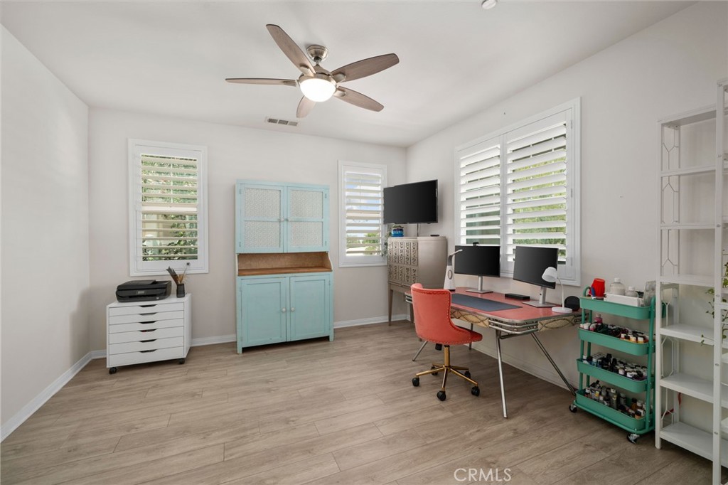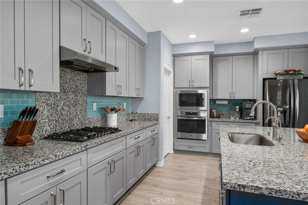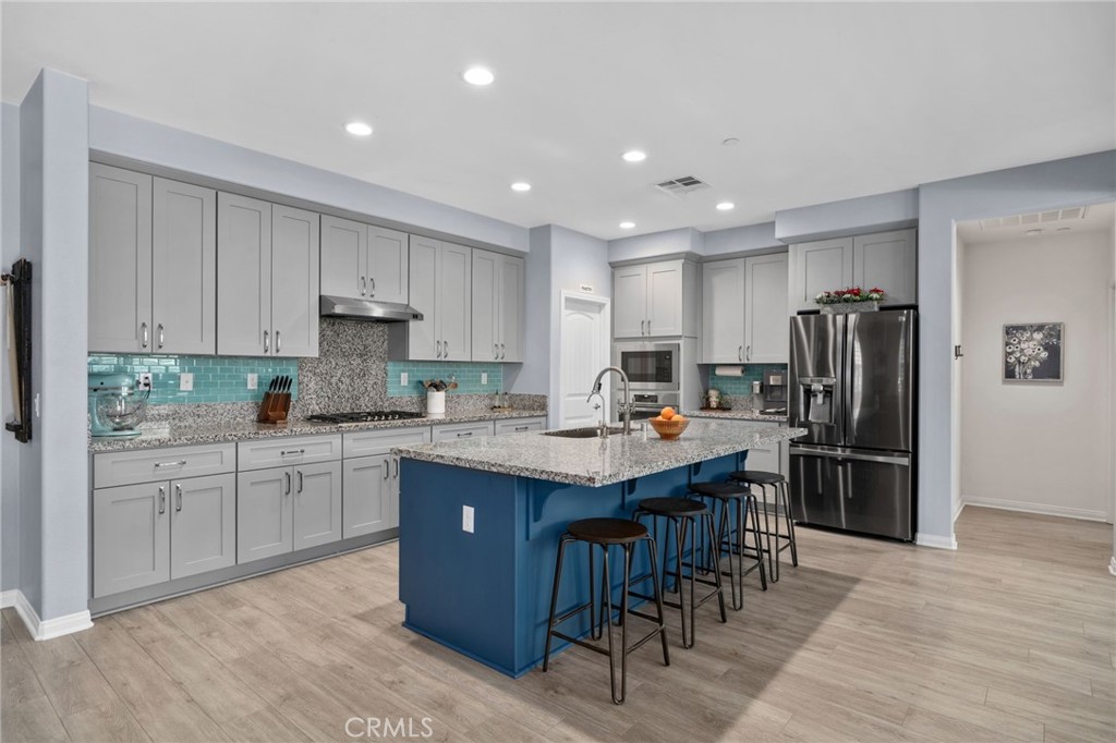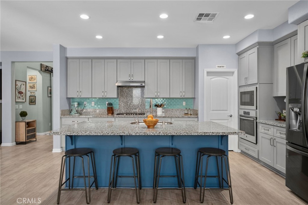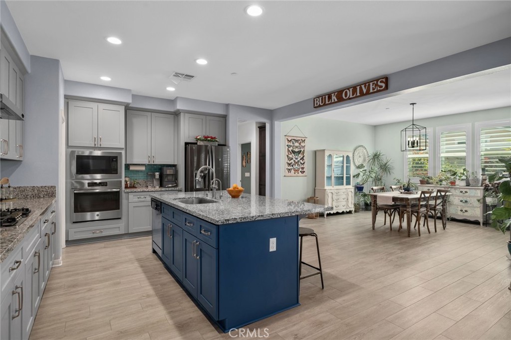 Beautiful two-story home in the desirable city of Redlands offering 4 bedrooms and 3.5 bathrooms with an open-concept floor plan. The gourmet kitchen features a large center island with granite countertops, newer cooktop, custom tile backsplash, and a walk-in pantry seamlessly flowing into the main living area with a cozy fireplace. Highlights include vinyl plank flooring downstairs, newer carpet upstairs, and plantation shutters throughout. The main level also offers a den/office with custom barn doors, a downstairs bedroom with private en-suite bath ideal for guests or multi-generational living and a convenient half bath. Upstairs includes a versatile loft, two secondary bedrooms with a Jack & Jill bathroom, laundry room with sink, and a spacious primary suite with dual sinks, separate tub and shower, vanity area, and walk-in closets. Step outside to your own private retreat featuring a saltwater pool and spa, covered patio, and a lush garden filled with vibrant plants and flowers creating a serene, tranquil escape. Solar panels, including 32 additional panels added by the sellers, help offset energy costs, along with a 3-car tandem garage. A perfect blend of style, comfort, and resort-style living.