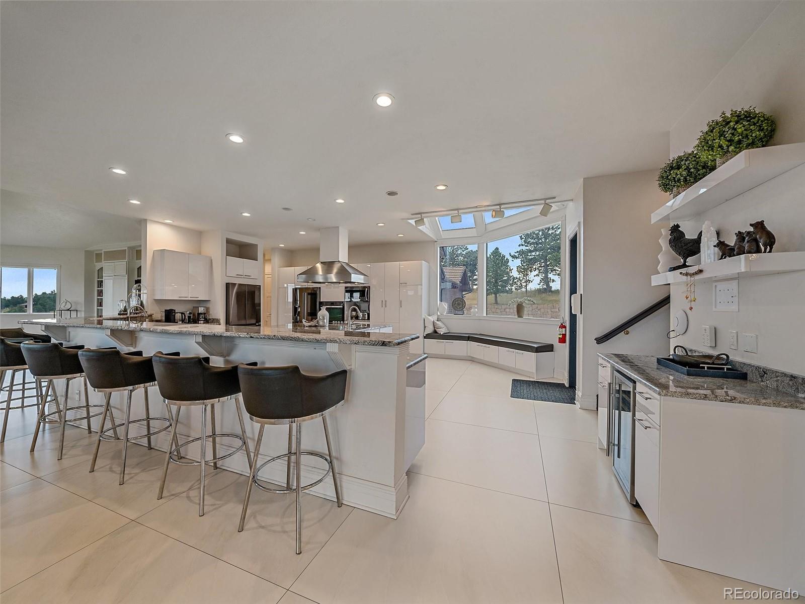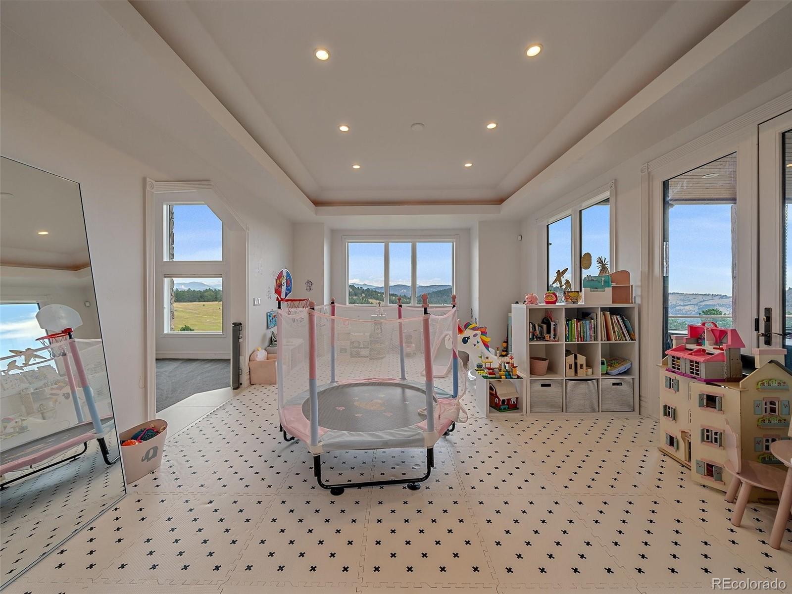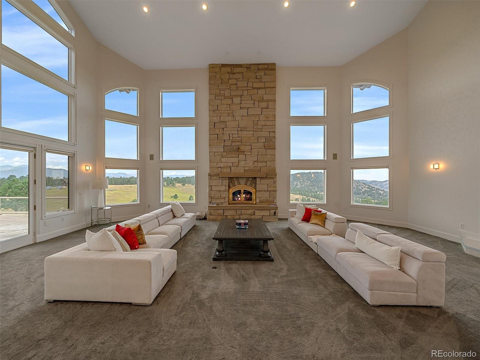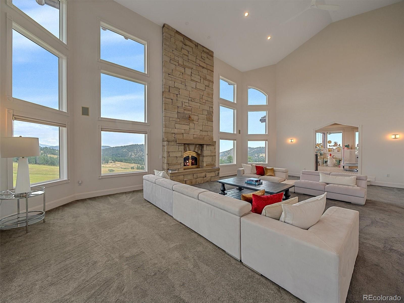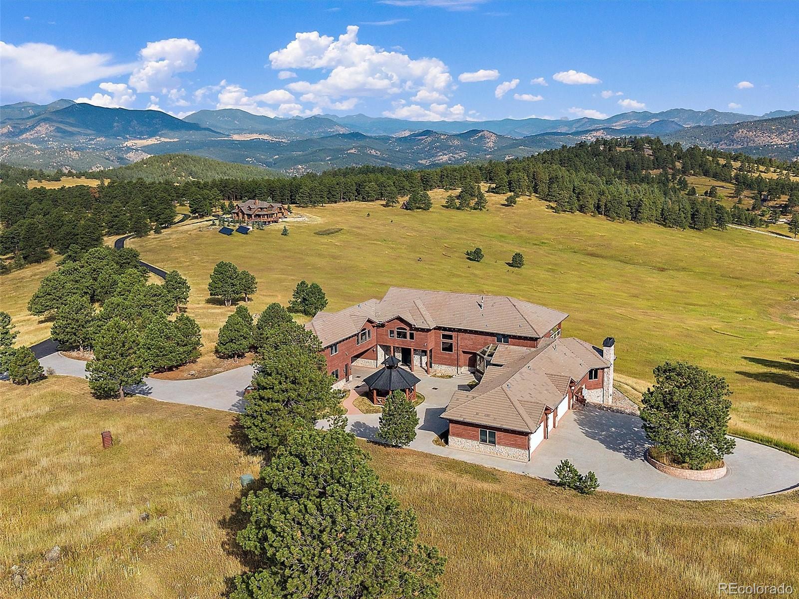 Set on over 70 gated acres with sweeping views of mountains and open meadows, this exceptional estate offers privacy, scale and versatility just minutes from conveniences and access to Highway 285. With more than 13,000 square feet of living space, the home is designed for both comfortable daily living and large-scale entertainment. Extensively updated since 2020, the residence features a remodeled kitchen equipped with dual dishwashers, ovens, and refrigerators, along with beautifully renovated bathrooms, new flooring, and refreshed exterior paint. Radiant in-floor heating runs throughout, providing year-round comfort. The thoughtfully designed layout includes five bedrooms, ten bathrooms, five of them ensuite - along with two private offices, two laundry rooms, multiple family rooms, and a wine cellar. Private, detached office space with a half bath is conveniently located near the front driveway. Expansive decks and large windows throughout the home capture the surrounding natural beauty from nearly every vantage point. Equestrian enthusiasts will appreciate the impressive facilities, including a 14,000 plus square foot indoor arena, workshop and extensive barn space. Agricultural zoning is maintained through annual haying, offering potential tax benefits and flexibility of use. Modern infrastructure complements the rural setting, with a comprehensive mesh Wi-Fi system across both the home and barn, as well as a fiber optic connection between structures. Ideally located near Evergreen Colorado and Kittredge, the property combines peaceful mountain living with easy access to Denver and year-round recreation. Minutes from Mount Falcon open space for hiking, biking and horseback riding.