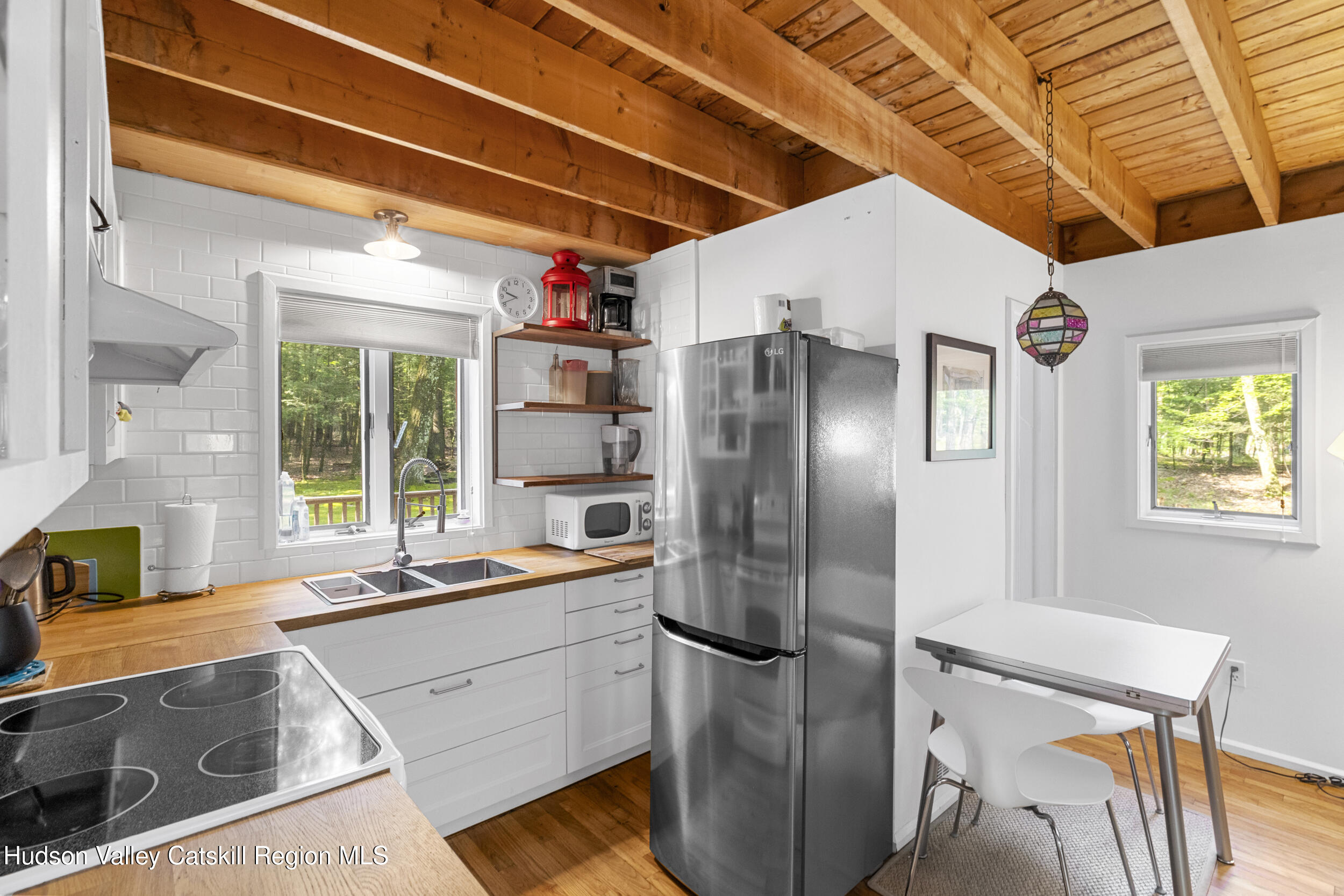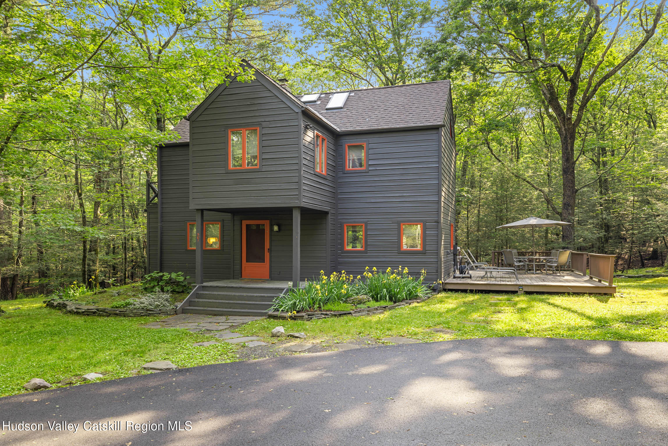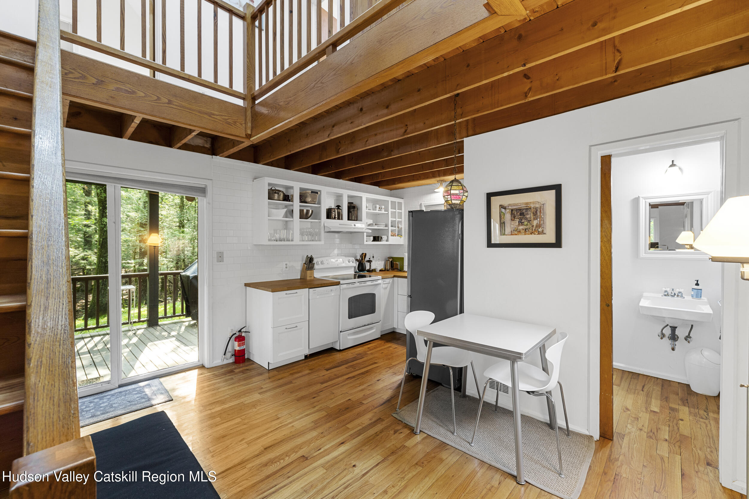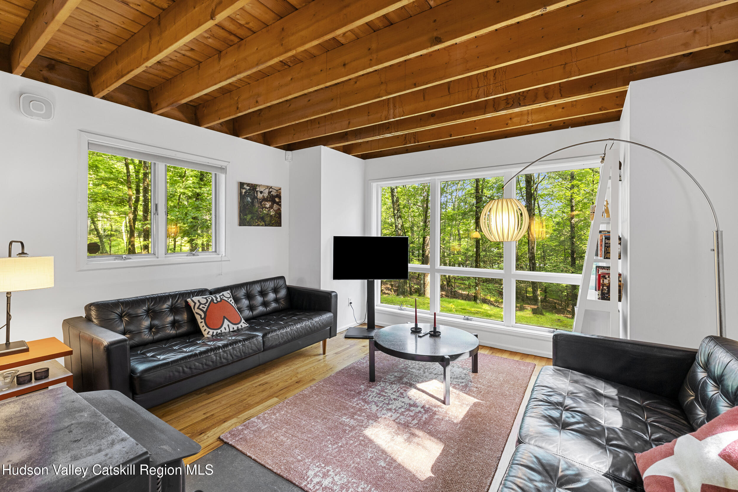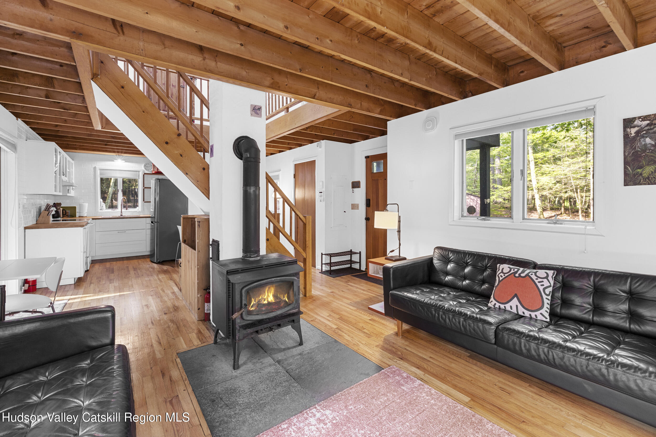 Discover your Upstate sanctuary in this contemporary 3-bedroom, 1.5-bath gem on Ohayo Mountain Road. Nestled in wooded bliss on 1.8 acres and bordering vast protected state land, this home delivers a rare sense of peace and enduring natural beauty. Gleaming hardwood floors, a cozy wood-burning stove, and an open-concept floorplan perfect for modern living. Step outside to your private deck, ideal for entertaining or simply soaking in the tranquil forest surroundings. Less than 20 minutes from the vibrant charm of Woodstock, Phoenicia, and Kingston, and under 30 minutes to the Rhinecliff train station for seamless access to the city, this haven is a dream for nature lovers, creatives, or anyone seeking peace of mind. Your cozy, nature-embraced escape awaits. Schedule a tour soon!
