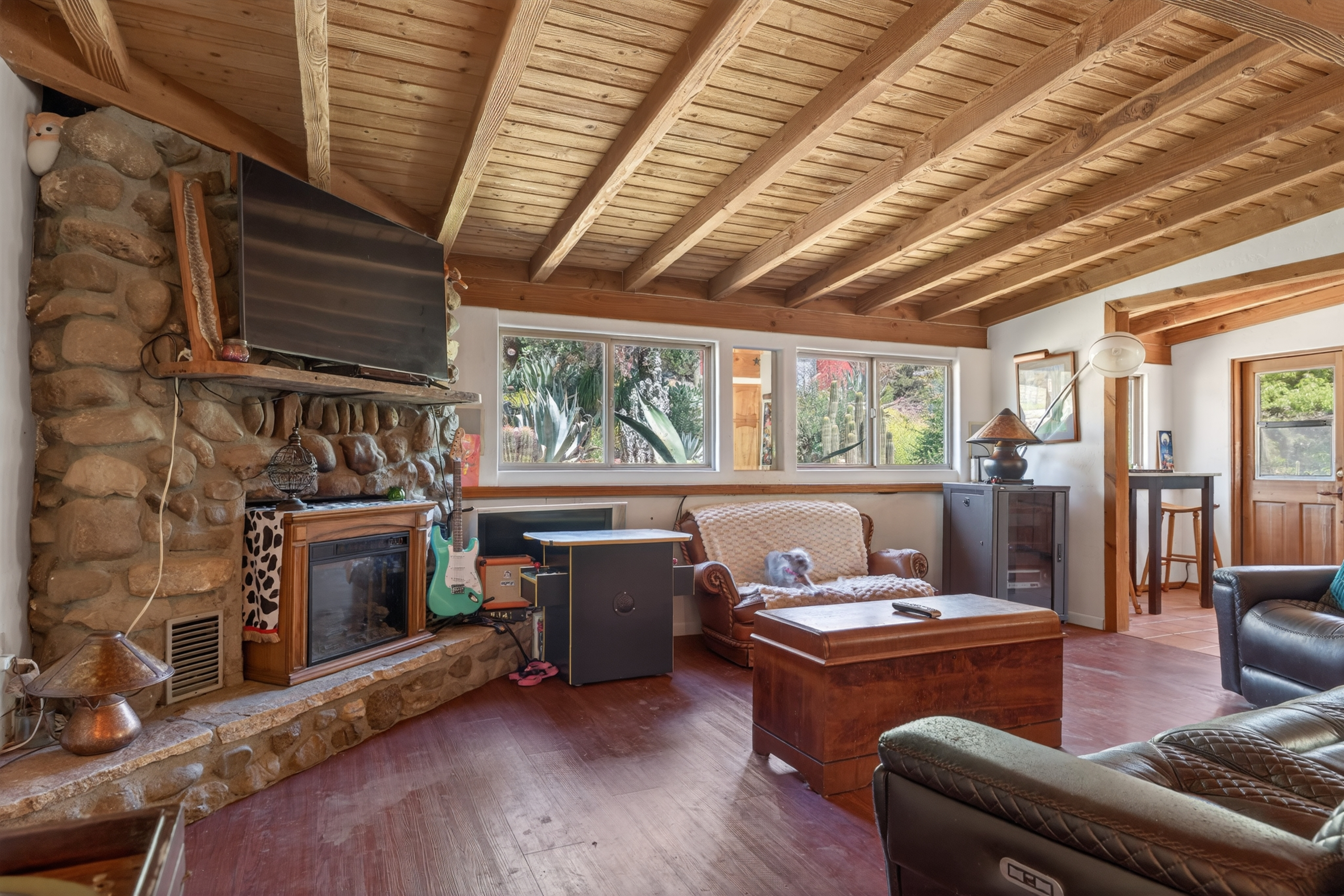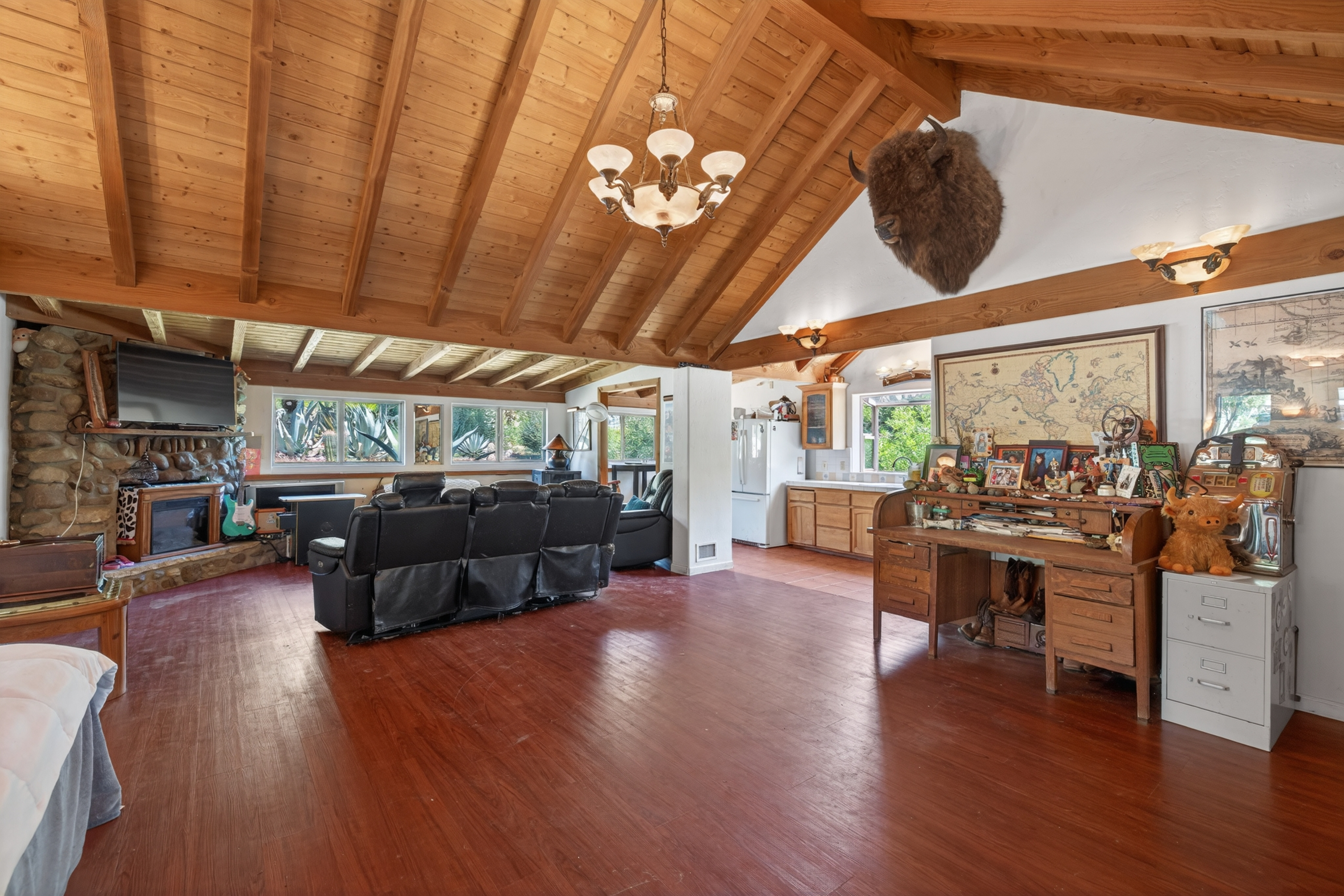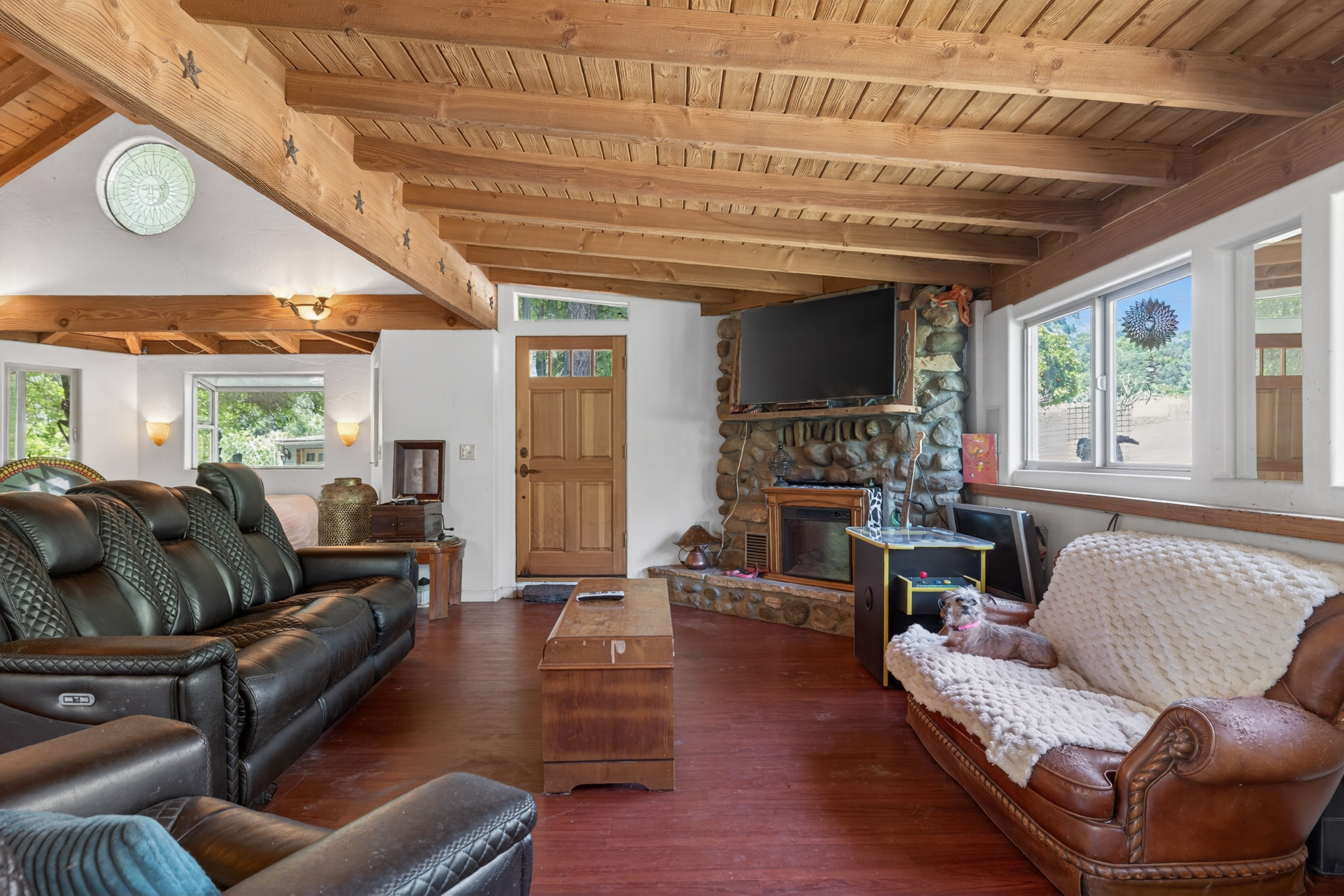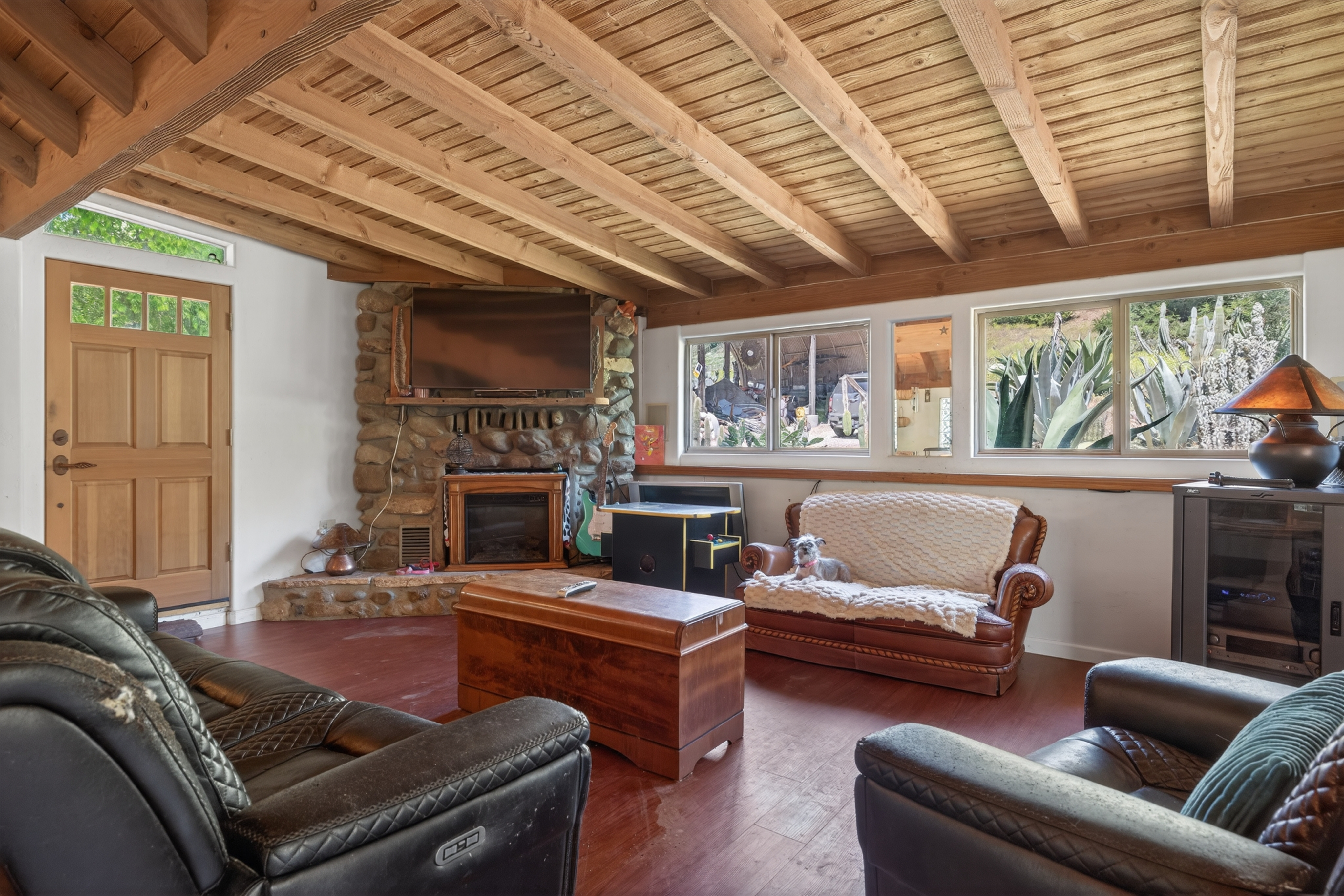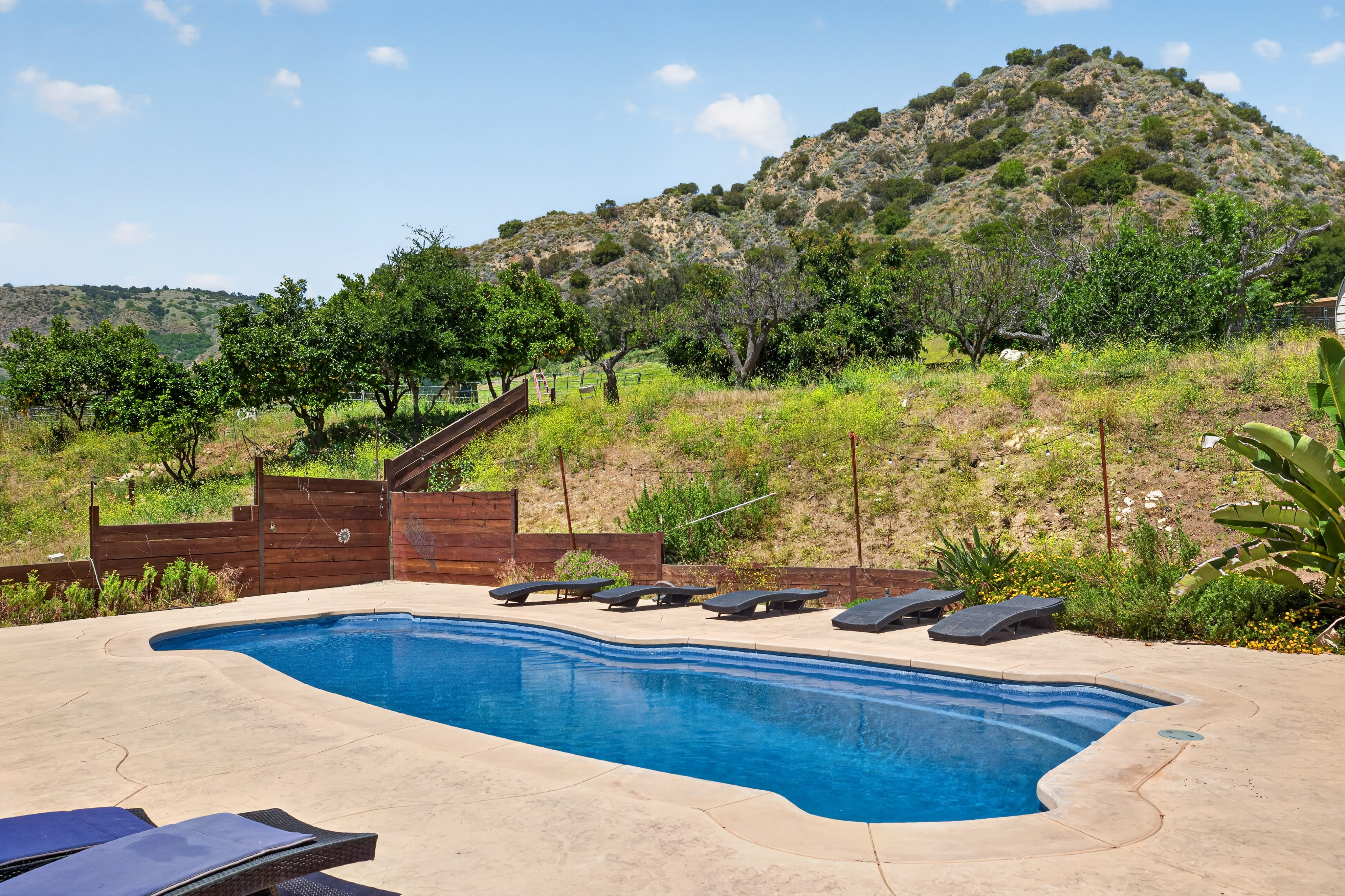 Step into your private oasis with your own secluded rural ranch that has sweet bird sounds and its very own beautiful mountains to explore, surrounded by 5000 of unspoiled natural acres! You can cruise on your ATV or hike on your private trails with 2 creeks and enjoy the views from the the mountain tops or pick fruit from your own orchard, including lemons, tangelos, oranges, pomegranate, avocados, pears, walnuts and more! The 1 bedroom 1 bathroom cabin was fully rebuilt in 2005 has built in wood bedroom drawers, dual pane windows and the original floor plan had 2 bedrooms but one is a deck now. This home is surrounded by tall shade trees and has a water filtration system and reverse osmosis drinking water, gorgeous vaulted ceilings, a huge guardian Bison on the wall and lovely stained glass window in living room. Enjoy the family by having a pool party, where you can catch the rays, take a dip in your pristine private pool or roast marshmallows around the out door fire pit. There are several other out buildings that could be converted into guest homes or ADU'S, workshops or office space or house more farm equipment. This ranch also comes with a huge 3500 sf barn that has one car lift and could be used to store your private plane, farm equipment or 8 cars an RV and can be converted to a horse stable and house your live stock. The ranch is fully fenced around the perimeter and has cross fencing to divide pasture area from buildings and has a solar powered double gated entry for added security. Live you best private life here on this very special ranch!