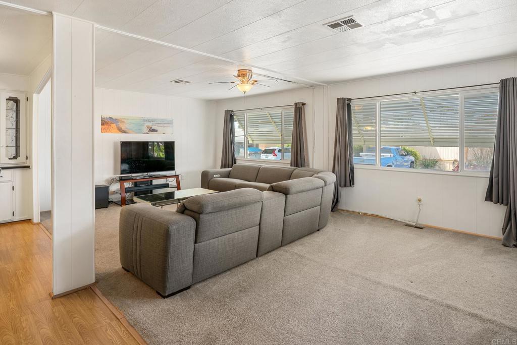 AMAZING 1440 sq ft home in 55/45 mobile home community approx 4 miles from beach. NO PROPERTY TAX!! Low space rent of $575 and on RENT CONTROL. This delightful 2bed/2bath features beautiful upgrades and fantastic location. Dual pane windows, laminate flooring plus carpet in bedrooms, separate living room and family room/den. Fabulous kitchen with granite countertops and kitchen peninsula, stainless steel refrigerator with bottom freezer, dishwasher, built-in microwave, large pantry and garbage disposal. Bright rooms with beaming sunshine and ocean breezes, good-sized built-in china cabinet in dining area, and nice washer and dryer in laundry room. 3 ceiling fans, mirrored closet doors, ample closet space throughout home, Granite countertops in both bathrooms, newer toilets, plus linen storage and ceramic tile floors in each bathroom. Very charming. Outside you will find a concrete driveway for 2 cars, a massive Tuff Shed with loft shelving, absolutely fabulous curb appeal. Lush landscaping with palms, roses, honeysuckle, birds of paradise and an enclosed backyard with pavers to create an awesome patio. Completely private, serene and peaceful with birds and butterflies to complete your outdoor paradise. Powerful A/C. Vinyl fencing in some areas. Spacious front porch with trex steps, trex flooring and great railing. CA room provides an additional 144 sq ft of space and can be used as a workout room, craft area, additional sitting/guest area, or office. The community provides a plethora of activities, such as celebratory parties, brunches and lunches, pickleball on the tennis court, 2 swimming pools, spas, 2 clubhouses, and fun, friendly neighbors. Your 4-legged family members will love it here and you may have 2 pets, with some size and breed restrictions. Nice level streets make walking enjoyable and easy. This desirable community is close to everything, grocery stores, restaurants, post office, banks, the I-5, the 101 plus the Harbor, the Pier, the Strand, farmer's markets, street fairs, and all sorts of new eclectic shops, craft breweries, coffee spots, and fun resale and vintage consignment shops. Oceanside is the last affordable beach town in San Diego, and this is a very affordable home with generous sized rooms, superb location and low space rent. Look no further!! This is it!