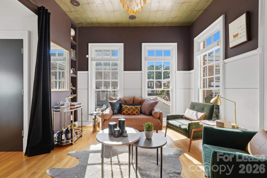 Situated in the heart of Dilworth, this end-unit townhouse offers an exceptional opportunity within one of the neighborhood's most coveted and walkable enclaves. Originally reimagined by designer Scott Carpenter, the home spans four levels with soaring ceilings, an open iron staircase, and an incredible backyard patio. A grand two-story foyer welcomes you inside, leading to the fully updated, showstopping speakeasy lounge, complete with custom display shelving, stylish wallpaper, and elegant lighting. The chef's kitchen features a stainless-steel appliance suite, stone countertops, and barstool seating. A dramatic three-story dining area and a living room anchored by a gas fireplace, wet bar, and built-in cabinetry complete the main level, with seamless access to the backyard. Upstairs, the primary suite offers custom wood-paneled walls, a private balcony, and a spa-inspired bath with sauna shower, and a custom built-in open closet area. Two additional ensuite guest bedrooms provide well-appointed accommodations, each with ensuite bathrooms, custom closet systems, and high-end finishes throughout. The lower level features a fourth bedroom, a full bath, and a private home theater with a 70" television and theater chairs. Additional areas include a dedicated fitness room, two garages, and a spacious attic on the fourth level. The outdoor living experience is truly exceptional. A fully fenced and gated stone patio with professional hardscaping and landscaping creates a private sanctuary designed for year-round enjoyment. The built-in Lynx grill station is ideal for alfresco dining, while a serene pond with an integrated water fountain adds a tranquil ambiance. Gather around the gas fire feature lounge area on cool evenings, or stay cool in the warmer months with the dedicated cooling and misting fan. Ideally positioned just minutes from Uptown Charlotte, South End, and Midtown, this home offers effortless access to the city's top dining, boutique retail, and major roadways. Families will appreciate proximity to some of the area's most sought-after public and private schools, making this a rare offering that delivers on both lifestyle and location.