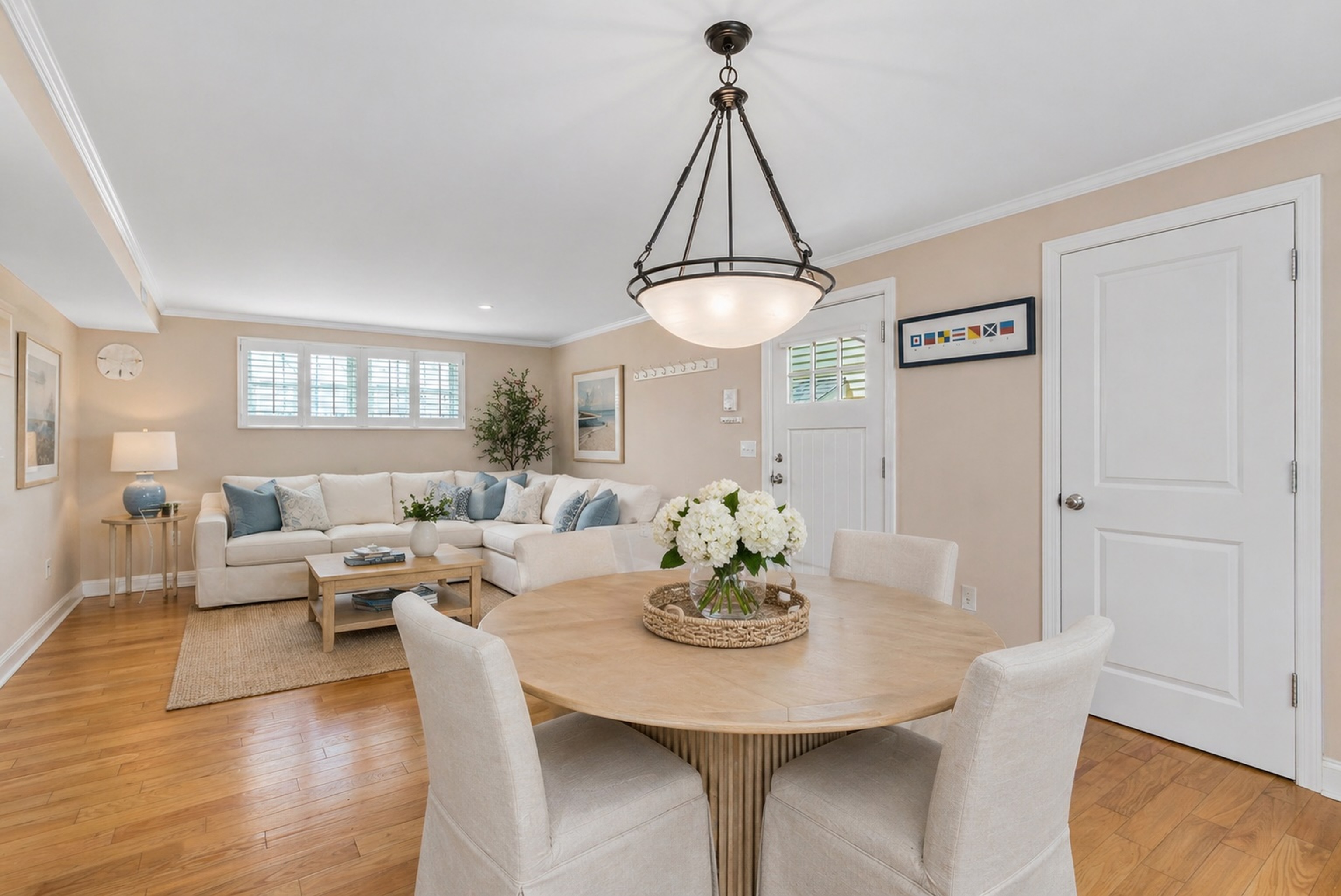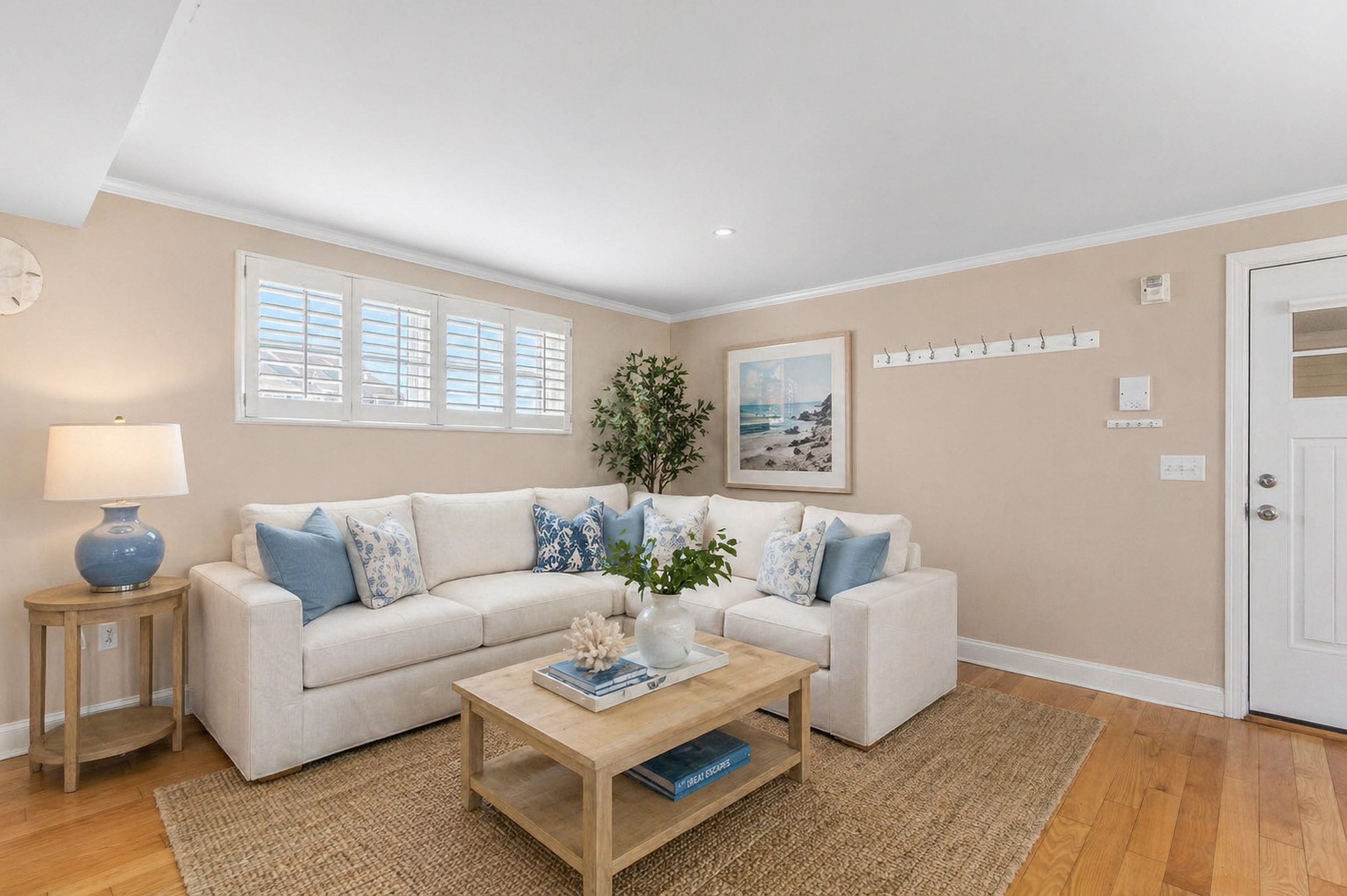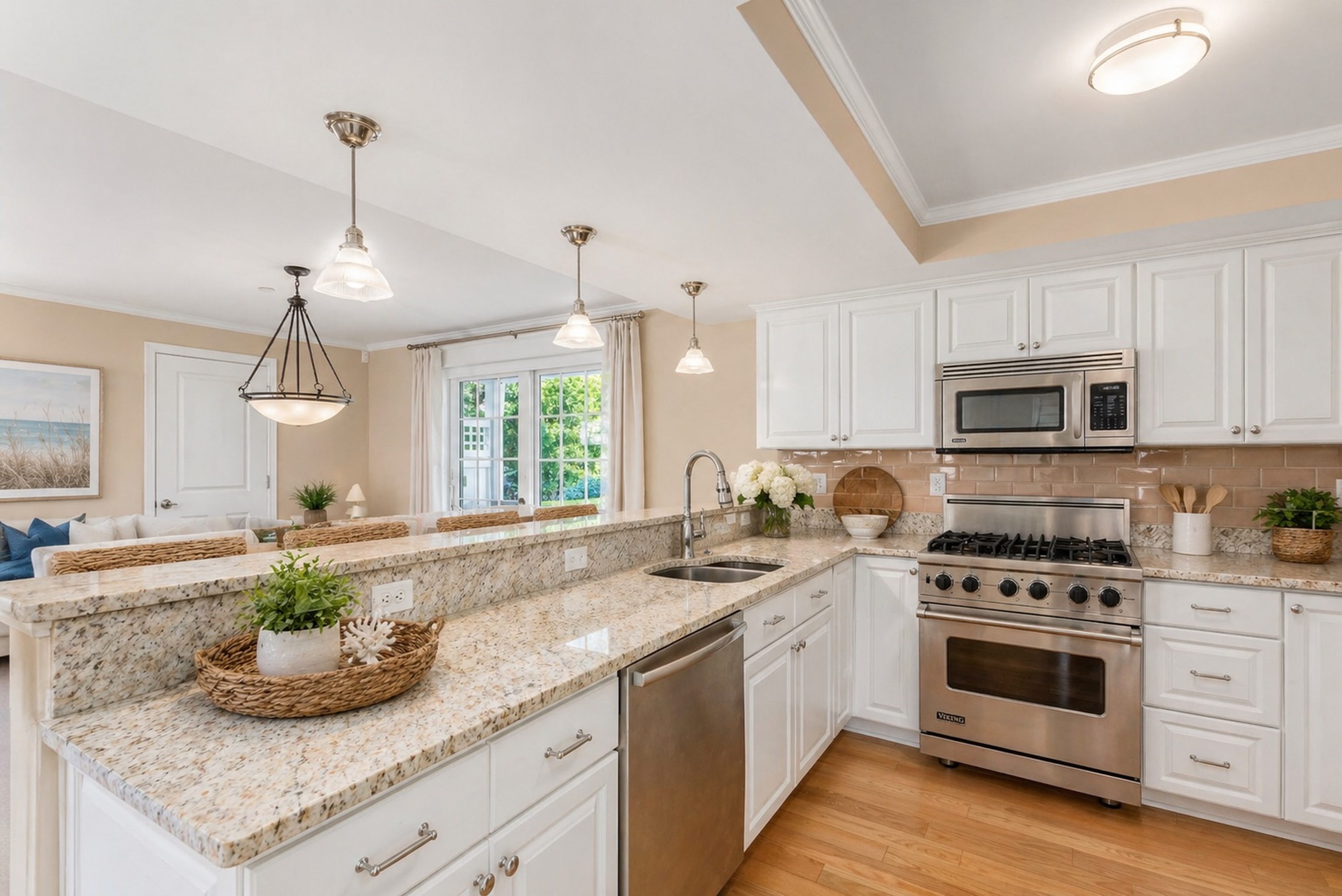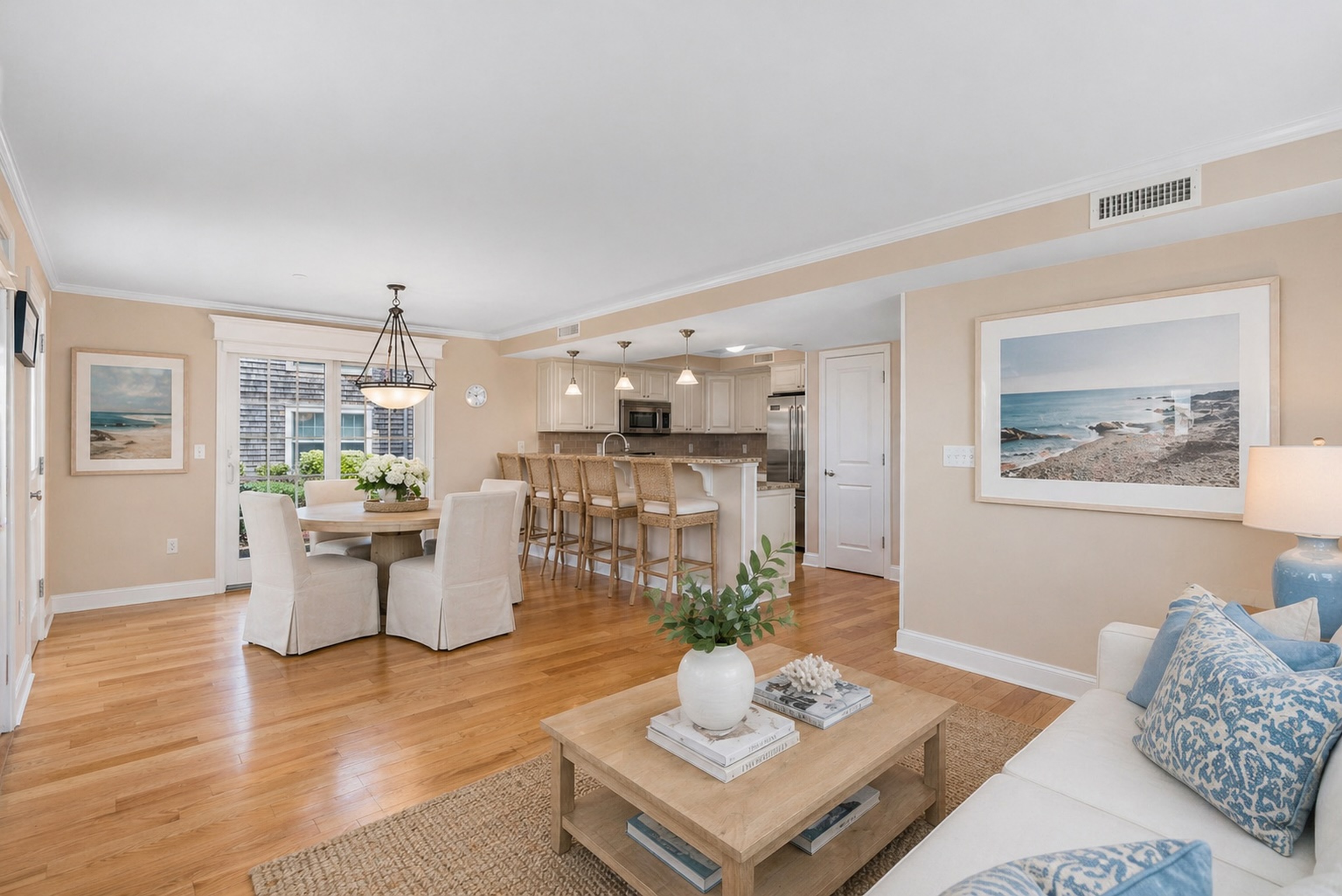 Experience coastal living at its finest in this beautifully appointed ocean-view condo in Surfside, Narragansett. Offering 2 bedrooms and 2 baths across 1,007 square feet, this residence features an oversized kitchen outfitted with premium Viking appliances, ideal for both everyday living and effortless entertaining. A secluded patio captures sweeping ocean views, creating seamless indoor-outdoor living, while a private covered entrance adds an extra layer of exclusivity and convenience. A second patio off the kitchen overlooks the gardens. Enjoy a premier location within walking distance to one of the best beaches in the state, as well as some of Narragansett's most celebrated dining destinations including The Coast Guard House, Sea Craft, Monahan's Clam Shack, and Celeste. A refined seaside retreat in an exceptional setting. includes 2 deeded parking spaces. Virtual staging and AI-enhanced presentation to illustrate the property's potential and scale, and are for conceptual purposes only and may not reflect current furnishings or conditions.