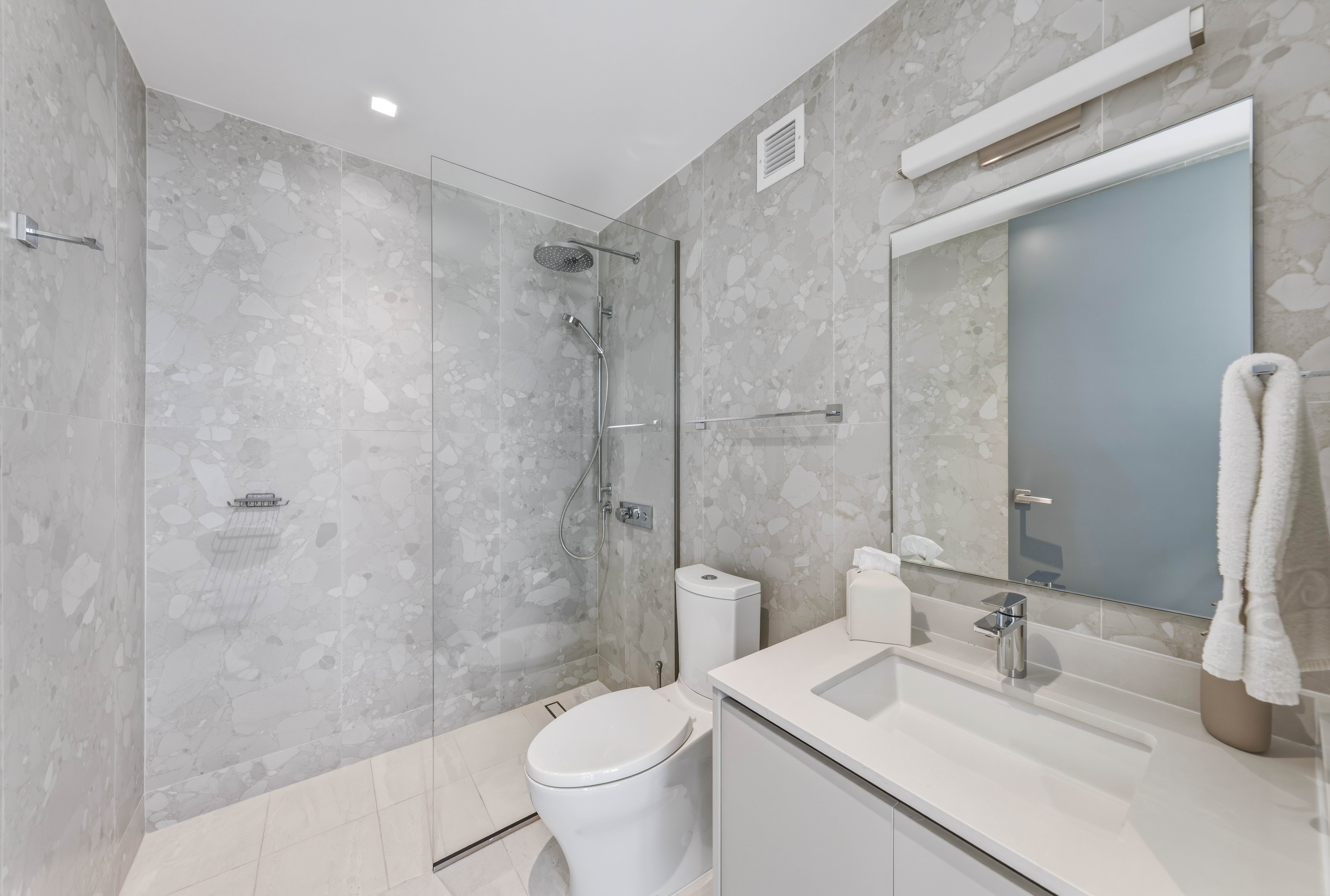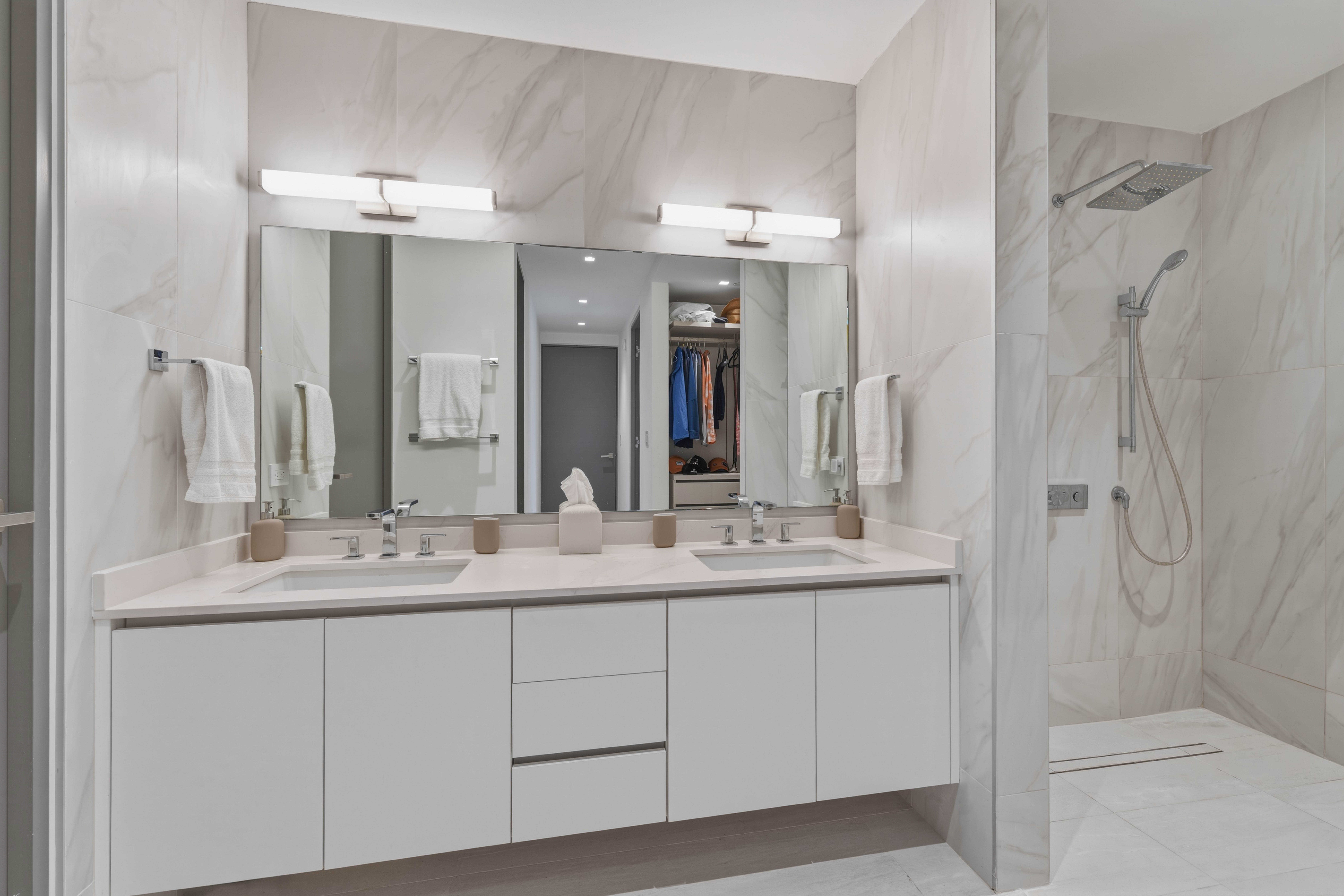 An elegant entry foyer leads seamlessly into the living and dining areas, ideal for both everyday living and entertaining. The chef-inspired kitchen features premium finishes and a walk-in pantry, while an expansive covered terrace extends the living space outdoors, capturing cooling sea breezes. Northwest-facing exposures frame sweeping views of the Atlantic Ocean and the historic skyline of Old San Juan.