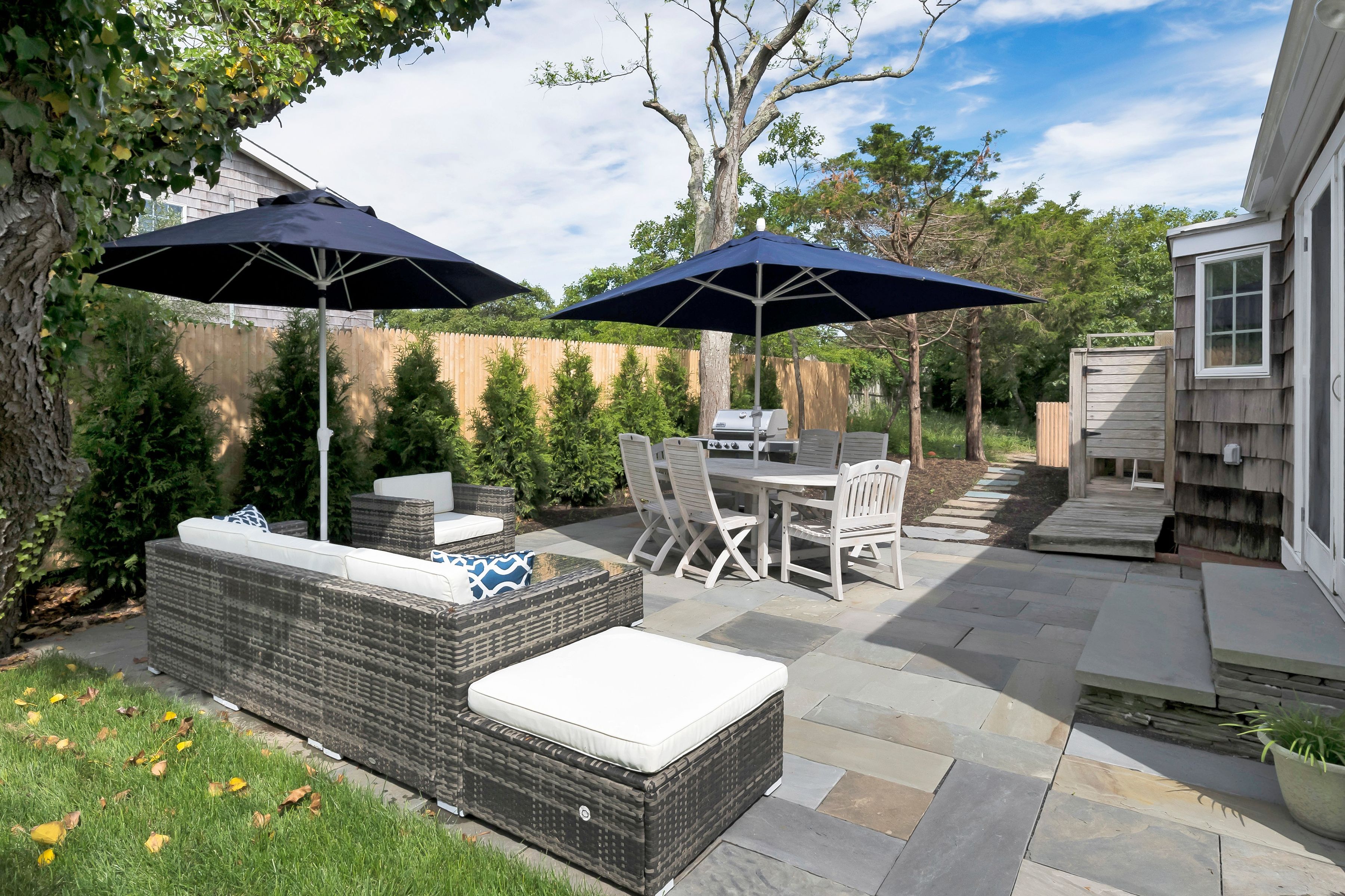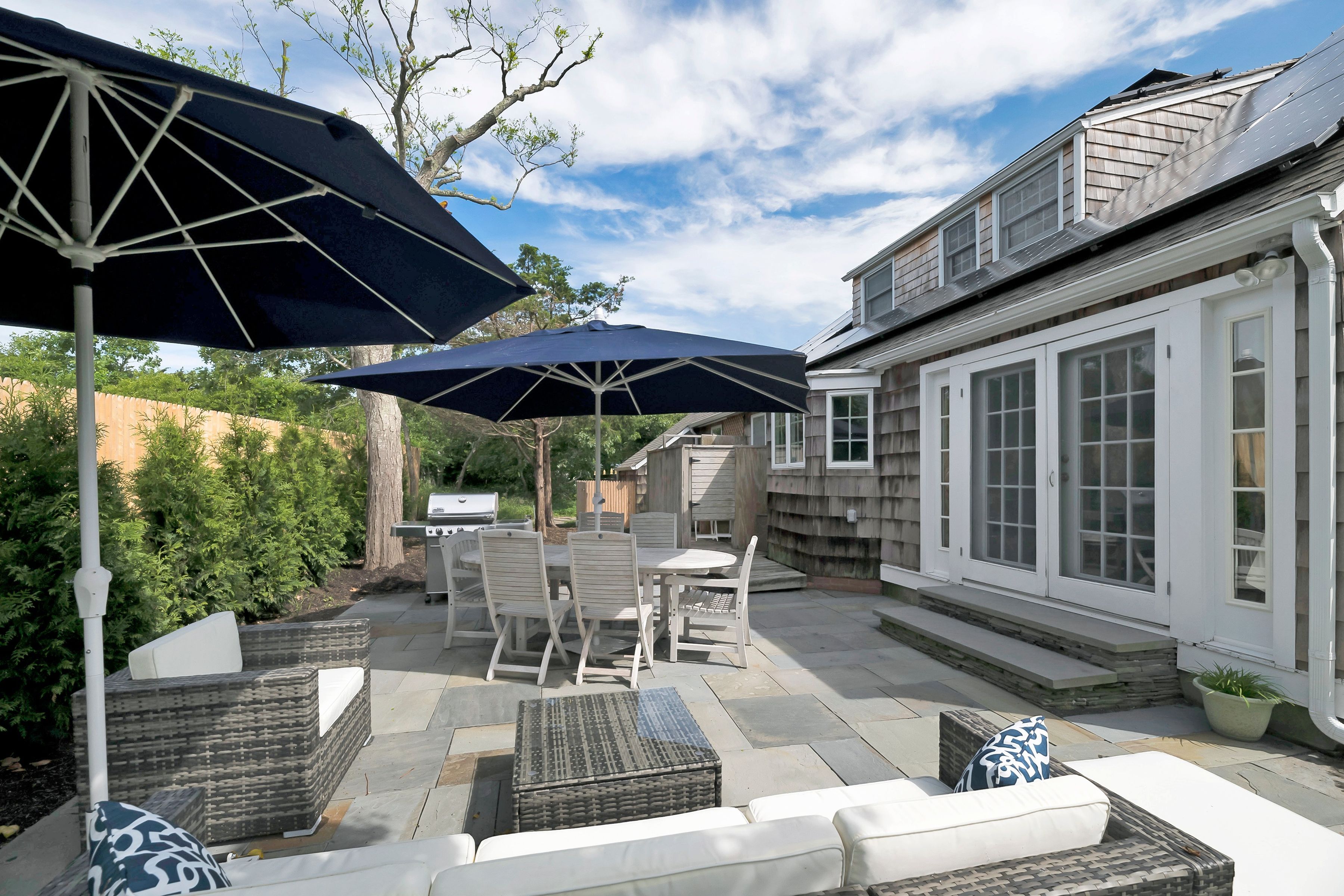 Renovated both inside and out, this beautiful Amagansett Dunes cottage has it all! Located just around 400 feet to ocean beach walkway, this charming house has just been completely landscaped including a brand new lawn, blue stone patio in back with all new outdoor furniture including dining table and chairs, gas BBQ, and entertaining area with sofa and chairs. The new blue stone walkway leads both around the house and heated pool. Pristine and recently updated, the interior first floor includes living room with fireplace and large screen TV, kitchen and dining area that overlook the back patio, a full bathroom, den/office with sofa sleeper. Separated for privacy, the large primary ensuite bedroom opens to an expansive deck with heated pool, lounge chairs and second entertaining area. The second floor includes two additional guest bedrooms, 1 with Queen bed, the other with twin beds, and a full guest bathroom. [[Rental Registration # 24-1987]] EH RR #: 24-1987