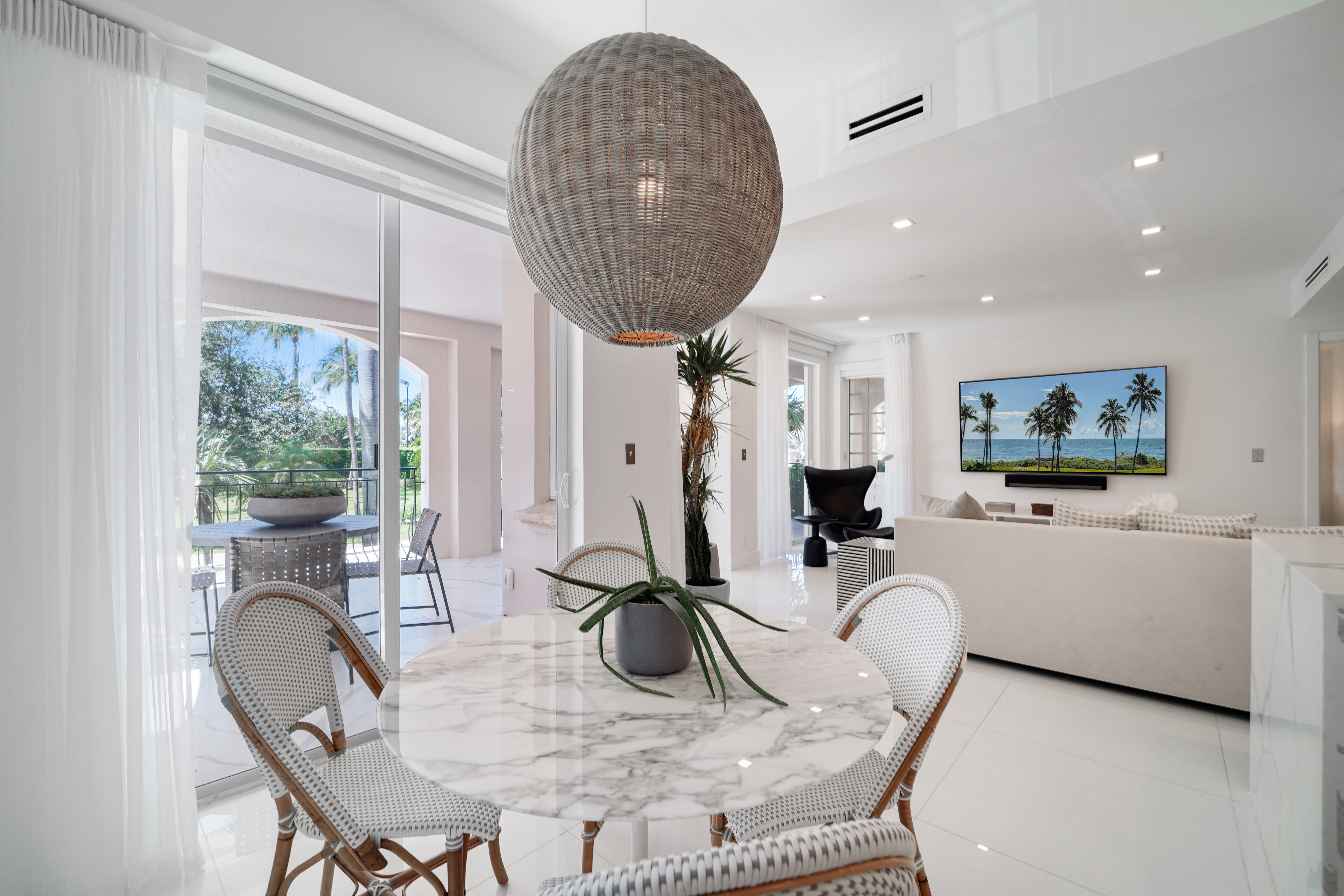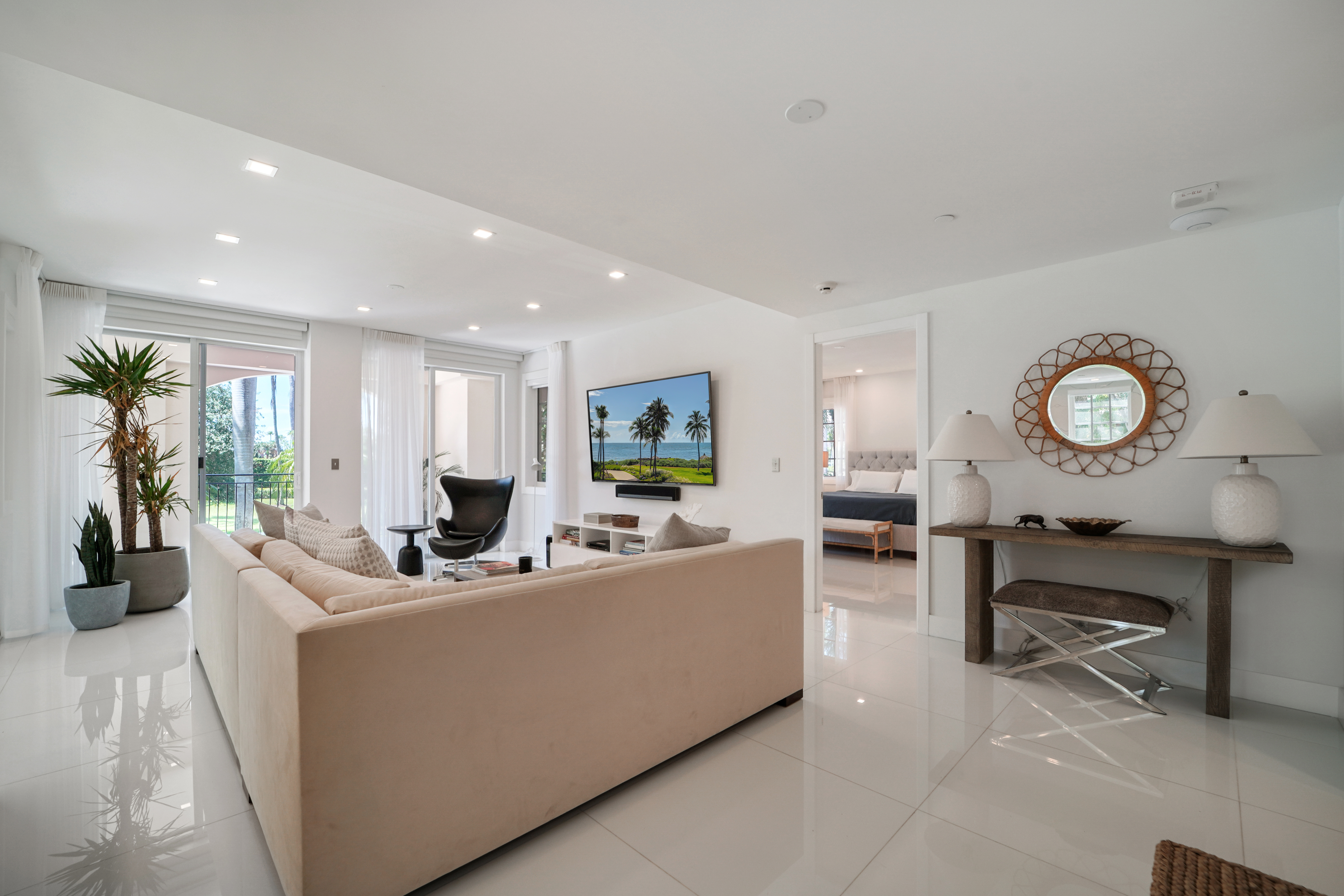 Beautifully renovated and reconfigured to perfection in chic white dcor and top of the line finishes. Lanai Seaside Village unit boasts serene garden views and massive wrap around terrace ideal for outdoor entertaining and afternoon naps. No expense spared in making this the best 2 Bedroom, 2 bath unit with spacious living areas to lease short or long term. Perfect for an individual or a couple who appreciate ground, level easy in/out location that doesnt require using an elevator.