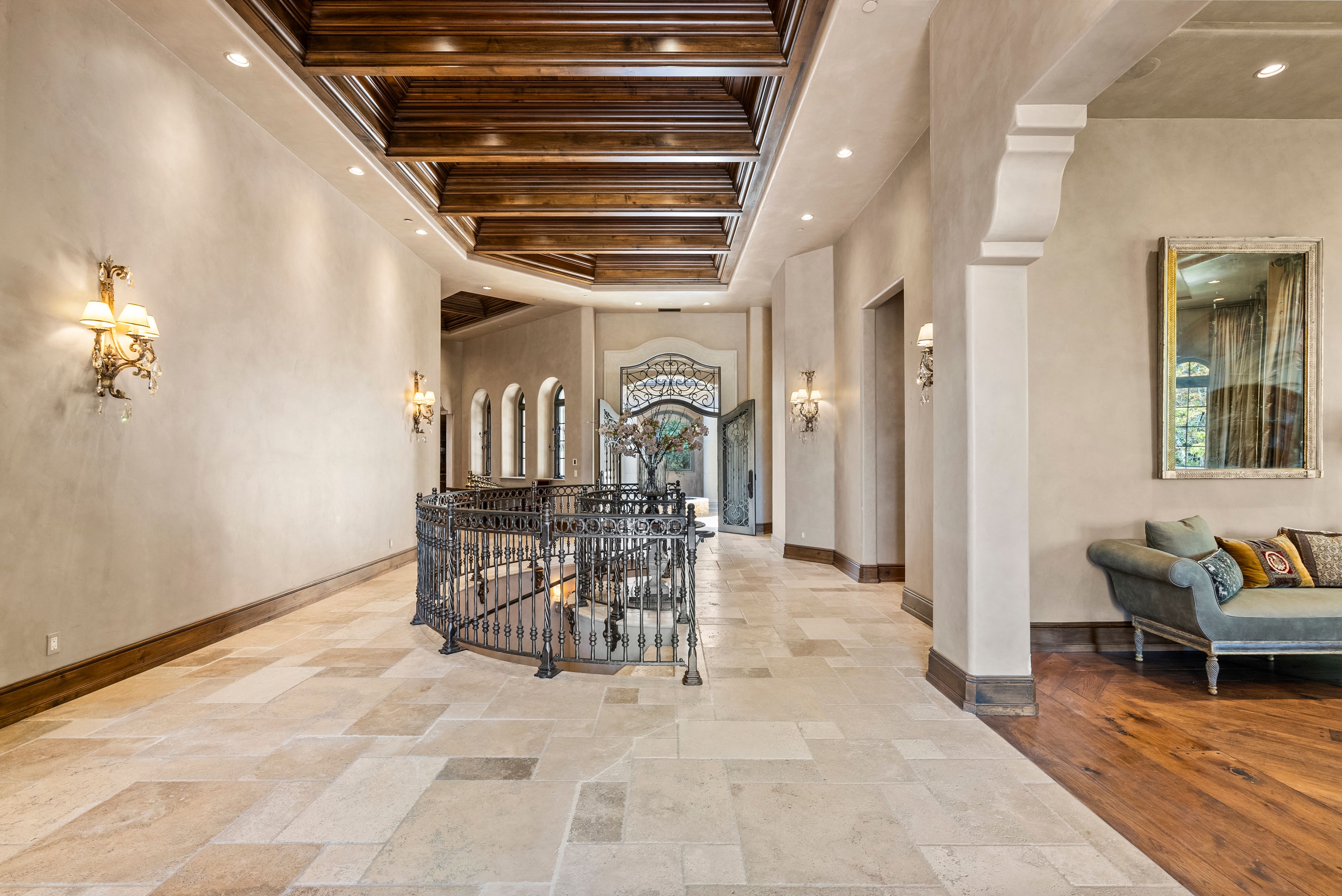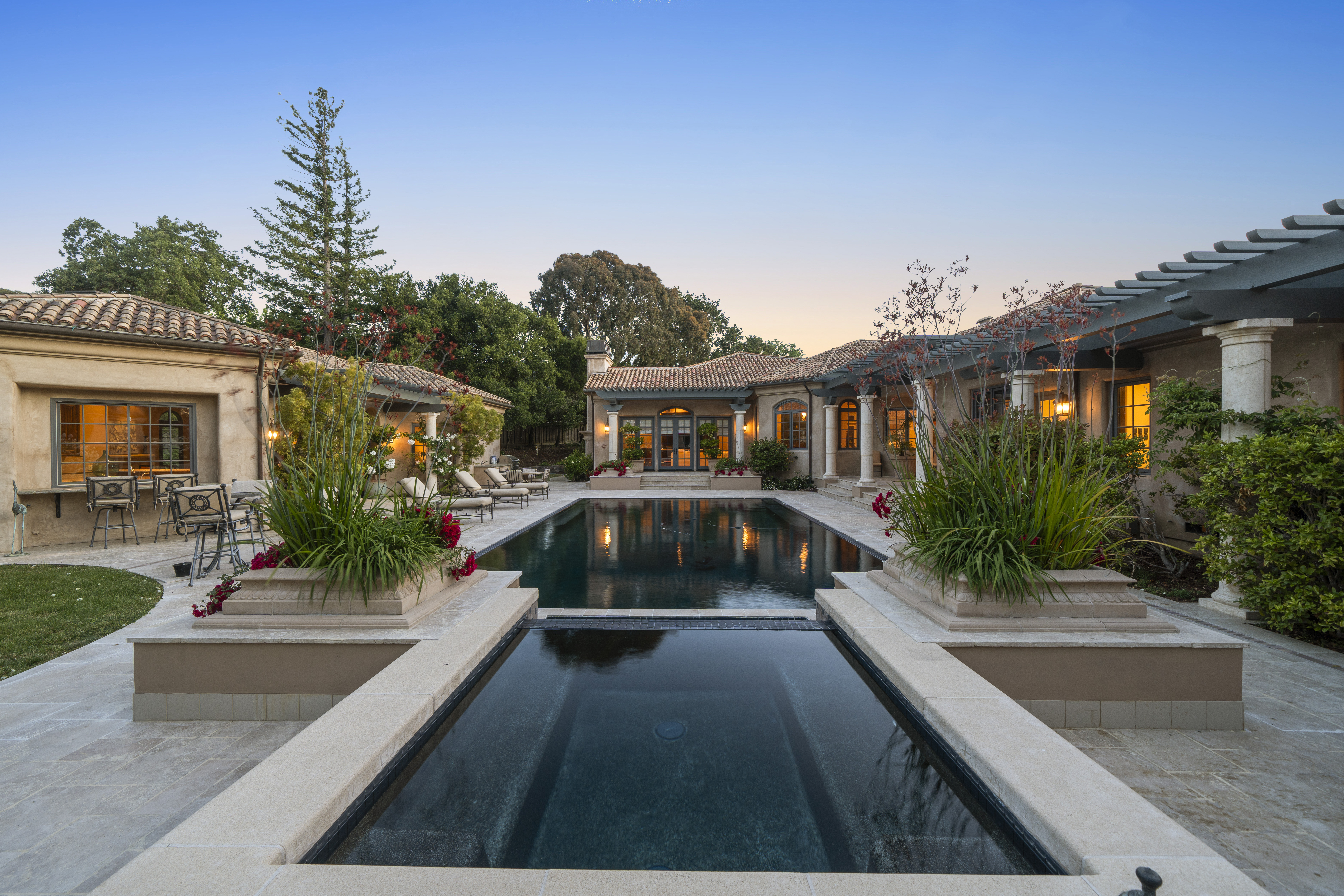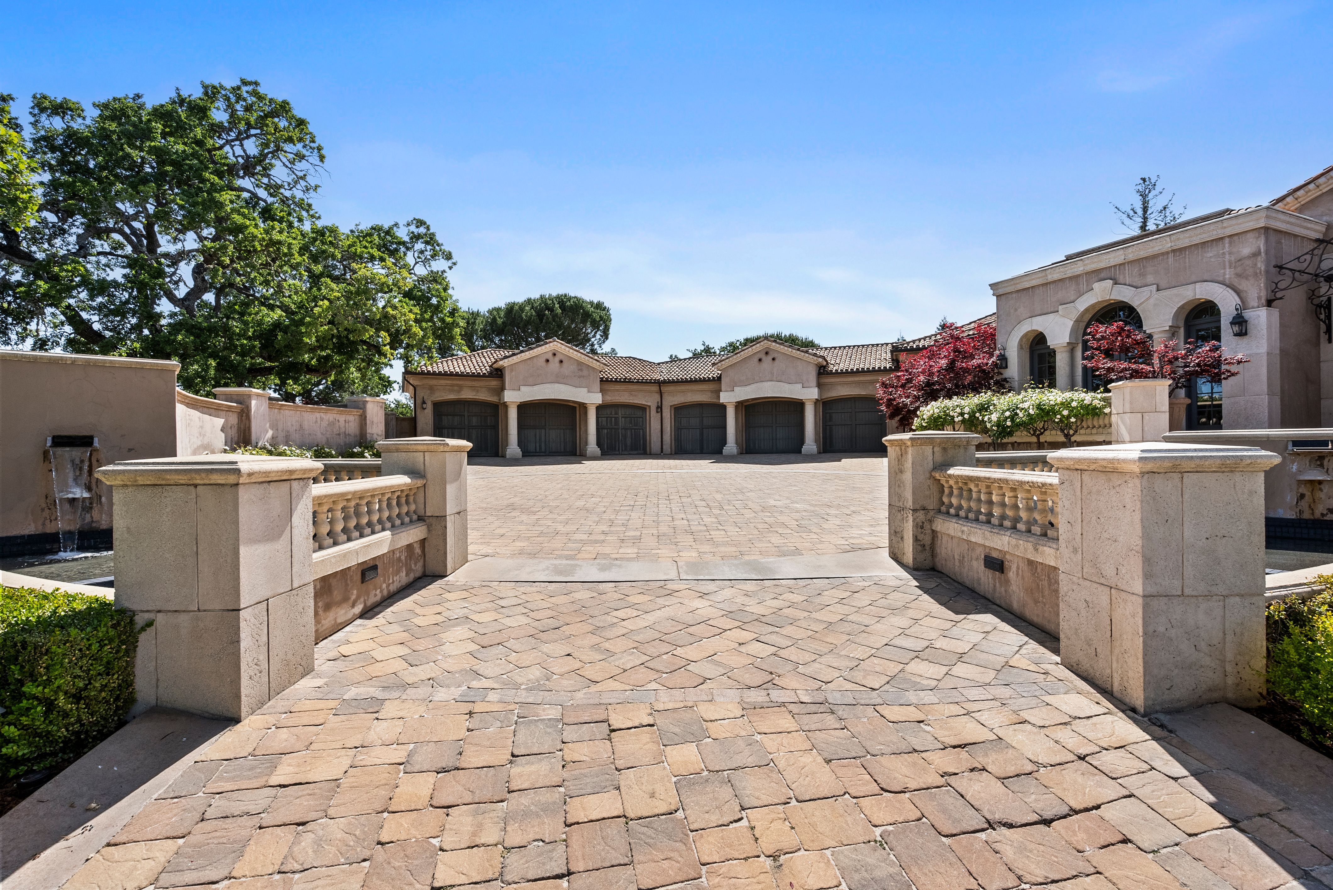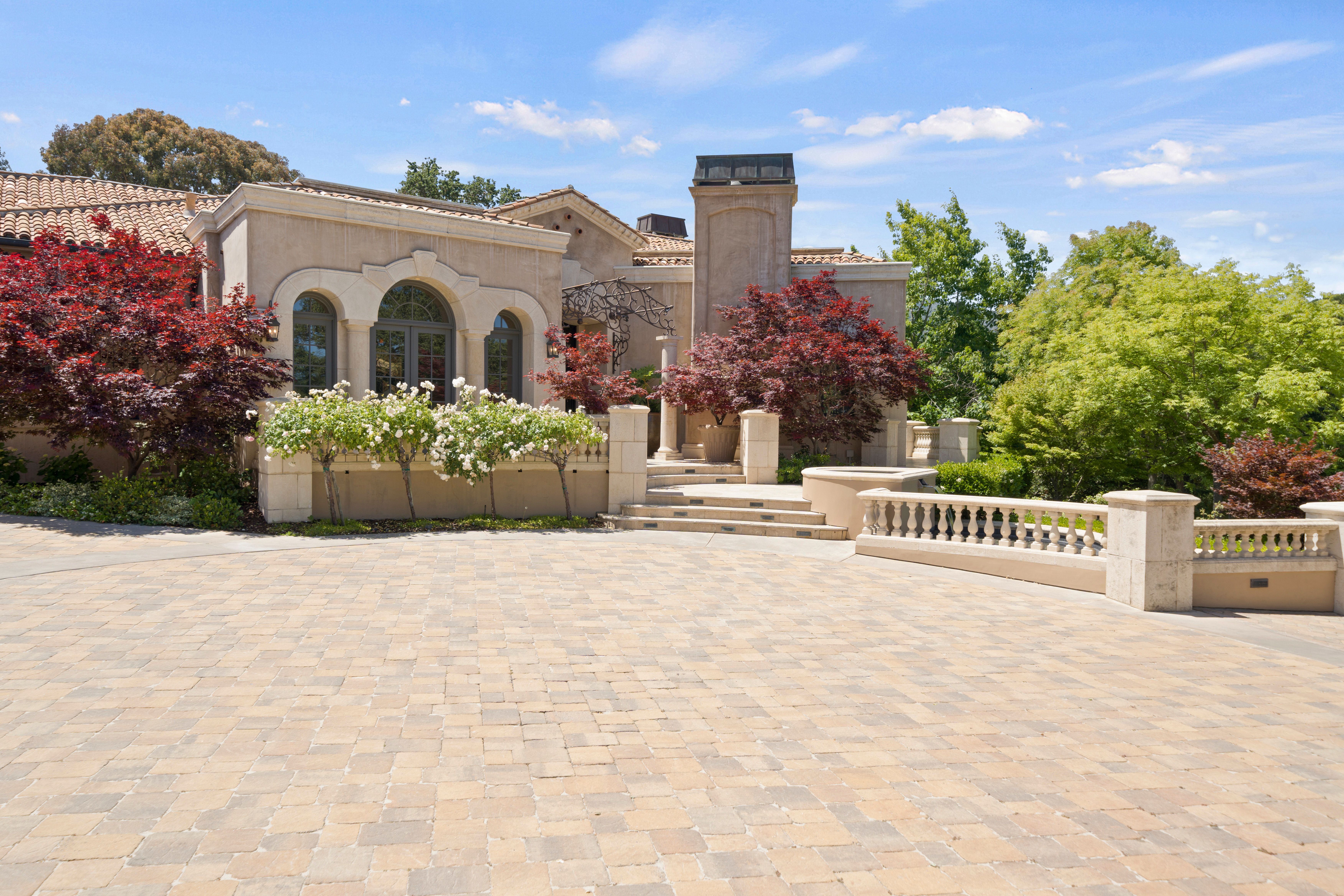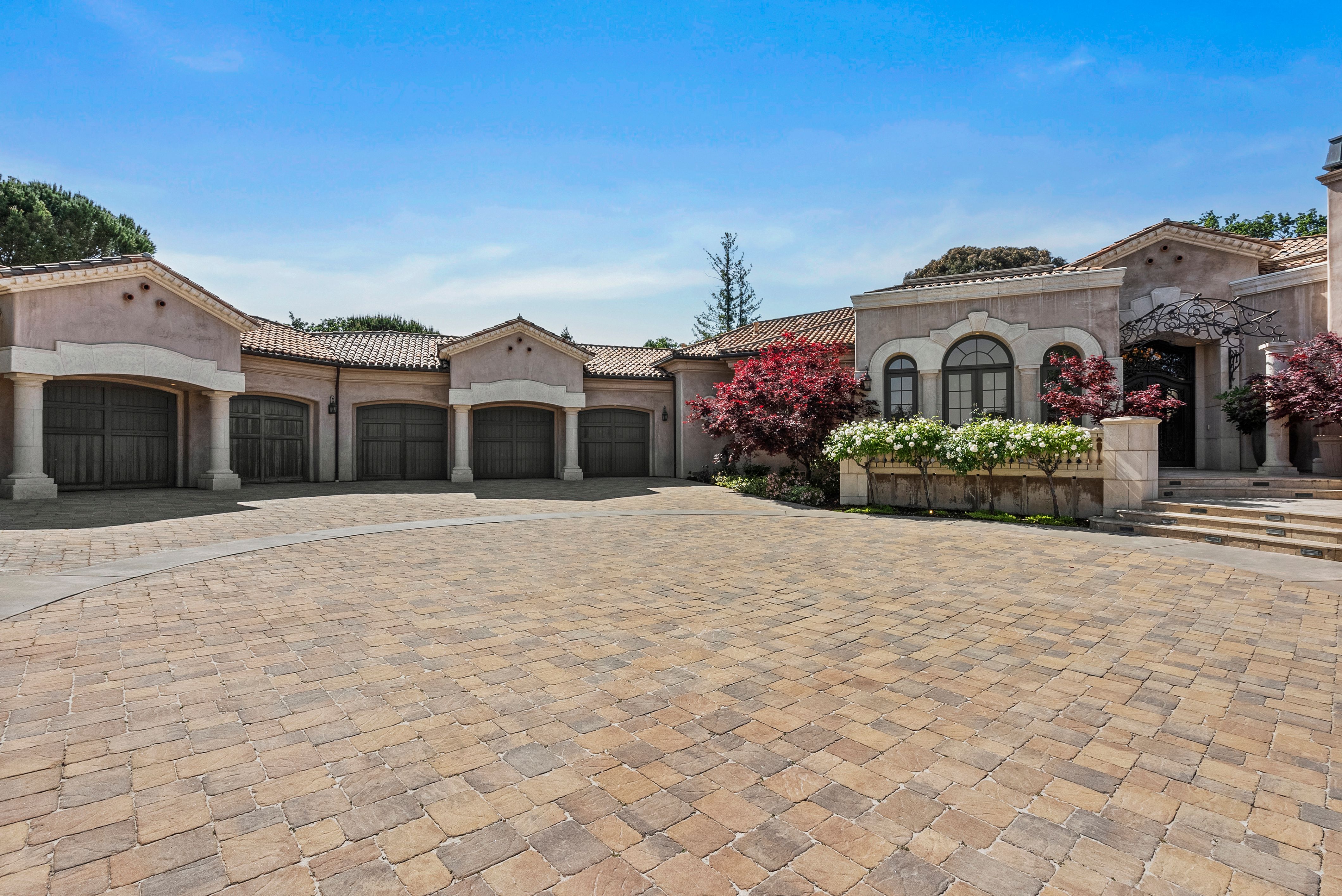 Recognized as one of the most majestic estate homes in Los Altos Hills, this property exudes European grandeur with a focus on lavish entertaining both indoors and outdoors. The property's gated entrance and motor court create a commanding first impression with details that include carved balustrade railings, water features, and massive iron and glass front door. The homes architecturally distinct floor plan integrates the front entrance with the opulent interior living spaces, arranged around a central courtyard and leading to the beautifully landscaped grounds. An infinity-edge pool, spa, fireplace, and barbecue center set the stage for magnificent outdoor gatherings. Each room showcases meticulous craftsmanship, featuring ornate ceiling designs, plaster walls, sophisticated lighting, grand fireplaces, and custom cabinetry. The main residence has six bedroom suites, two offices, a lounge, and eight and a half baths, complemented by a one bedroom, one bath guest house. Adding to the estate's allure are the lower-level recreational room, fitness center, theater, and wine cellar, alongside an attached six car garage. A pinnacle of luxury and Old World sophistication, this unparalleled property offers close-in convenience and with access to excellent Los Altos schools.