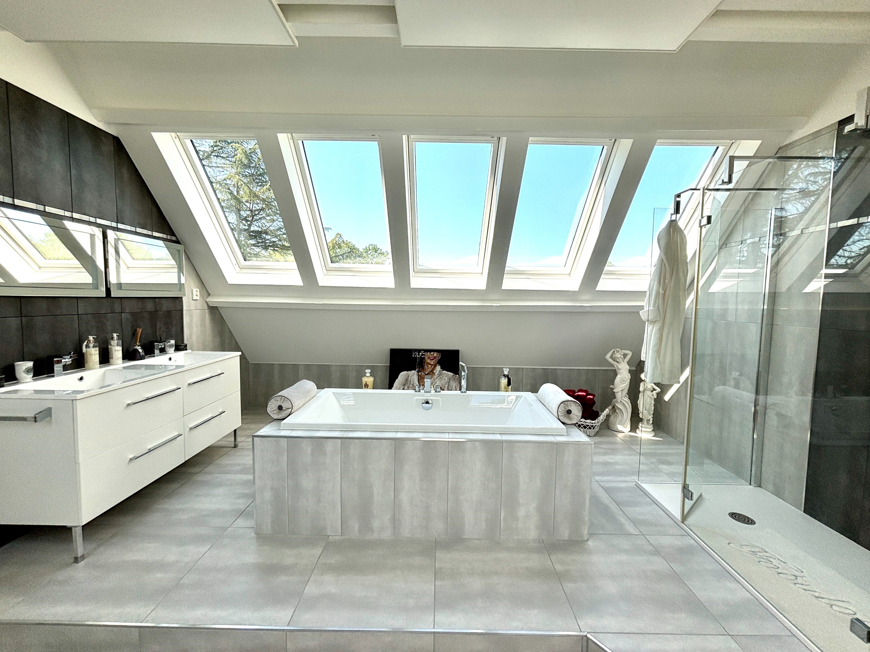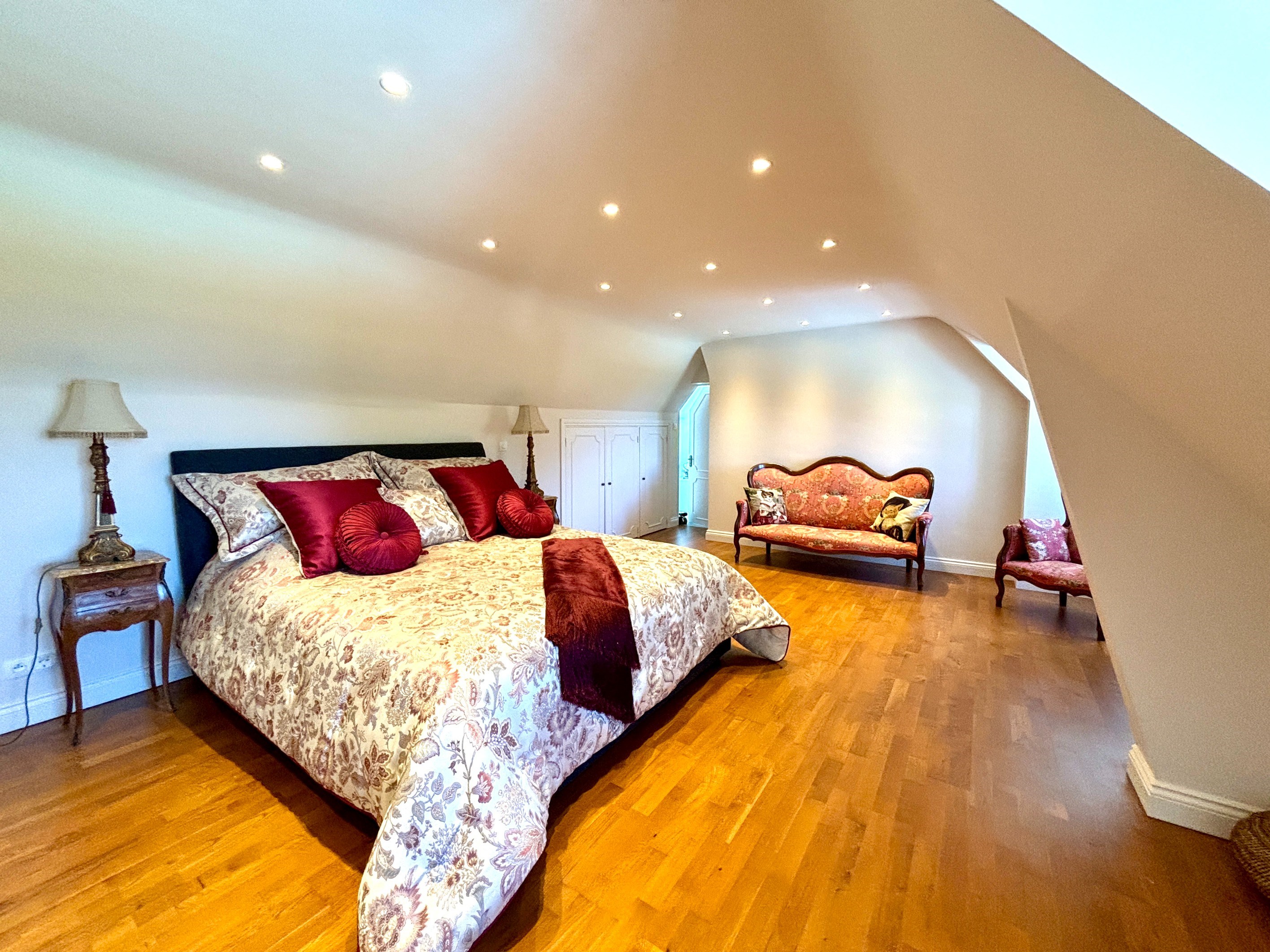 It is a property comprising a house of approximately 435m2, a first gîte of approximately 119 m2, a second gîte (gardener's house) of approximately 85m2, plus garages, workshops, common areas for 220m2 on a magnificent land including a swimming pool, a pond all registered for 11Ha 53a 9ca. The main house, imposing, completely renovated with taste, includes on the ground floor an entrance, a dressing room, a very beautiful, modern, very, very well equipped dining kitchen, a dining room, a living room with fireplace (stove), a technical scullery, a landing leading to a library (piano room), a master suite with dressing room, shower room, toilet, a very large living room, another toilet with hand basin. On the first floor, a landing leads to three beautiful bedrooms, a shower room, a hallway with cupboards and a sublime bathroom/shower worthy of a palace! And a technical part with the new oil boiler is hidden in a small room. The first gîte is composed on the ground floor of a kitchen open to a living room, dining room and we also have a shower room/wc. On the first floor a large landing serving as a TV lounge, a corridor with a kitchenette including a fridge, dishwasher, four bedrooms including a very large one, two shower rooms with toilets. The second gîte consists of an entrance, a living/dining room, a corridor, two bedrooms, a bathroom, a toilet. A full basement includes a double garage and a cellar. In the Gîte N°1 section, on the garden level there is a first garage with a workshop area as well as a second garage with a mezzanine. Numerous terraces overlook the magnificent pond with its pontoon leading to a kiosk set up in the middle of this body of water. A well is present on the property with a pump allowing the pond to be filled during the summer so that the numerous fish do not suffer from a lack of water. The woods are very well maintained and bridle paths exist. An old pond is present but is not maintained. The woods are maintained, the lawns are beautiful. The property is demarcated to prevent the intrusion of wild boars. It is a magnificent, quiet but not isolated property in impeccable condition. A real favorite. This residence has been completely renovated, the roofs and zincwork are in perfect condition. The decoration is refined, the kitchen is a wonderful convivial space, superbly equipped, the boiler is new, the scullery has custom-made storage, everything is connected to remote controls for the lighting and the electric gate. The shower rooms are modern and practical, the previously mentioned bathroom is extraordinary, above it solar panels allow the hot water tank to be heated. The immense and numerous terraces have been designed to enjoy the view of the pond which is the centerpiece of this property. The charm of the pontoon leading to the central kiosk is a total success! The main gîte is completely renovated with numerous skylights providing incredible light. The insulation has been completely redone (as well as for the main house), the shower rooms have Bluetooth mirrors (very original gadget!). The gardener's house has an old decoration, the heating is provided by electric convectors. The 12x6 swimming pool with a depth ranging from 0.90m to 2m is salt, with a heat pump and an electric cover, it is 4 years old. It is a haven of peace and tranquility with a rare charm.