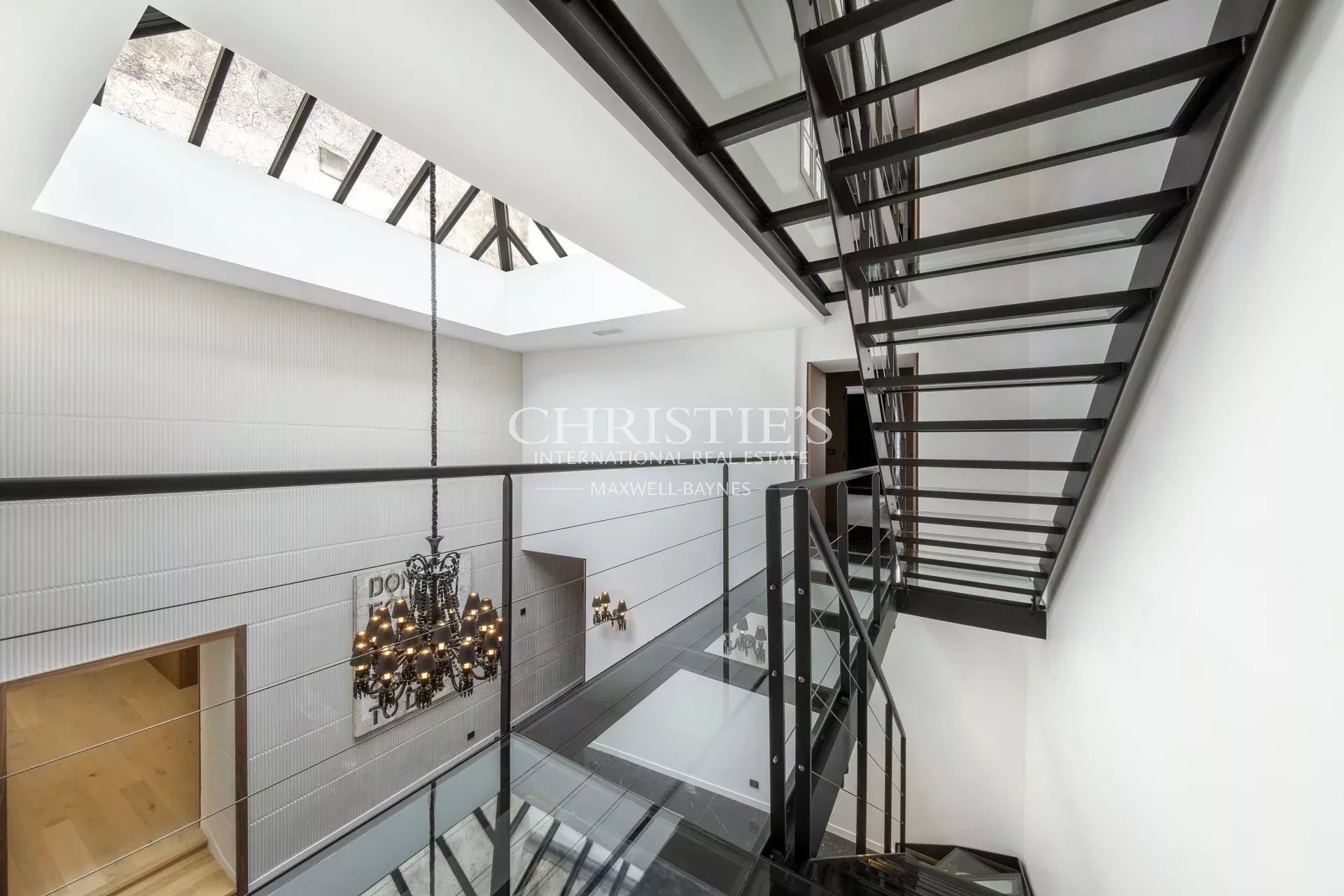 The ground floor welcomes you with a beautiful living area, bathed in natural light by an impressive glass roof. The fully-equipped, top-of-the-range open-plan kitchen is perfectly integrated into the living room, creating the ideal setting for convivial moments with family or friends.