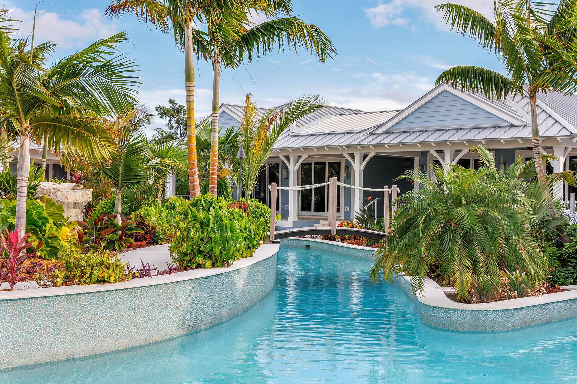 At the heart of the property lies a lazy river loop infinity pool, complete with bridges, a swim-up pool bar with a gazebo, a spa with a table, a lap pool, beach-style entries, and a waterfall grotto plus a gas fire pit, and putting green. Whether you’re floating under the sun, entertaining guests, or enjoying a peaceful evening by the water, this home was manifested for unforgettable moments.