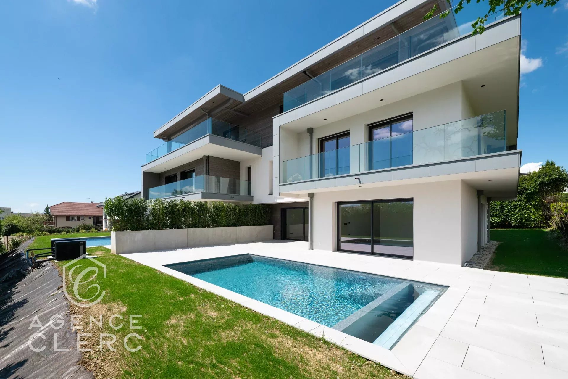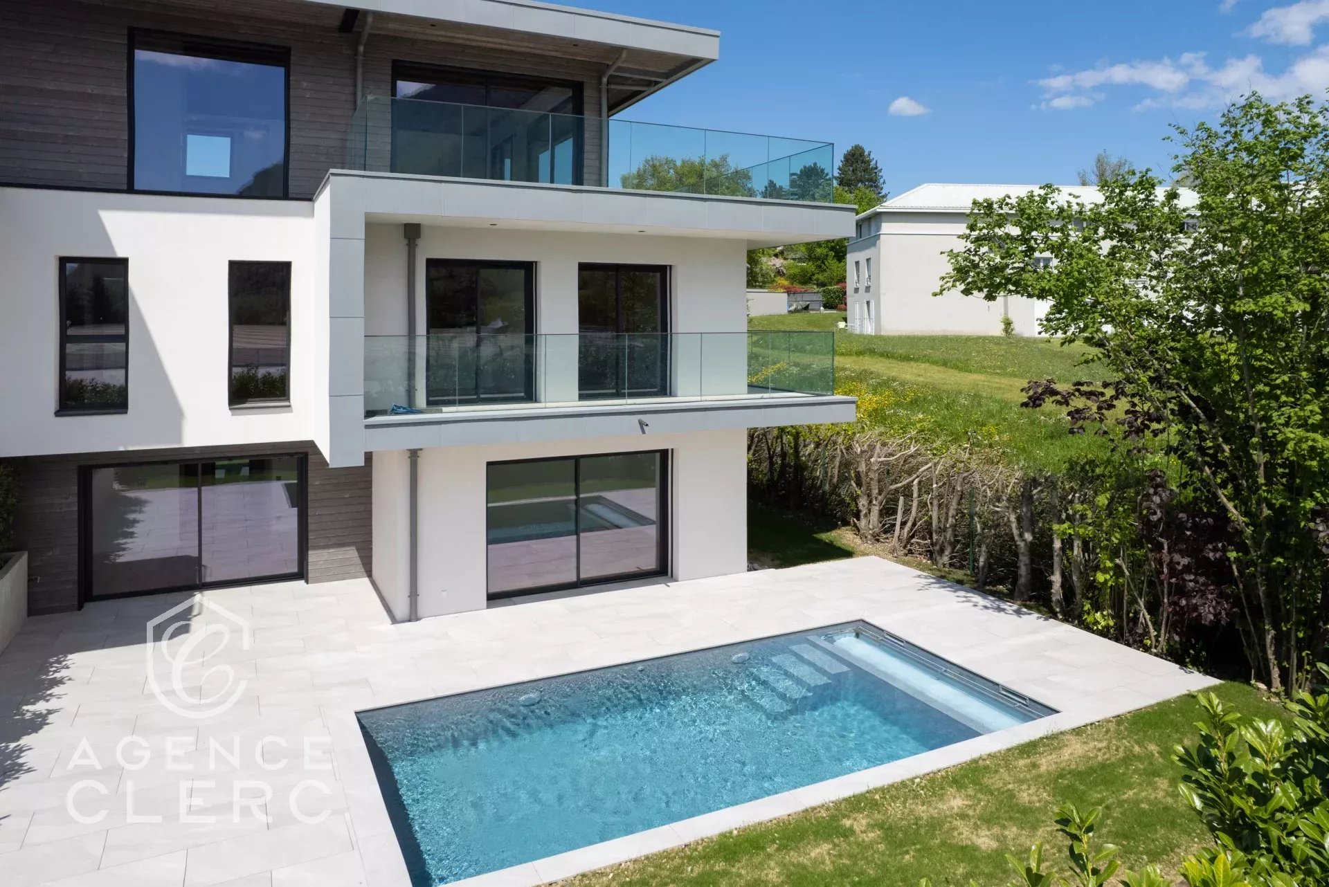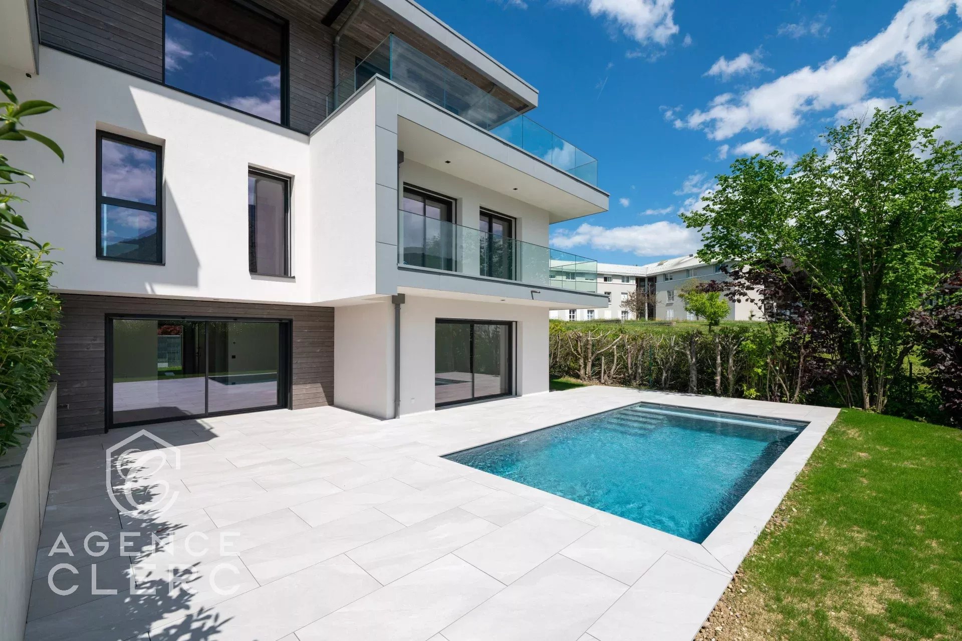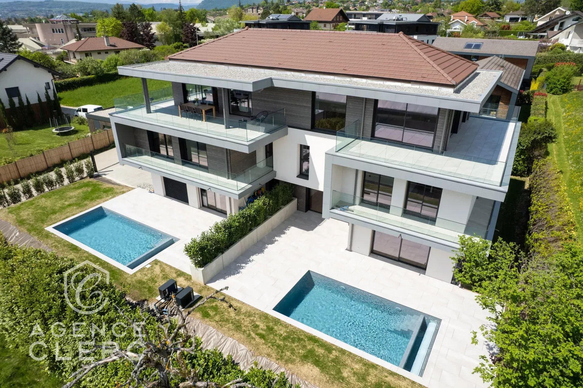 Annecy le Vieux, IUT sector: superb new semi-detached villa with 244 m² private garden and swimming pool, 217 m² Loi Carrez living space, 5 bedrooms, 4 bathrooms, 57 m² penthouse terrace, elevator, lake view from the penthouse, 1-car garage + 1 covered parking space, cellar, excellent amenities, quiet location. Condominium with 2 apartments