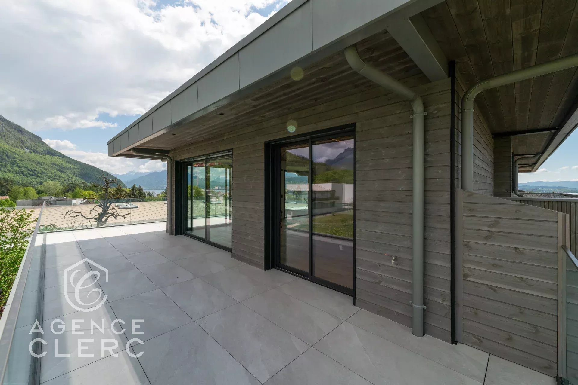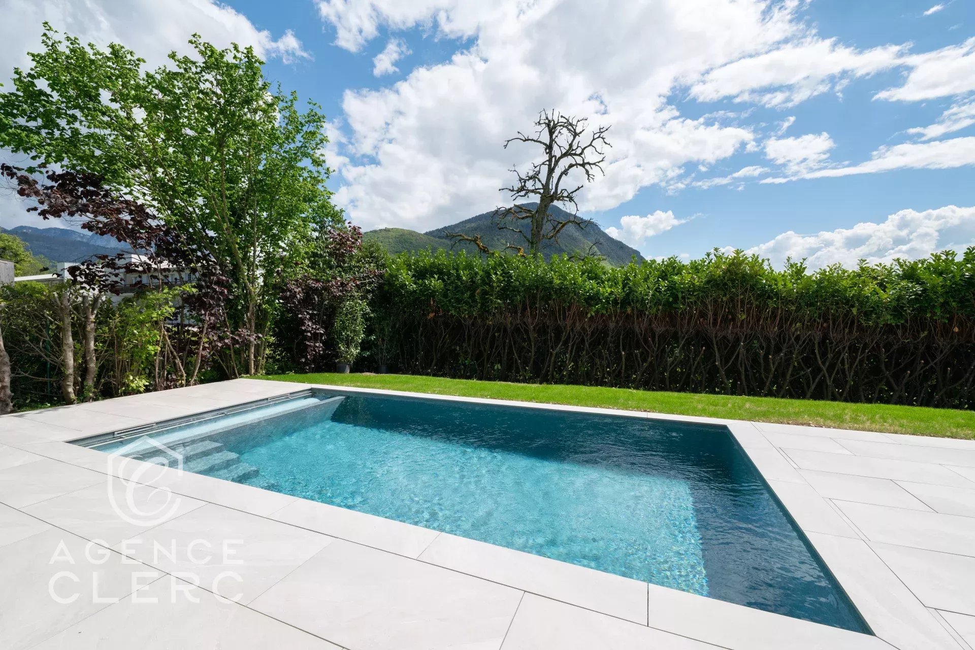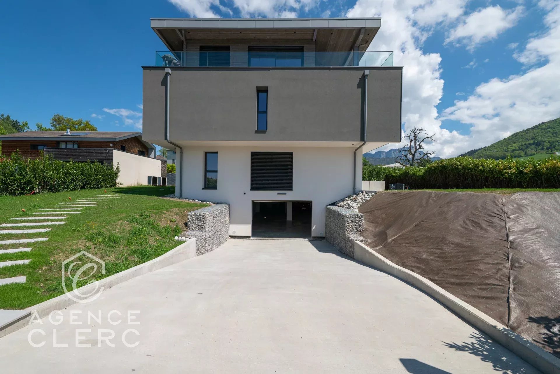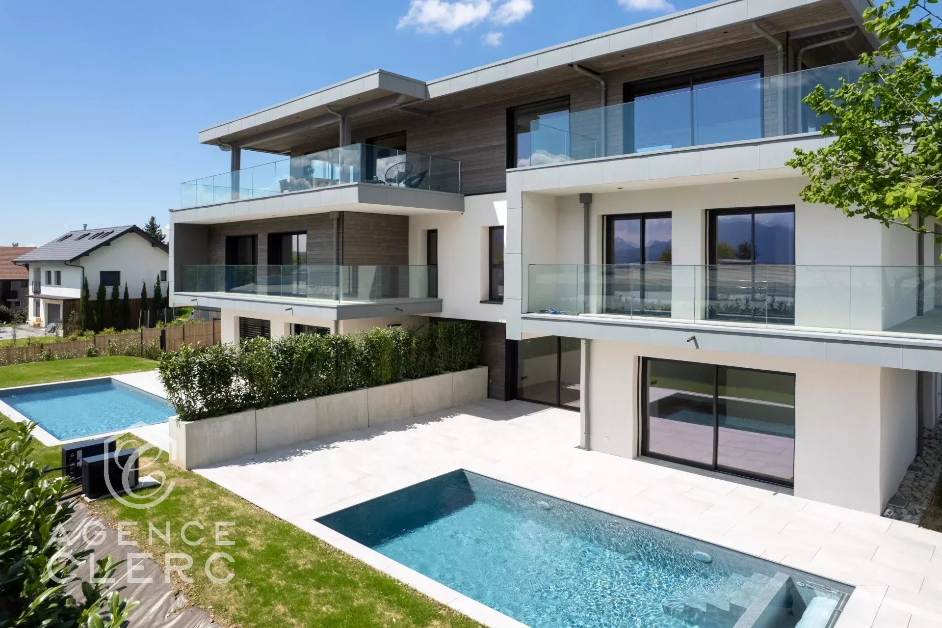 Annecy le Vieux, IUT sector: superb new semi-detached villa with 244 m² private garden and swimming pool, 217 m² Loi Carrez living space, 5 bedrooms, 4 bathrooms, 57 m² penthouse terrace, elevator, lake view from the penthouse, 1-car garage + 1 covered parking space, cellar, excellent amenities, quiet location. Condominium with 2 apartments