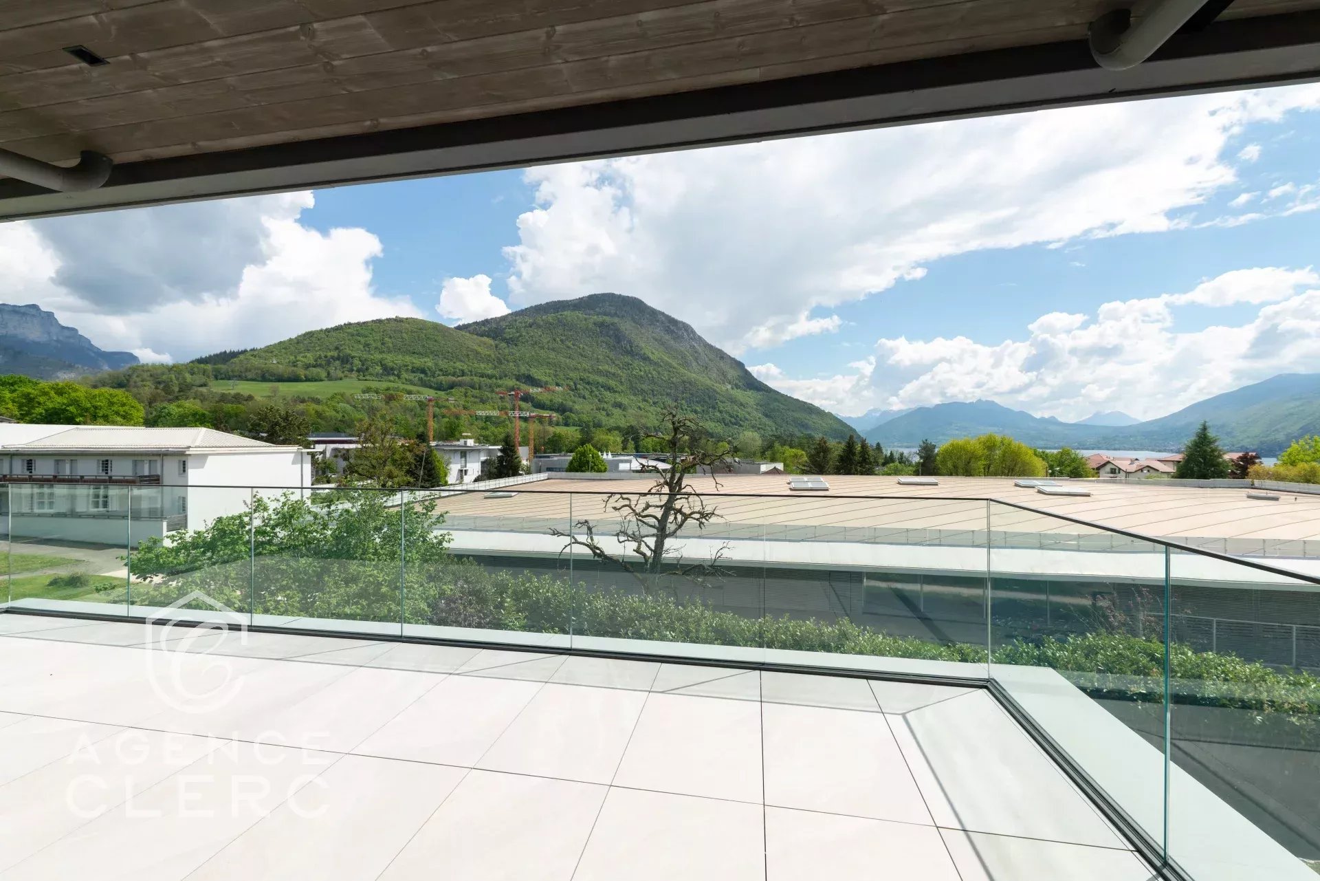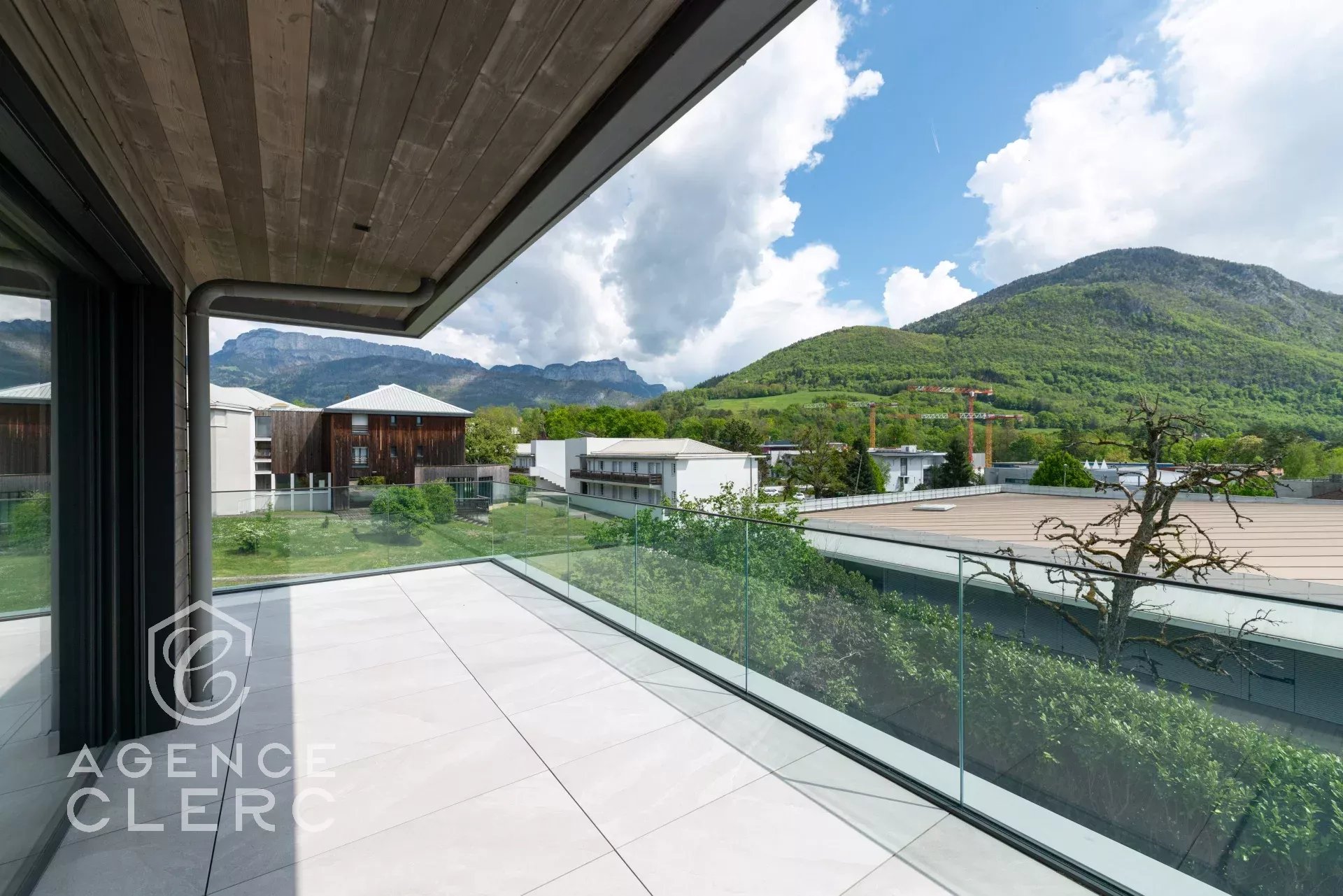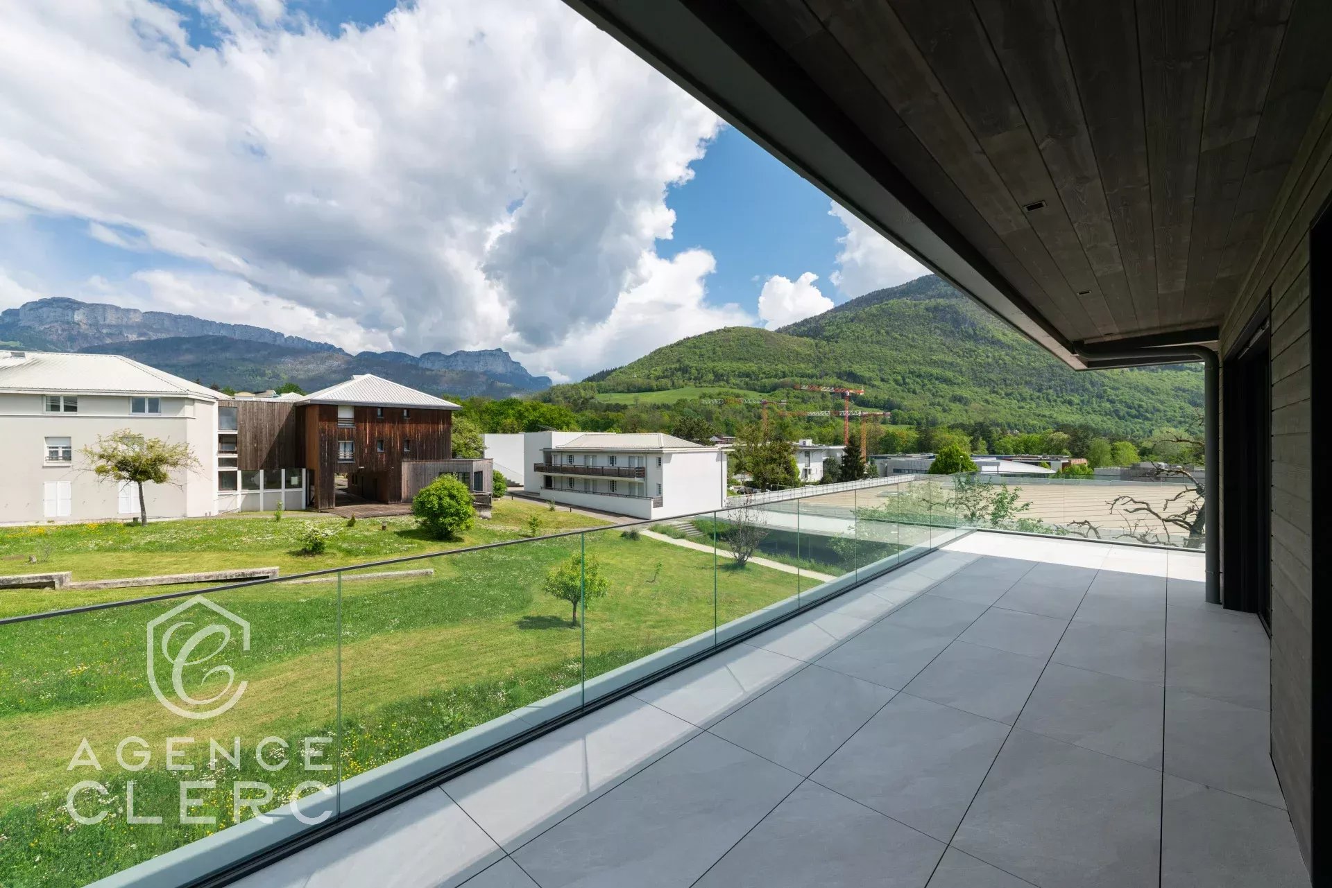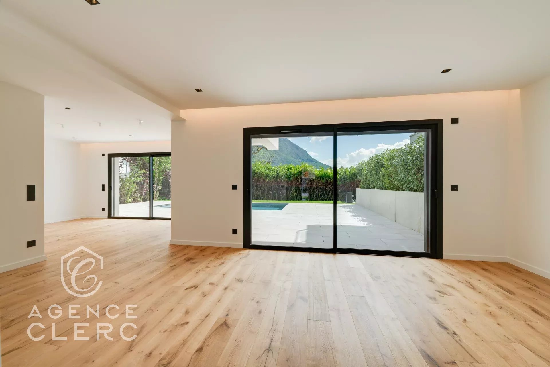 Annecy le Vieux, IUT sector: superb new semi-detached villa with 244 m² private garden and swimming pool, 217 m² Loi Carrez living space, 5 bedrooms, 4 bathrooms, 57 m² penthouse terrace, elevator, lake view from the penthouse, 1-car garage + 1 covered parking space, cellar, excellent amenities, quiet location. Condominium with 2 apartments