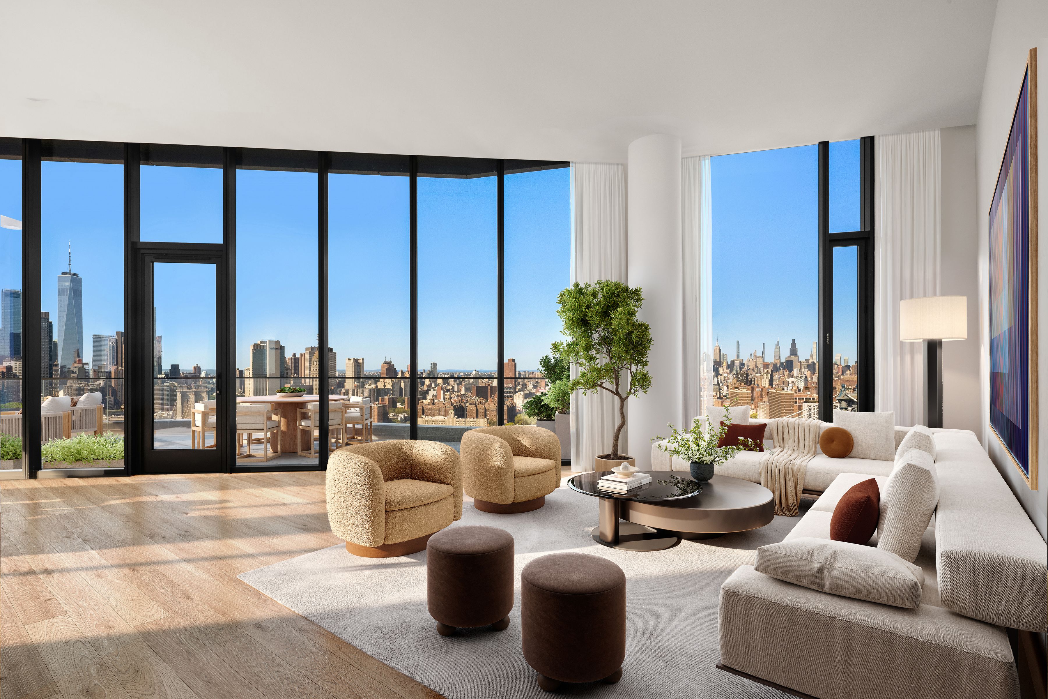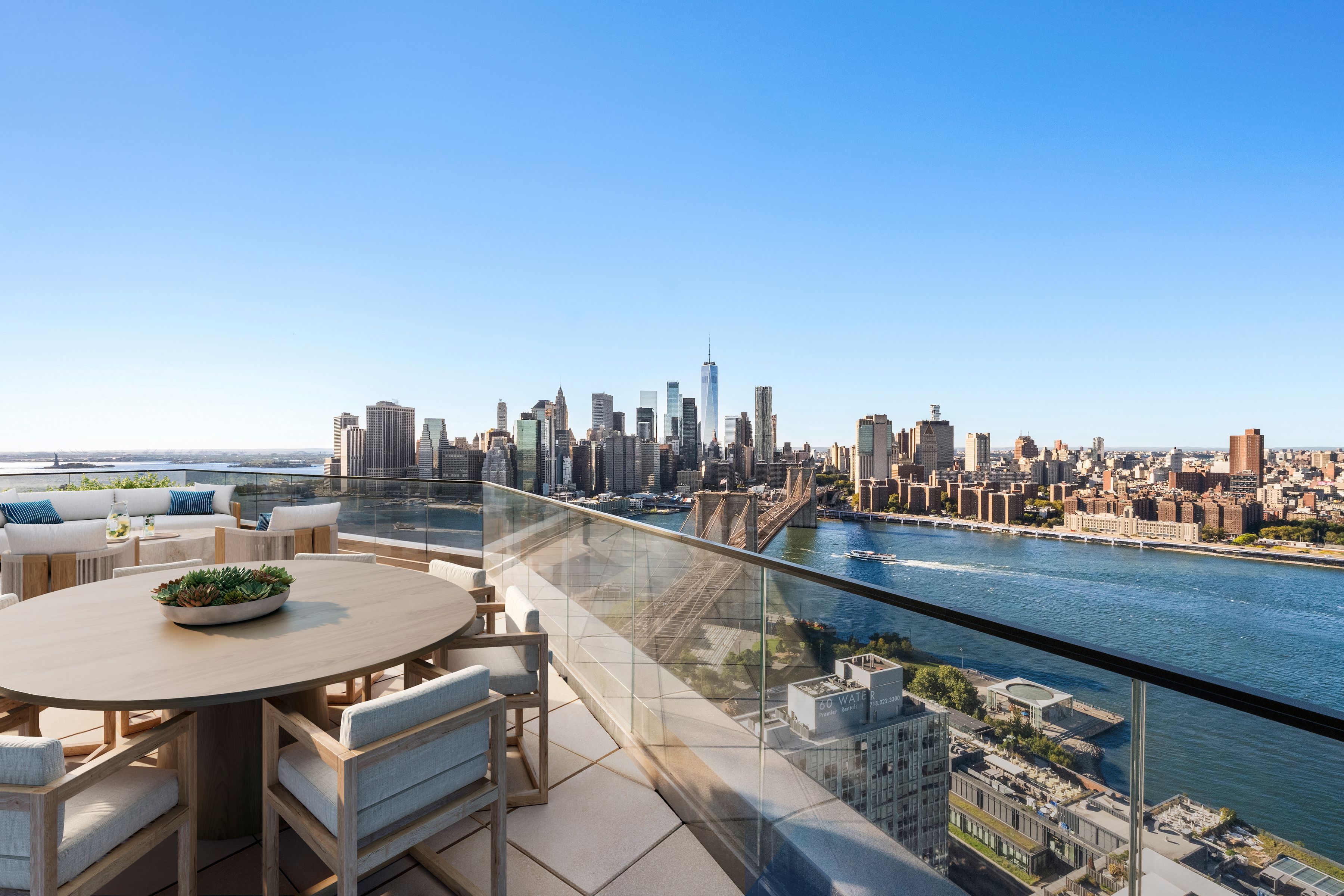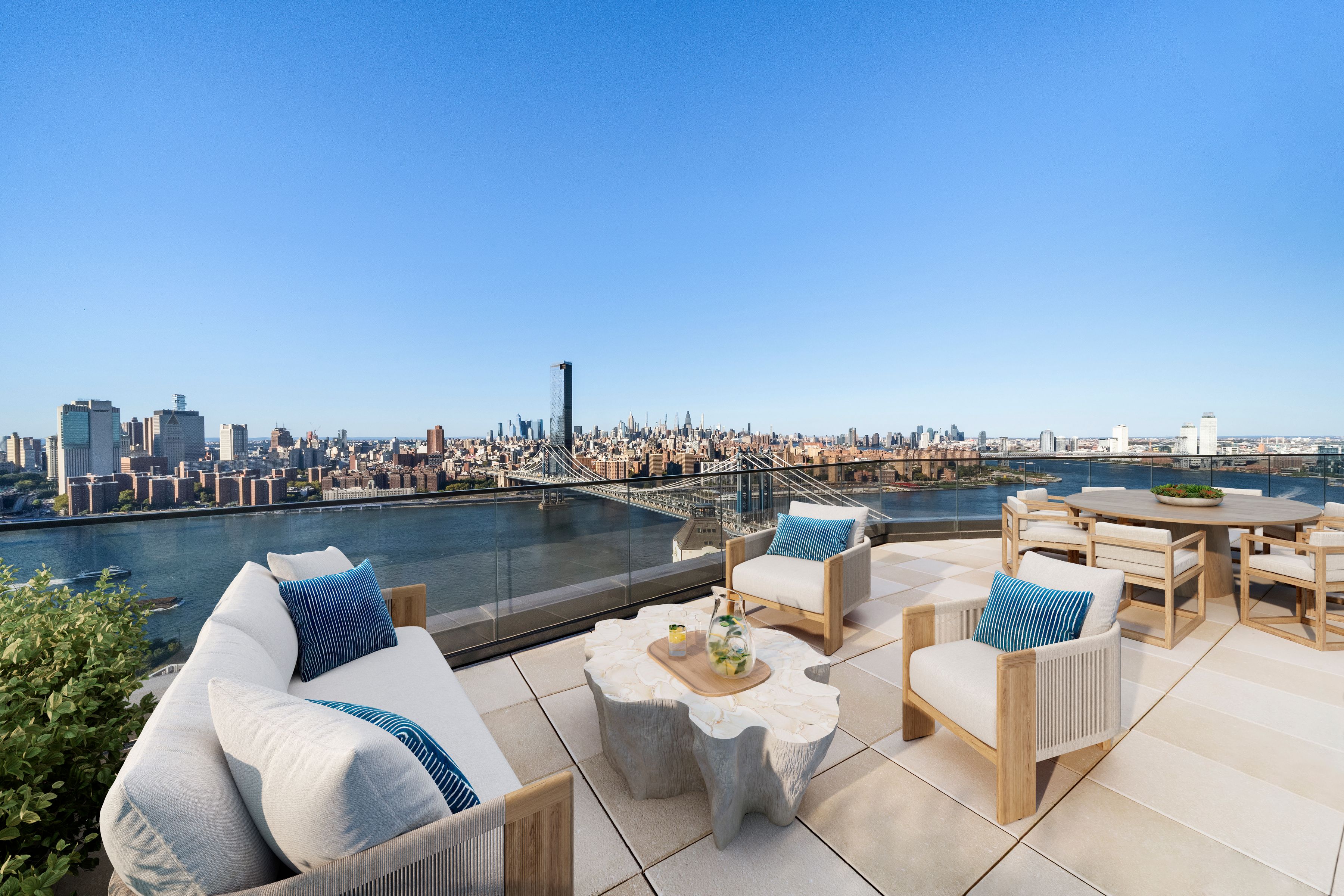 Immediate Occupancy. On-site model residences now available to tour by appointment. Presenting Penthouse A: The crown jewel of Dumbo. With 360 views and a private 498 SF river-facing terrace, this four-bedroom, three-and-a-half bath penthouse is 4,266 SF of entertaining perfection. Perched atop of Olympia Dumbo, PHA spans across the entire top floor, boasting breathtaking views from the 33rd floor, and ceiling heights up to 13’. Arriving home via elevator to a private landing, the formal foyer and gallery lead to the sun-filled living and dining areas, highlighting remarkable views of the Brooklyn Bridge, Manhattan and New York Harbor. The living area is finished with a wet bar featuring white maple cabinetry, Calacatta Vagli Oro marble backsplash, stainless sink and a Thermador wine cooler. The Workstead-designed kitchen is stylishly separated from the main living area and features a spectacular island with Calacatta Vagli Oro marble and chamfered edges, white maple cabinetry paired with satin nickel hardware, Gaggenau appliances and a separate walk-in pantry. A laundry room with side-by-side LG W/D, and the powder room are discreetly located off the main hallway. The powder room features a custom vanity with a stone top, and Federal Blue tile floors. The Manhattan Bridge-facing primary suite features double walk-in closets, a linen closet, and an exceptional en-suite bathroom. With Agglo Ceppo honed stone walls, flooring and countertops, a custom double vanity with satin nickel pulls, deck-mounted faucets and controls, dual water closets, dual showers, and a freestanding soaking tub. As a spacious, separate room just off the foyer, the den/fourth bedroom features curved windows and multiple closets, the perfect space for working or unwinding. In their own wing, the additional two bedrooms feature en-suite bathrooms with Federal Blue tile flooring, undermount tubs with brushed nickel fixtures and custom maple vanities. Olympia is a modern interpretation of its surroundings. With exteriors by Hill West Architects and interiors by Workstead, the 76 homes reflect a sense of scale and rhythm that are grounded in the maritime and industrial heritage of Dumbo's waterfront. Olympia is designed to maximize comfort and convenience, boasting over 38,000 SF of indoor and outdoor services and amenities spread over 3 levels. The Garden level features ground-floor amenities. Through a private entry court, a porte cochère welcomes you to a sheltered vestibule, and to the building’s triple-height lobby. The fully serviced lobby features a sculpture by Jacob Hashimoto and floor-to-ceiling window walls. Adjoining the lobby is the private garden lounge, perfect for reading a book, while overlooking the MPFP-landscaped Gair Gardens. Located in the building’s lower level, The Club is all about fun and fitness, complete with a game lounge, bar, bowling alley, fitness center, spin studio, boxing gym, private locker rooms and maritime-themed kids’ playroom. The Bridge level of Olympia is located on the 10th floor and offers a variety of indoor and outdoor amenities. Features include a 60’ indoor lap pool, wellness amenities, a 58’ outdoor pool and hot tub, cabanas, barbecue areas, children’s playground, and a full-size tennis court overlooking the Brooklyn Bridge, lower Manhattan & beyond. Additional services include private on-site parking available for rent or purchase, 24-hour doorman and concierge, package room with refrigerated storage, bicycle storage and private residential storage available for purchase. Sponsor: Fortis Dumbo Acquisition, LLC, 45 Main St, Suite 800, Brooklyn, NY 11201; Sponsor makes no representation or warranties except as may be set forth in the offering plan filed with the NYS Department of Law. The complete offering terms are in an OP available from sponsor. NYS Department of Law File No. CD20-0174. Equal Housing Opportunity. Co-exclusive.