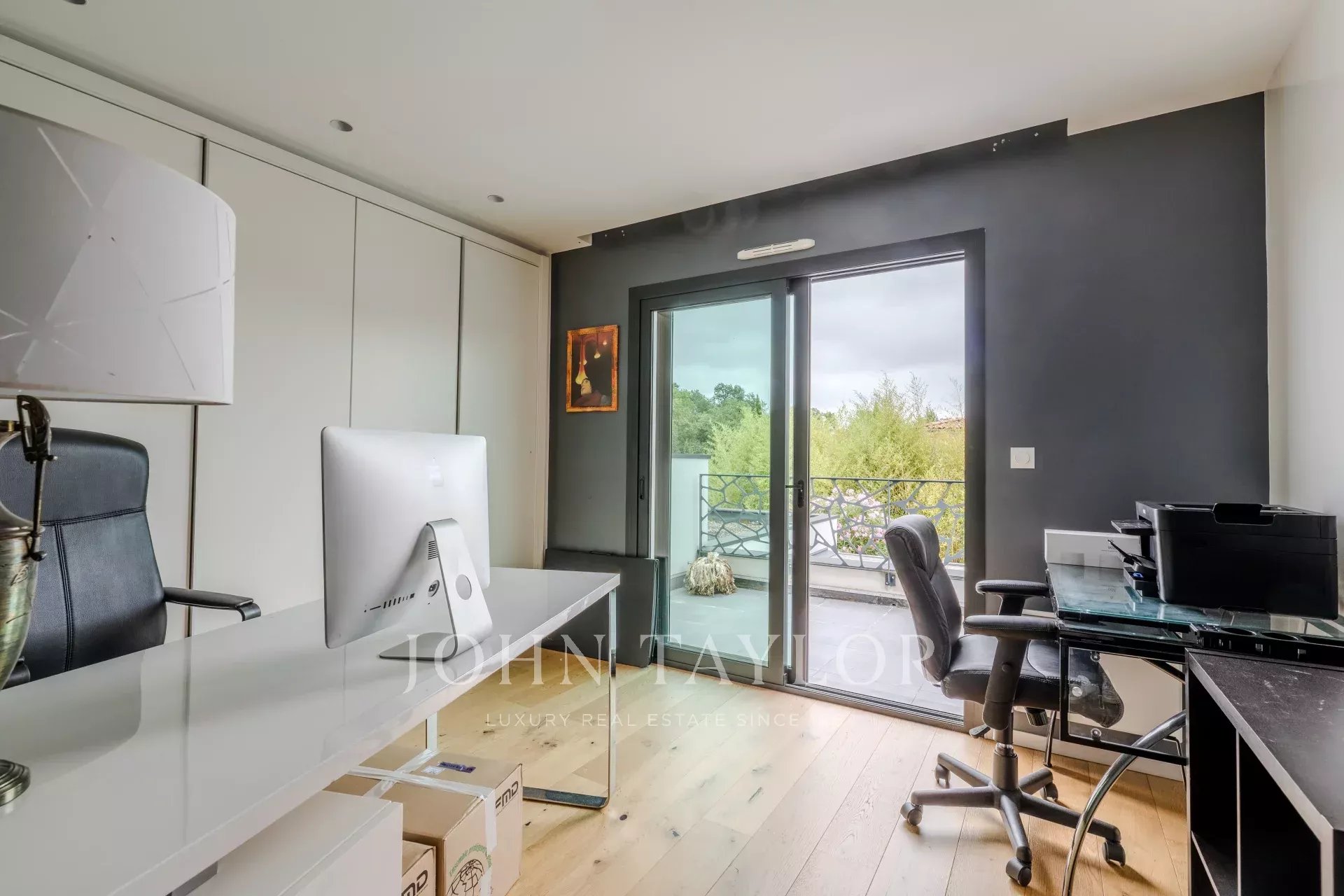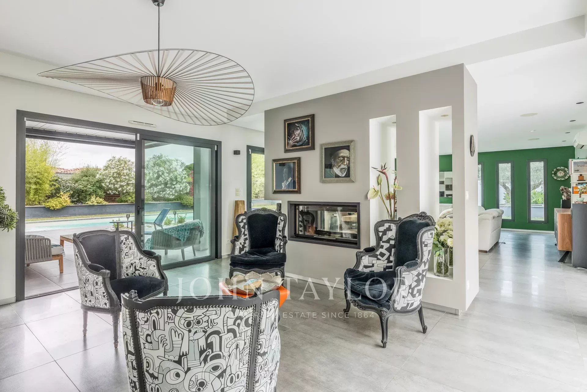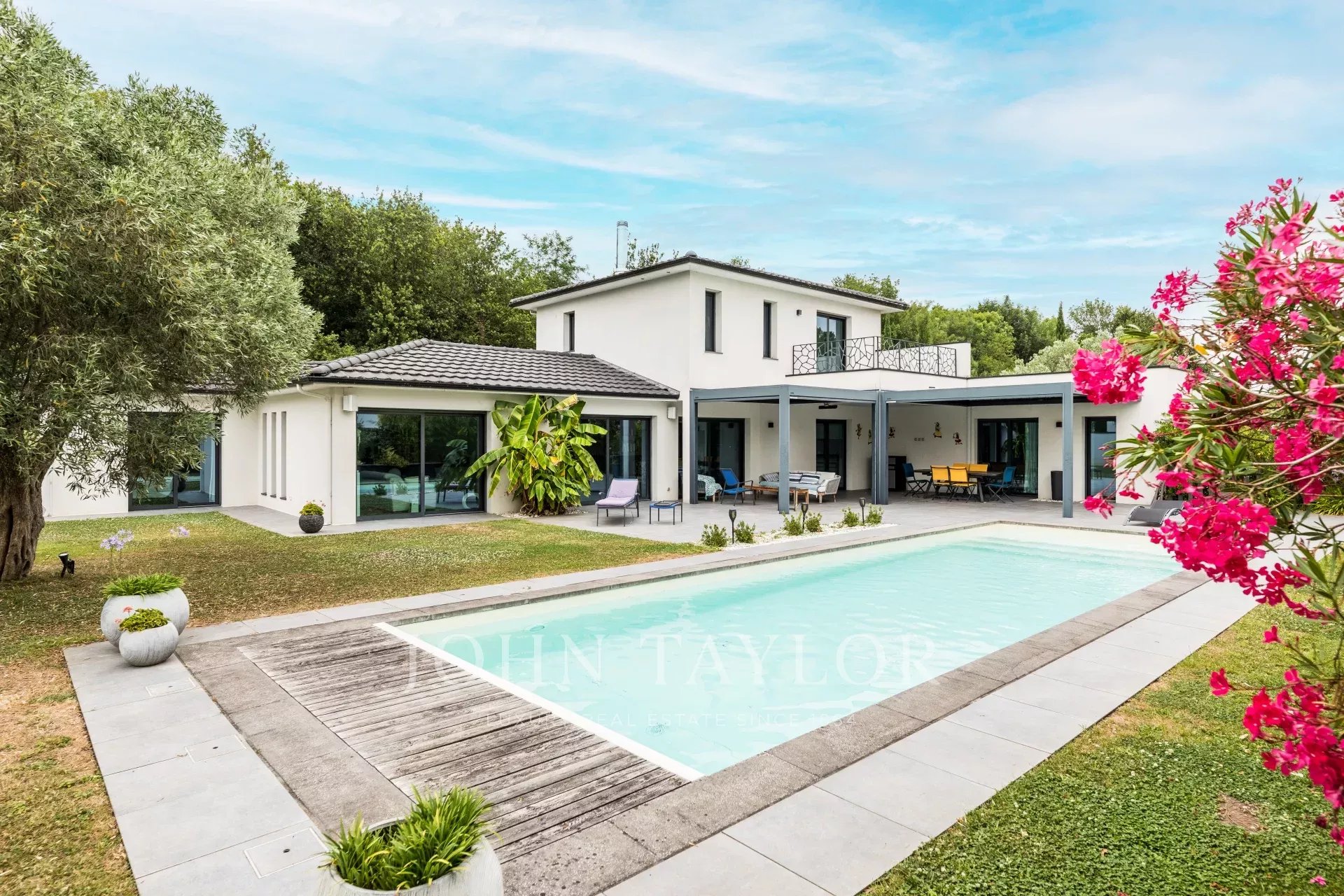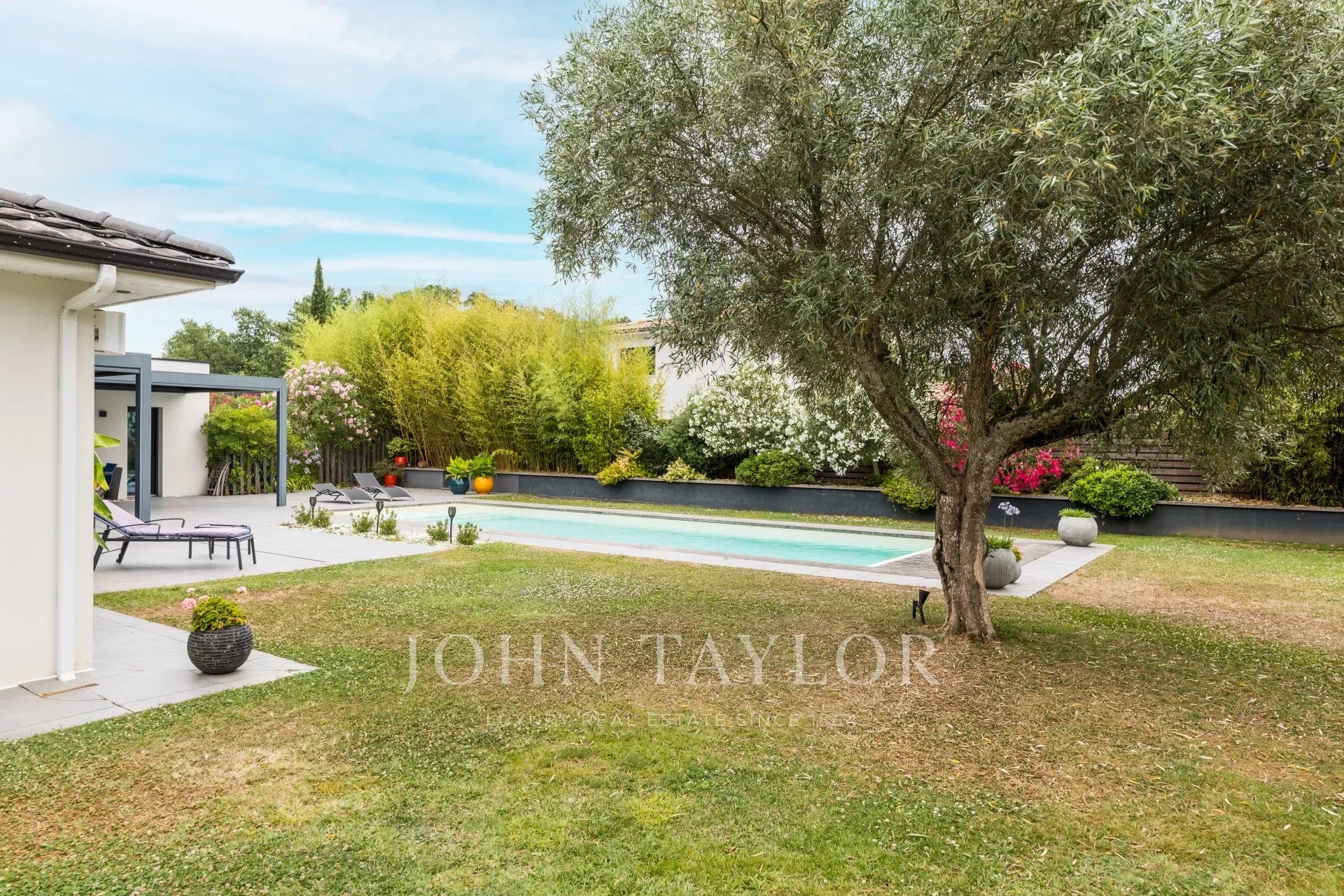 Located on the sought-after heights of Bouliac, in an exceptional residential environment, this remarkable contemporary villa of over 250 m² offers a rare living environment, just 15 minutes from the center of Bordeaux.Nestled out of sight at the end of a private driveway, it sits on a superb south-facing landscaped plot of over 2,000 m², enhanced by a 13 x 4 m heated saltwater swimming pool with submerged electric curtain.Most of the villa is built on one level, and its spaciousness, luminosity and resolutely contemporary feel are immediately appealing. The 90 m² reception room, bathed in light thanks to large bay windows, opens onto several terraces and boasts an elegant double hearth fireplace. A fully equipped open kitchen harmoniously completes this living space.The house features a superb master suite with custom-made dressing room, top-of-the-range bathroom (double washbasin, double Italian shower), separate toilet and unobstructed view of the garden. A second suite, also on the first floor, boasts generous space and its own shower room. Two offices, a linen room and a laundry complete this level.Upstairs, two bedrooms with storage space share a modern shower room. One has direct access to a private terrace. A TV lounge - or additional bedroom - completes the night space.A large garage, a cellar, a workshop and a 45 m² outbuilding offer numerous possibilities.The property features underfloor heating by heat pump, reversible air conditioning, aluminum frames, motorized roller shutters, fiber optics, Verisure alarm, automatic watering, bioclimatic pergola, videophone, electric gate, robot lawnmower...Close to schools, shops and transport, this villa harmoniously combines contemporary architecture, modern comfort and a privileged location.
