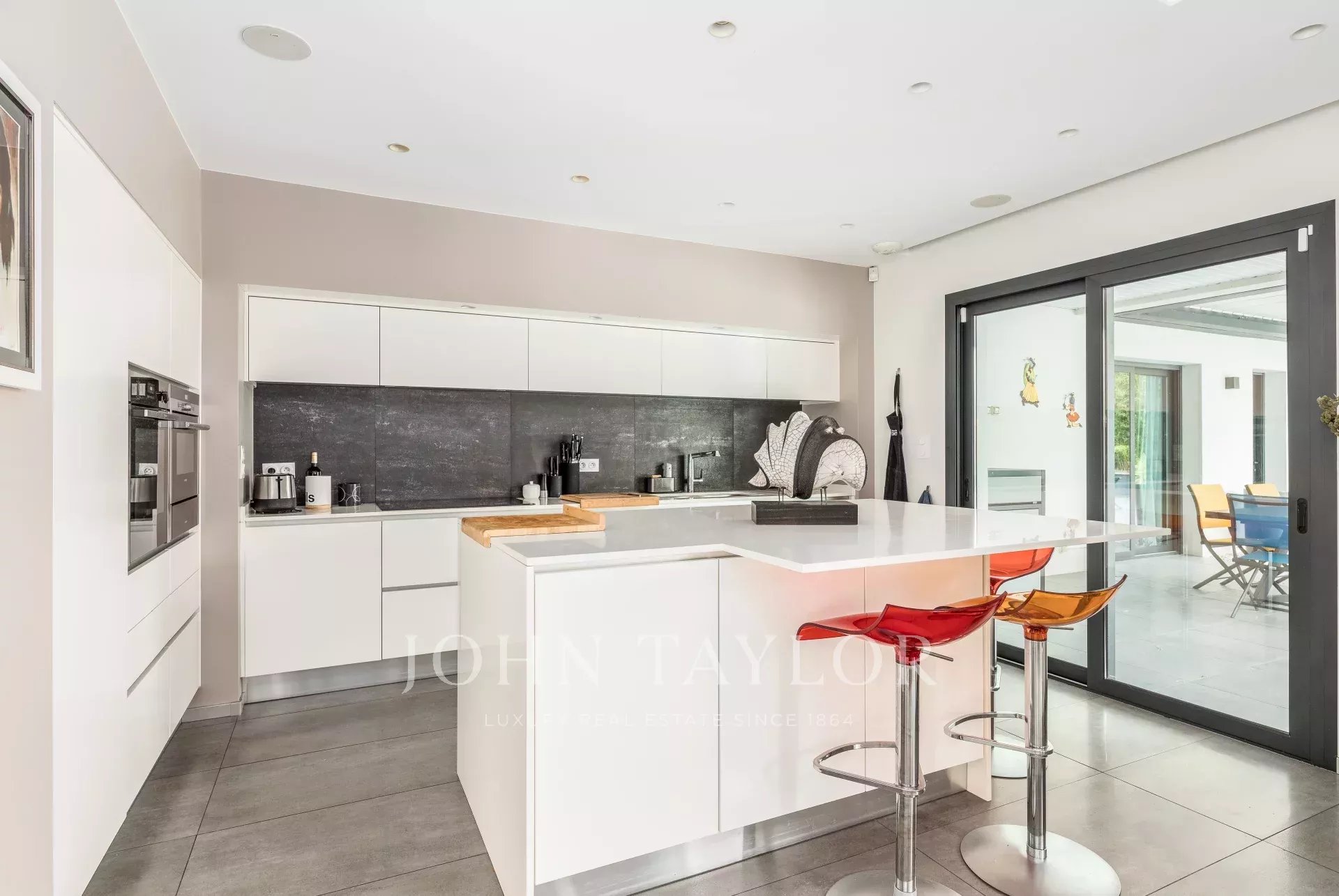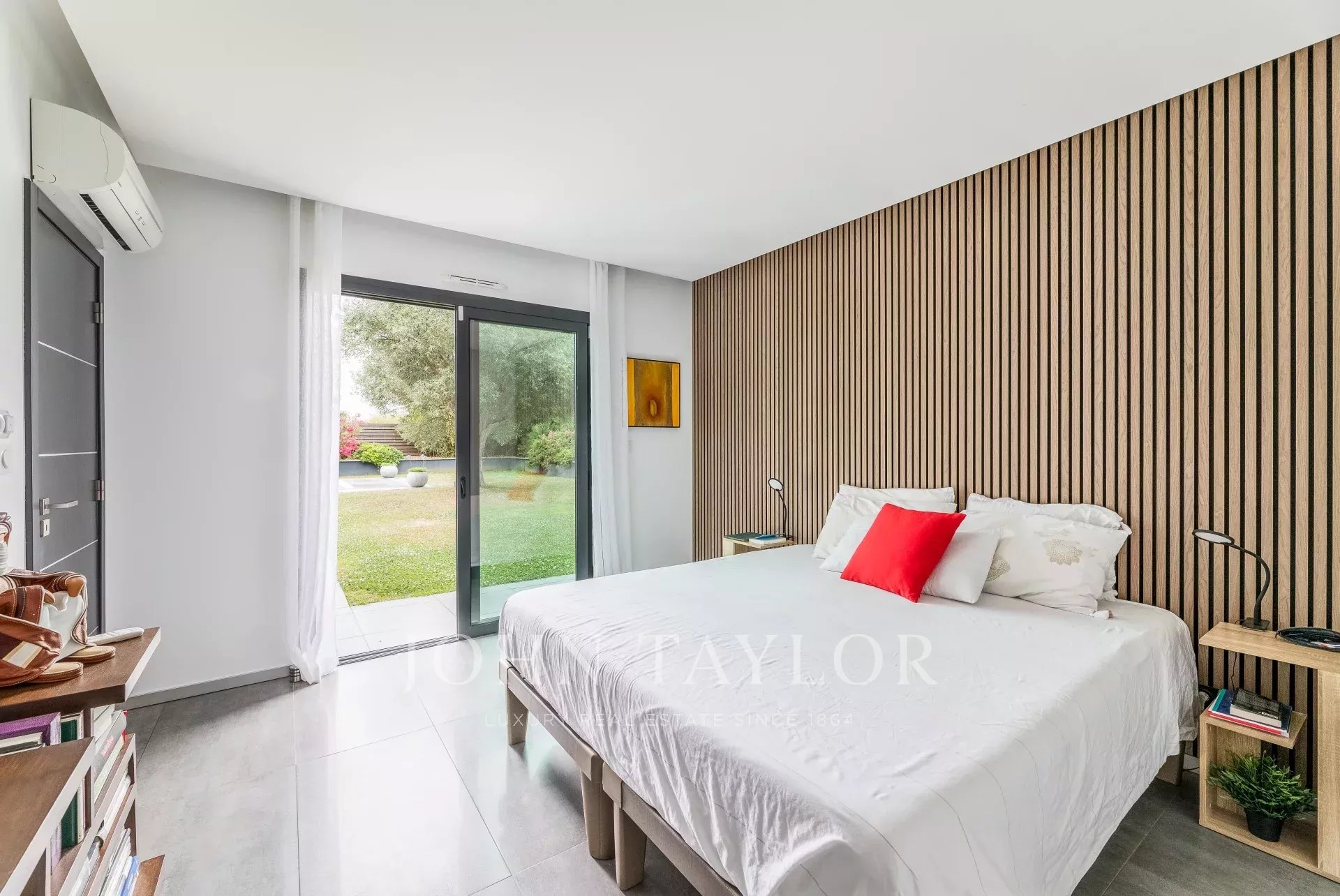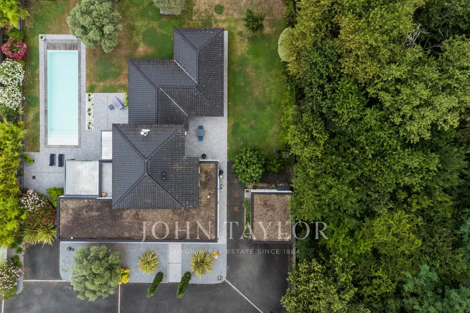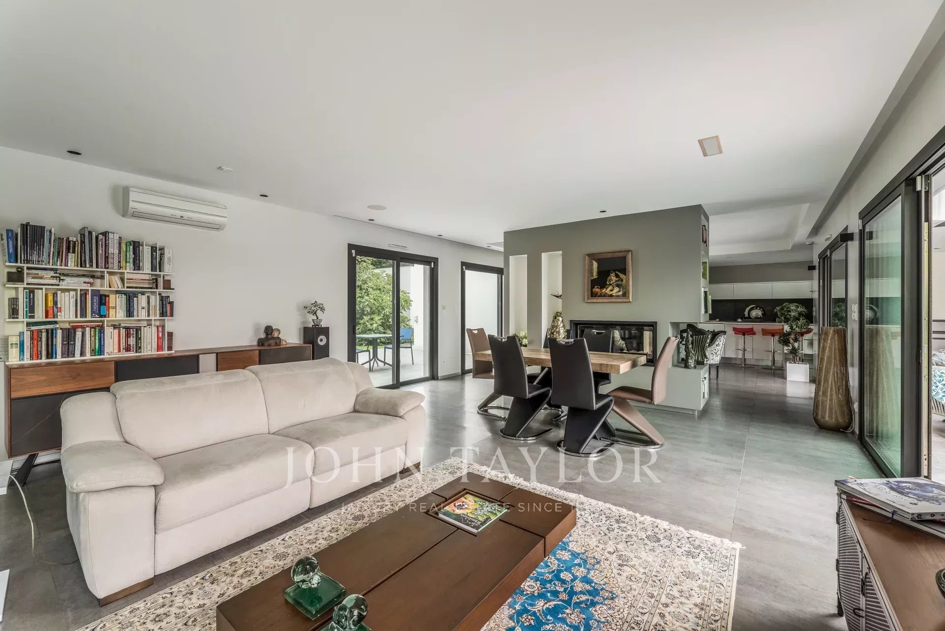 Located on the sought-after heights of Bouliac, in an exceptional residential environment, this remarkable contemporary villa of over 250 m² offers a rare living environment, just 15 minutes from the center of Bordeaux.Nestled out of sight at the end of a private driveway, it sits on a superb south-facing landscaped plot of over 2,000 m², enhanced by a 13 x 4 m heated saltwater swimming pool with submerged electric curtain.Most of the villa is built on one level, and its spaciousness, luminosity and resolutely contemporary feel are immediately appealing. The 90 m² reception room, bathed in light thanks to large bay windows, opens onto several terraces and boasts an elegant double hearth fireplace. A fully equipped open kitchen harmoniously completes this living space.The house features a superb master suite with custom-made dressing room, top-of-the-range bathroom (double washbasin, double Italian shower), separate toilet and unobstructed view of the garden. A second suite, also on the first floor, boasts generous space and its own shower room. Two offices, a linen room and a laundry complete this level.Upstairs, two bedrooms with storage space share a modern shower room. One has direct access to a private terrace. A TV lounge - or additional bedroom - completes the night space.A large garage, a cellar, a workshop and a 45 m² outbuilding offer numerous possibilities.The property features underfloor heating by heat pump, reversible air conditioning, aluminum frames, motorized roller shutters, fiber optics, Verisure alarm, automatic watering, bioclimatic pergola, videophone, electric gate, robot lawnmower...Close to schools, shops and transport, this villa harmoniously combines contemporary architecture, modern comfort and a privileged location.