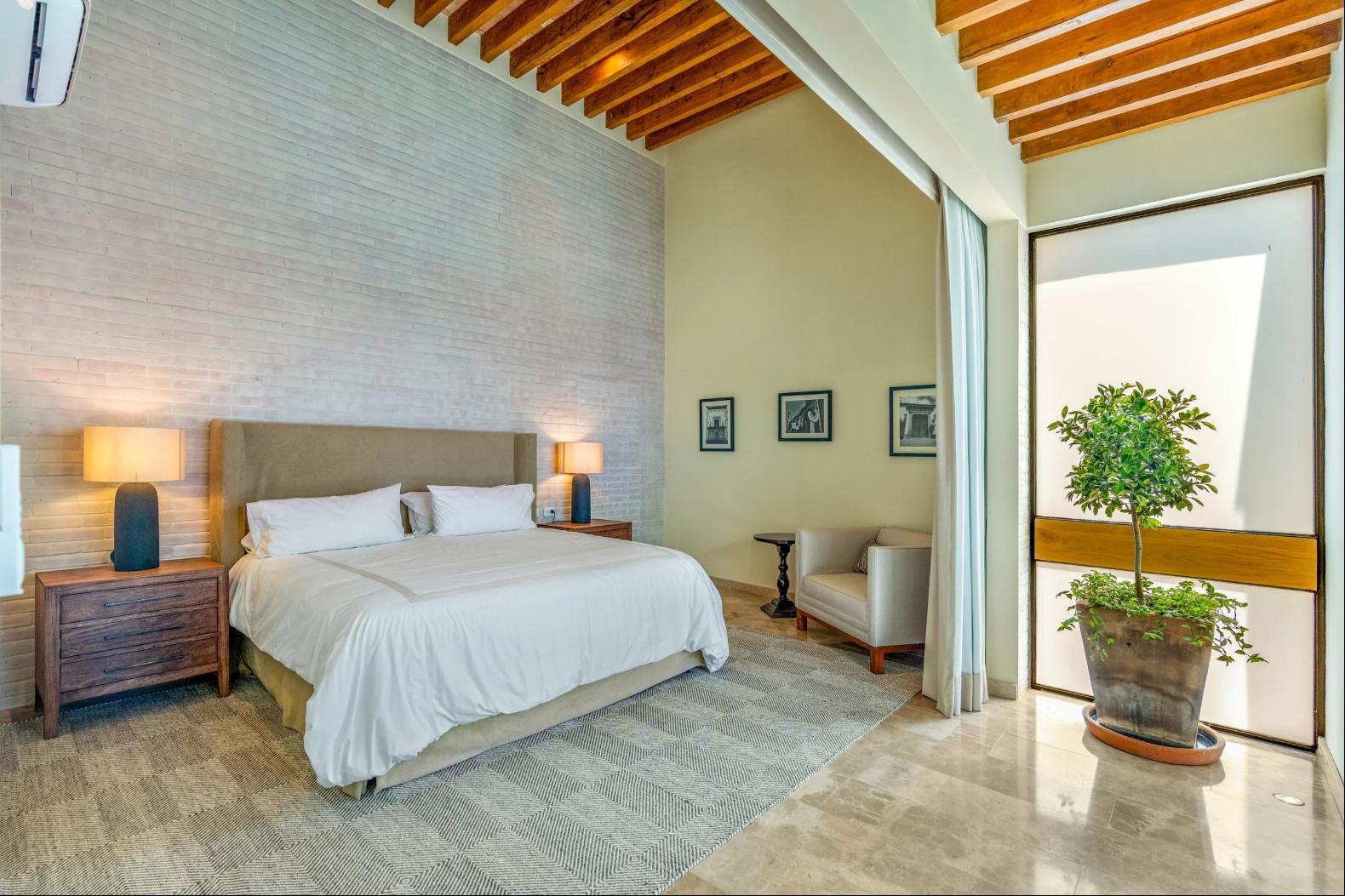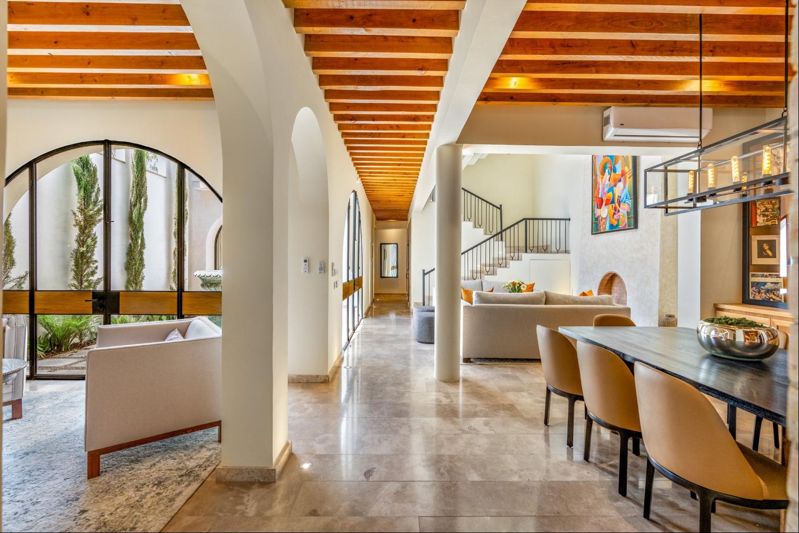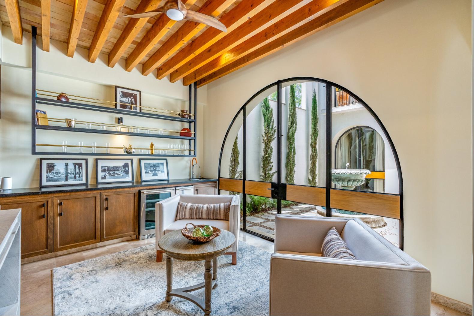 This beautiful home is located in the sought-after gated community of Acuerla. A soft contemporary design filled with natural light, it offers stylish comfort with a relaxed elegance. Marble floors run throughout the home, adding a touch of timeless sophistication.The living room is a dramatic two-story space, with the staircase serving as an architectural feature and part of the overall arch motif found throughout the home. The main entertaining areas flow seamlessly and open onto an interior patio, where the gentle sound of a trickling fountain adds a tranquil ambiance.The kitchen is a delight, featuring a large arched window that welcomes the morning sun. Also on the main level is a bedroom, providing the option for single-level living.Upstairs, you'll find a guest room with an ensuite bath and a generous primary suite that opens to a private plunge pool. The primary suite also includes a cozy sitting area perfect for relaxing in privacy.The rooftop level is a true highlight, offering panoramic views and multiple spaces for entertaining, including a grilling area, bar, dining space, and outdoor living room.Additional features include a private elevator, providing easy access to all levels of the home, and a garage.