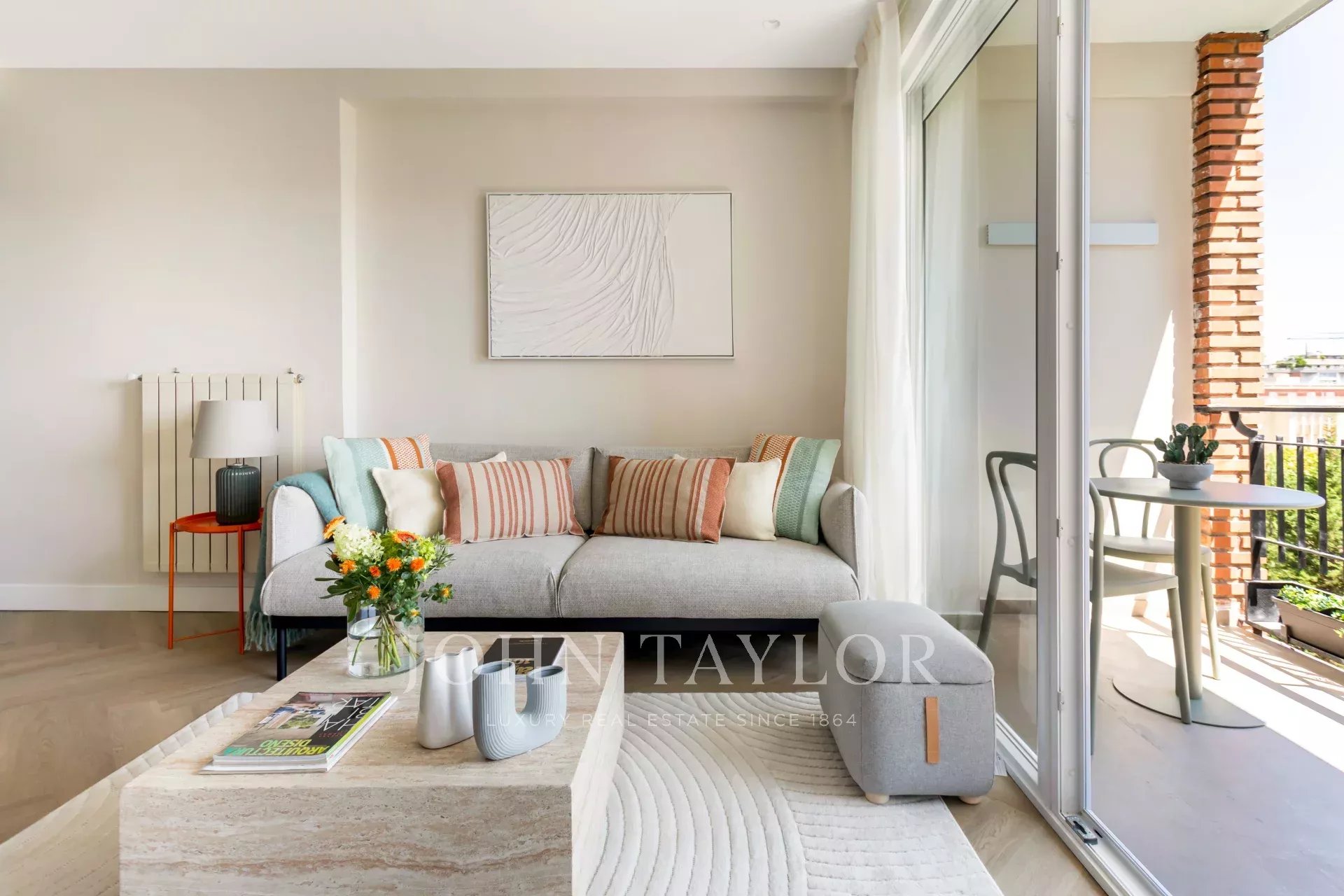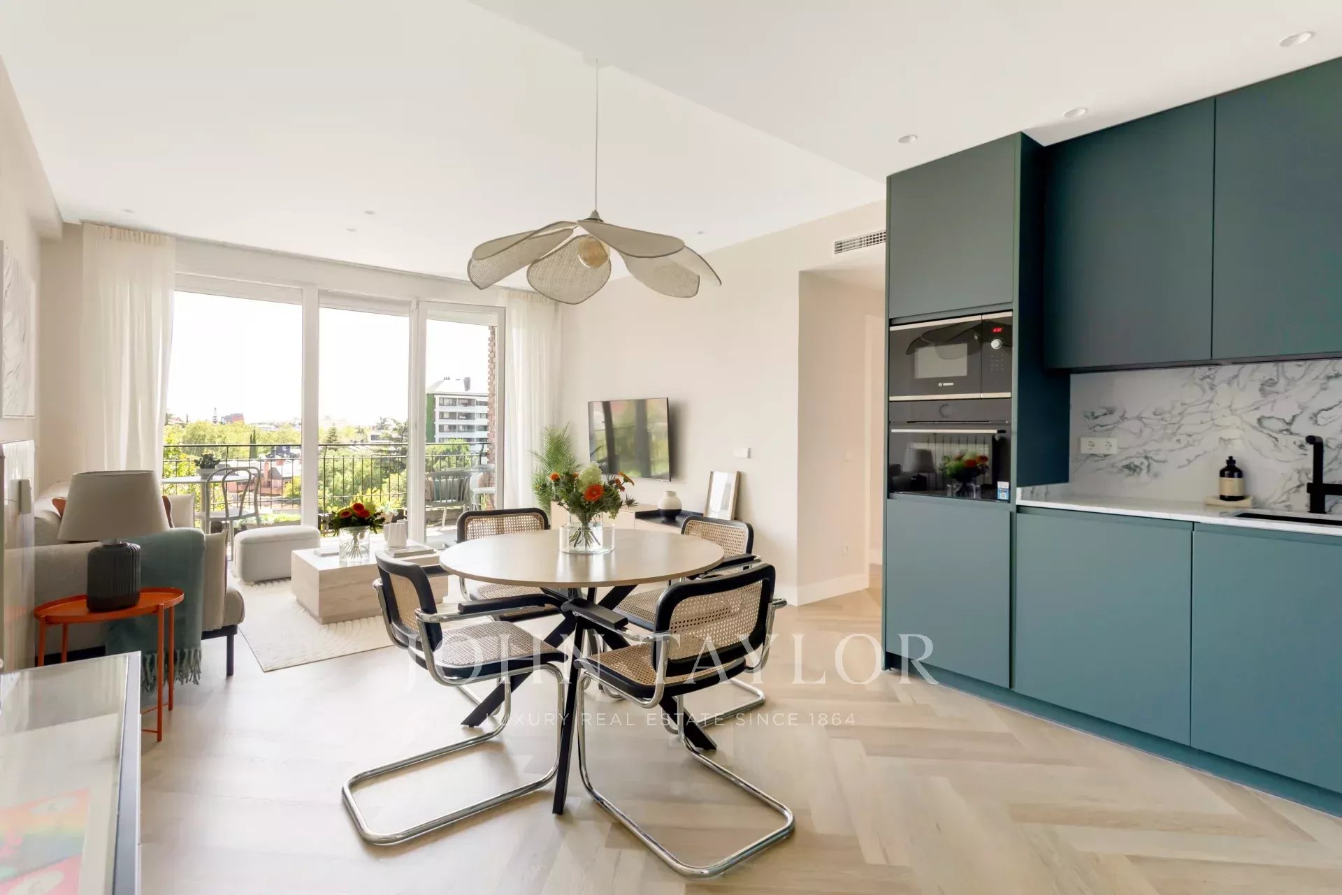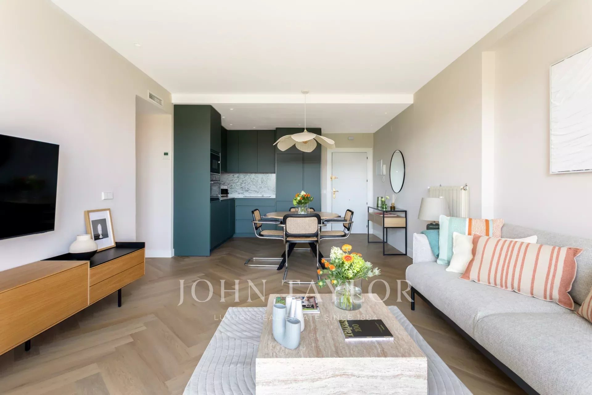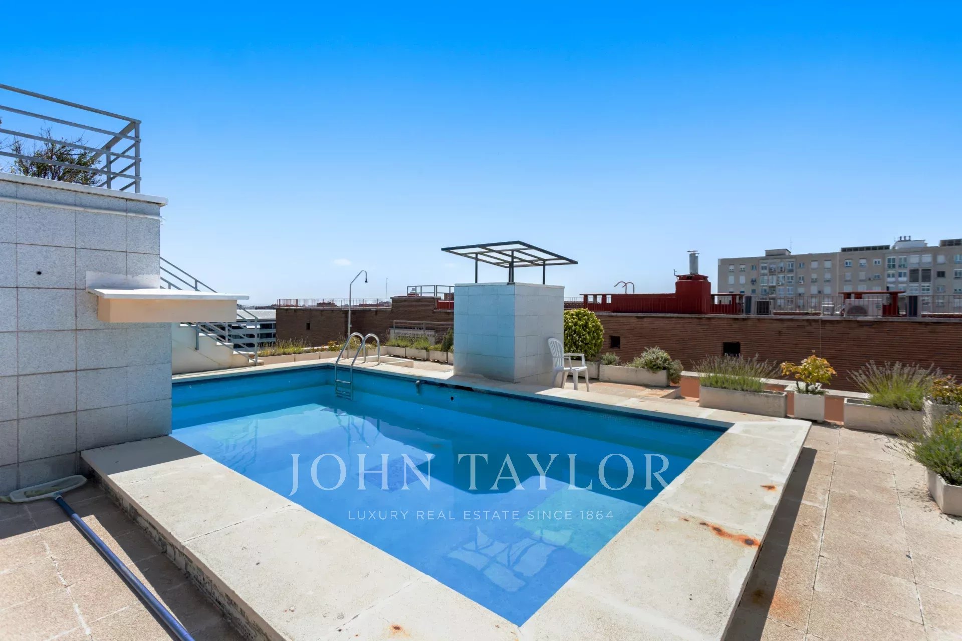 HOUSING AVAILABLE FROM JUNE 2026. The property is located on the sixth floor of a well-maintained building with a 24-hour porter service. Solarium and swimming pool on the top floor of the building.The apartment has been completely renovated, paying attention to every detail in both the renovation and interior design. It has an area of 91 m² distributed in a living-dining room with an integrated kitchen, a habitable terrace facing east with fabulous views of Madrid.The night area consists of two bedrooms, the main bedroom with an en-suite bathroom, a secondary bedroom facing south, and a full bathroom in the hallway.The property is rented fully furnished.Located on Padre Damián Street, one of the most desirable streets in Nueva España, due to its excellent location, proximity to sports areas, its commercial and gastronomic offerings, and the large green areas surrounding it.The property is fully exterior, boasts excellent natural light, central heating with individual consumption devices, and central air conditioning. Long-term contract.Undoubtedly, we are dealing with a charming, practical home ready to move in. Long-term rent. Individualized consumption to be paid by the tenant. Lease conditions include the current month's rent, a security deposit equivalent to one month's rent, and two months' rent as additional guarantee.