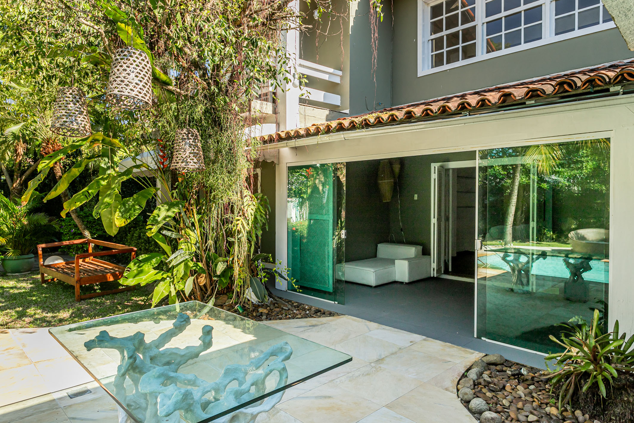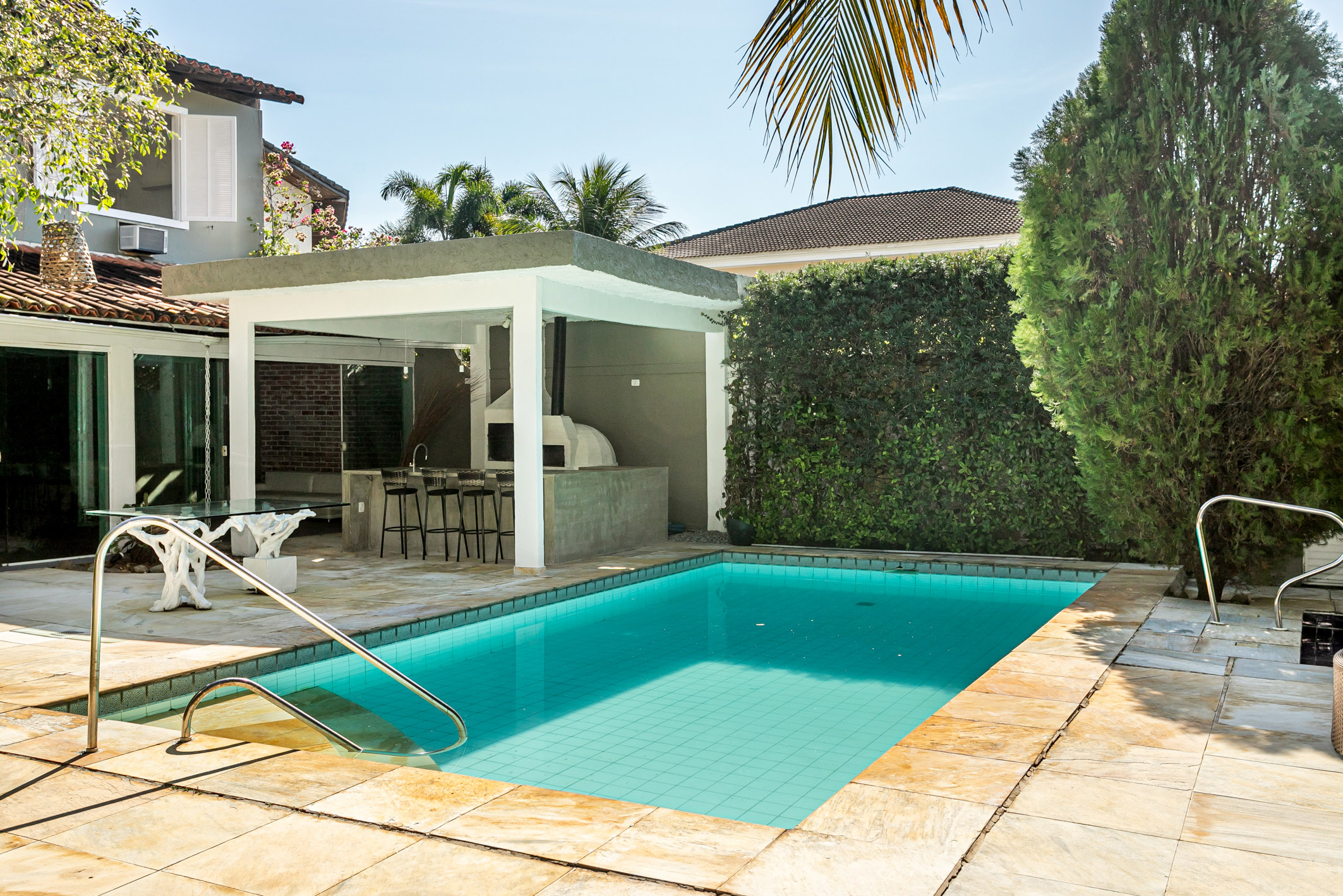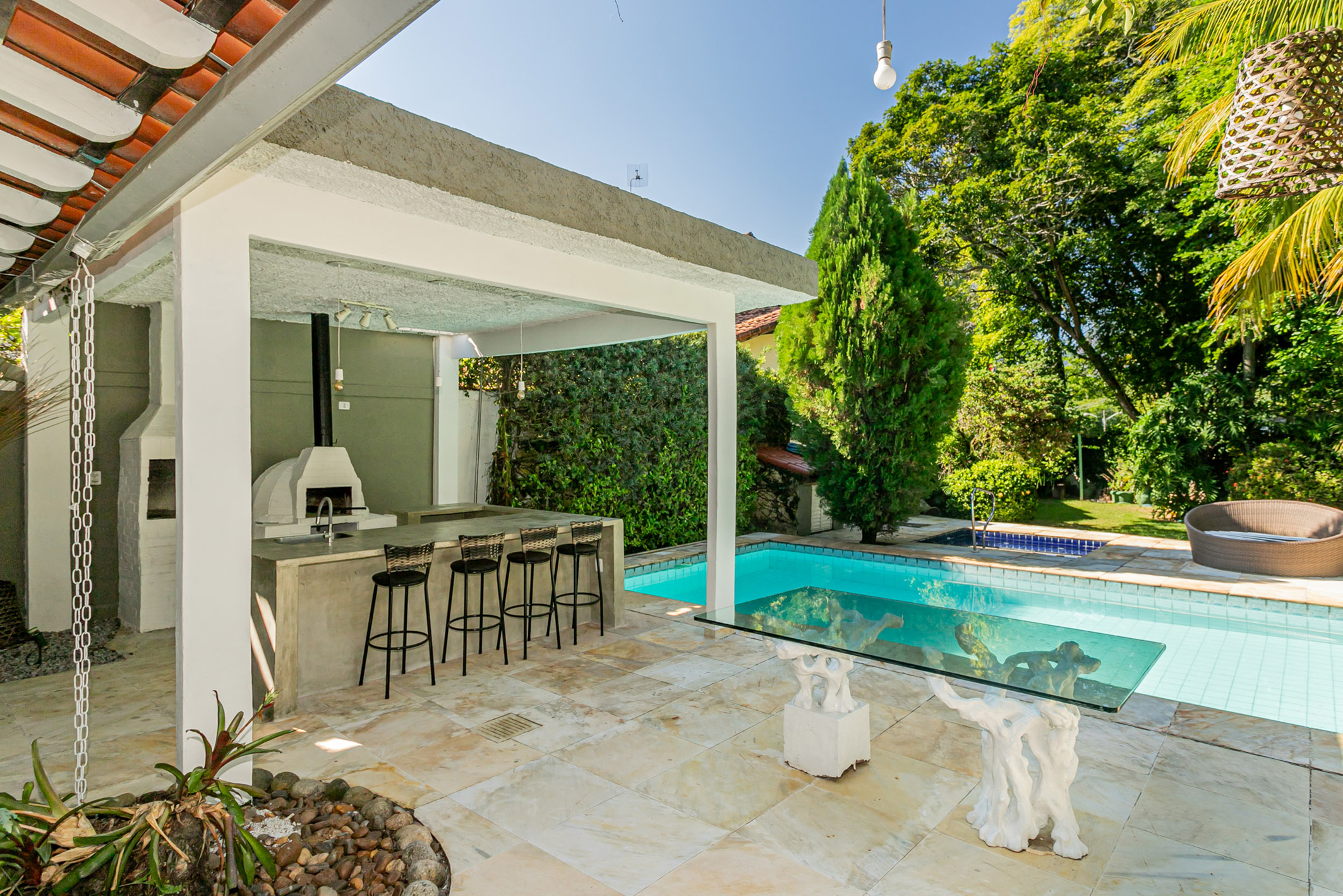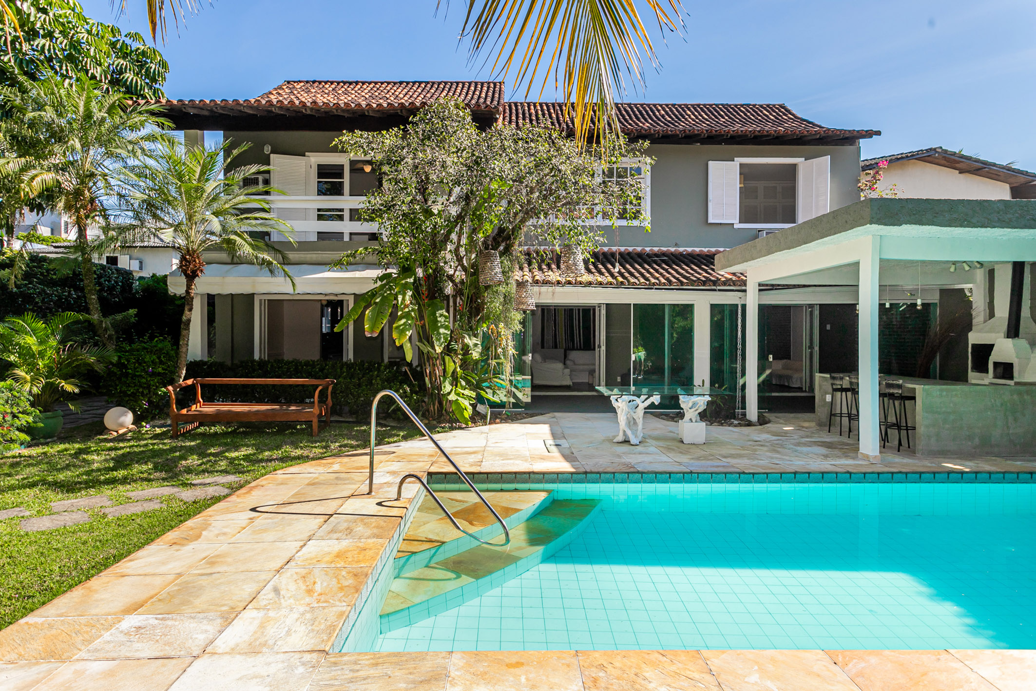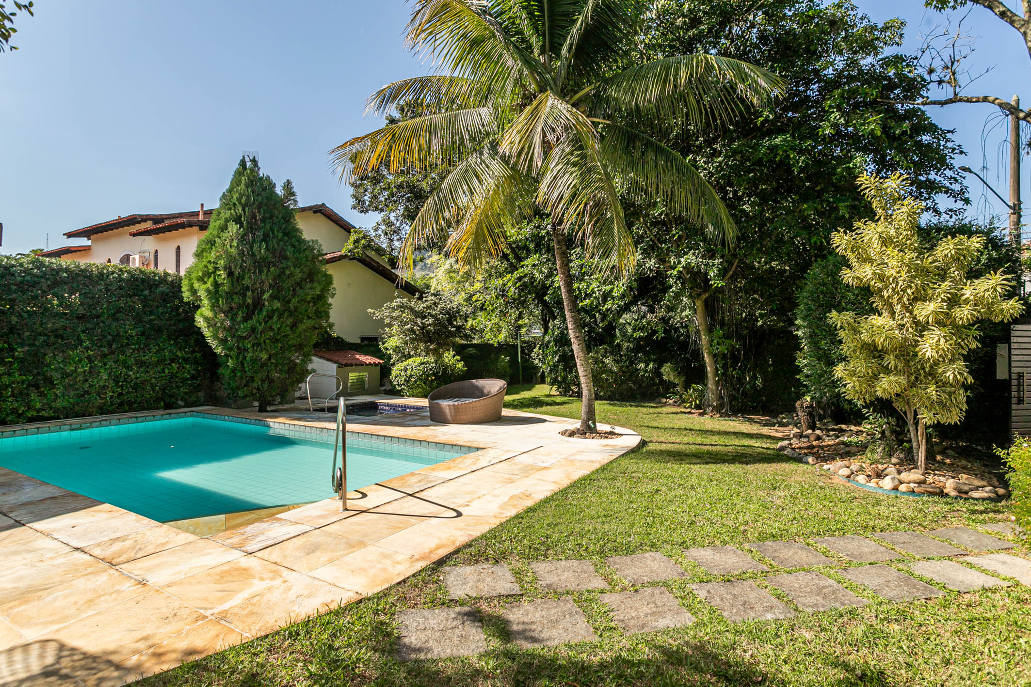 Spacious and well-distributed, this colonial-style house is ideal for those who wish to enjoy nature. Recently renovated with new flooring and paint, it offers a leisure area with a garden, three verandas, a pool with hydromassage, barbecue area, and a small soccer field. Located in an elegant, private, and exclusive condominium at the entrance of Barra, it has easy access to schools, shopping centers, and markets. The house comprises five bedrooms, three of them suites, a large living room, guest lavatory, dining room, and a planned kitchen with an excellent outdoor area. Garage for three cars. The condominium features 24-hour monitored security.