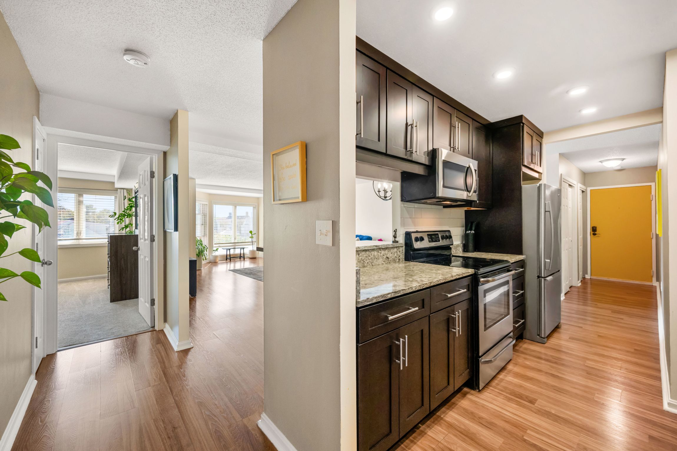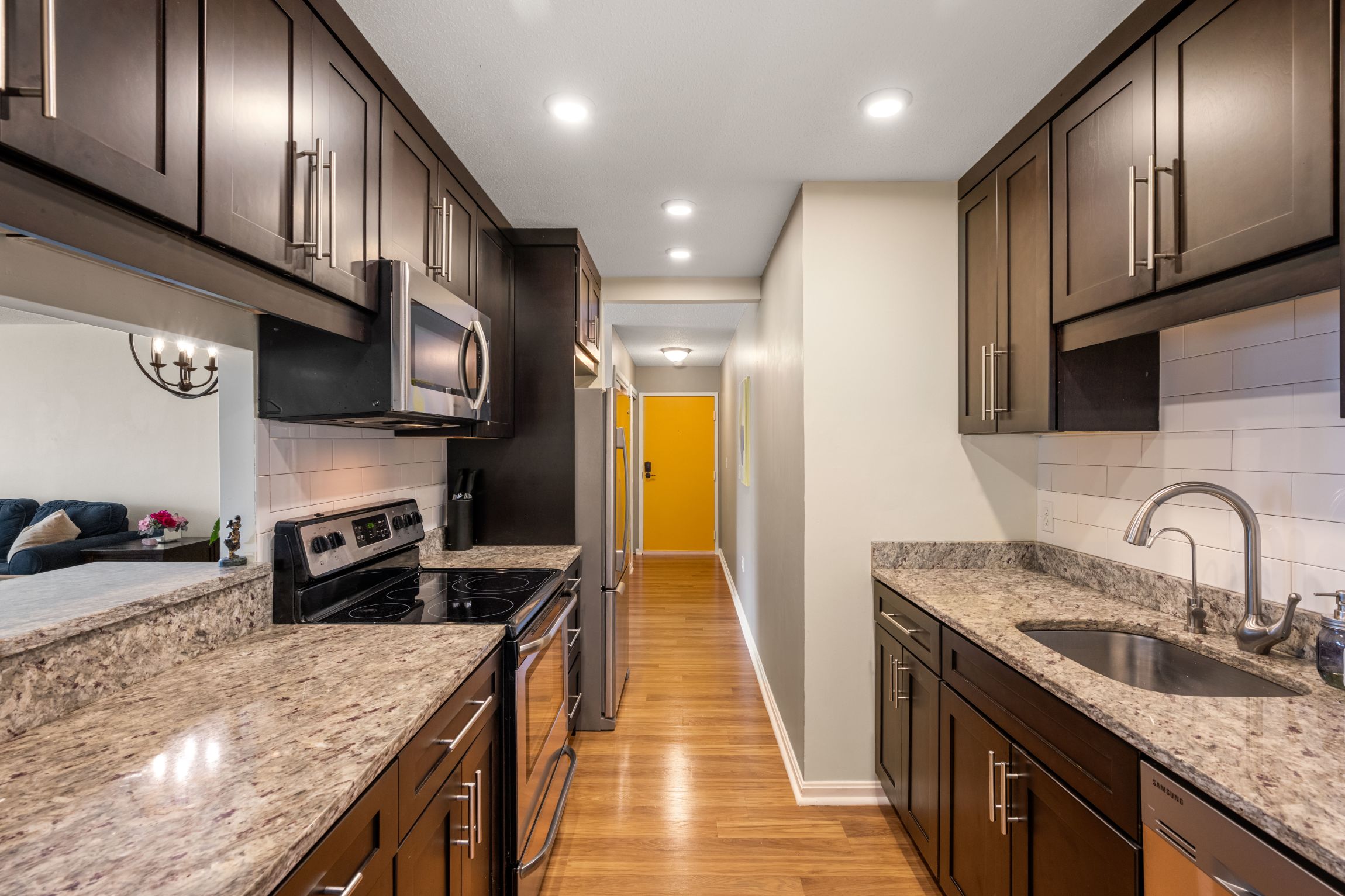 This light filled corner unit home in an elevator building has a fantastic open floor plan and beautifully renovated kitchen. The expansive living/dining area showcases floor to ceiling bay windows and a cut out window to the kitchen so the cook can socialize while hosting guests. The espresso colored cabinets, upgraded countertops and stainless steel appliances are a visual treat. There are two good-sized bedrooms and lots of closet space, including two double entry closets, a linen closet and double closets in the main bedroom. And the piece de resistance, direct indoor access garage parking with storage! Building roof 2022 and condo HVAC 2022. This building is pet friendly (see restrictions) and has laundry on every floor. Located in close proximity to I-93, public transportation, Wegman's grocery, Assembly Row and Medford Square. Taken off the market for seller to move in during new home renovations.