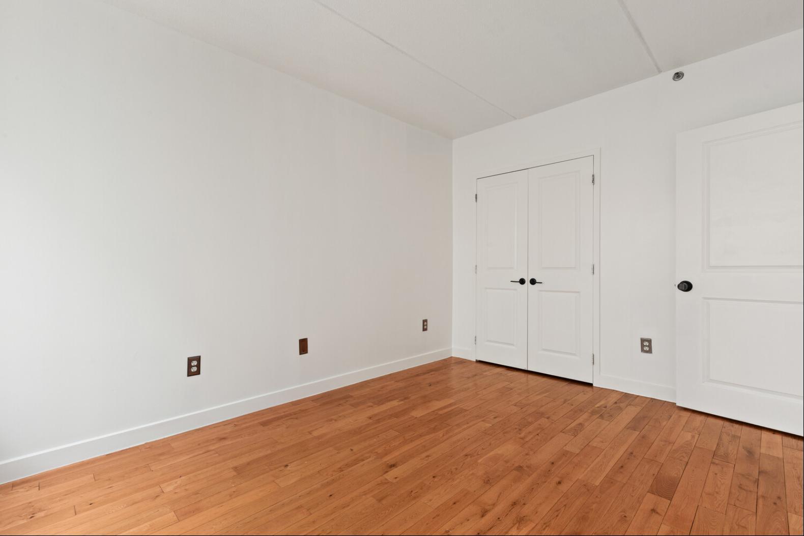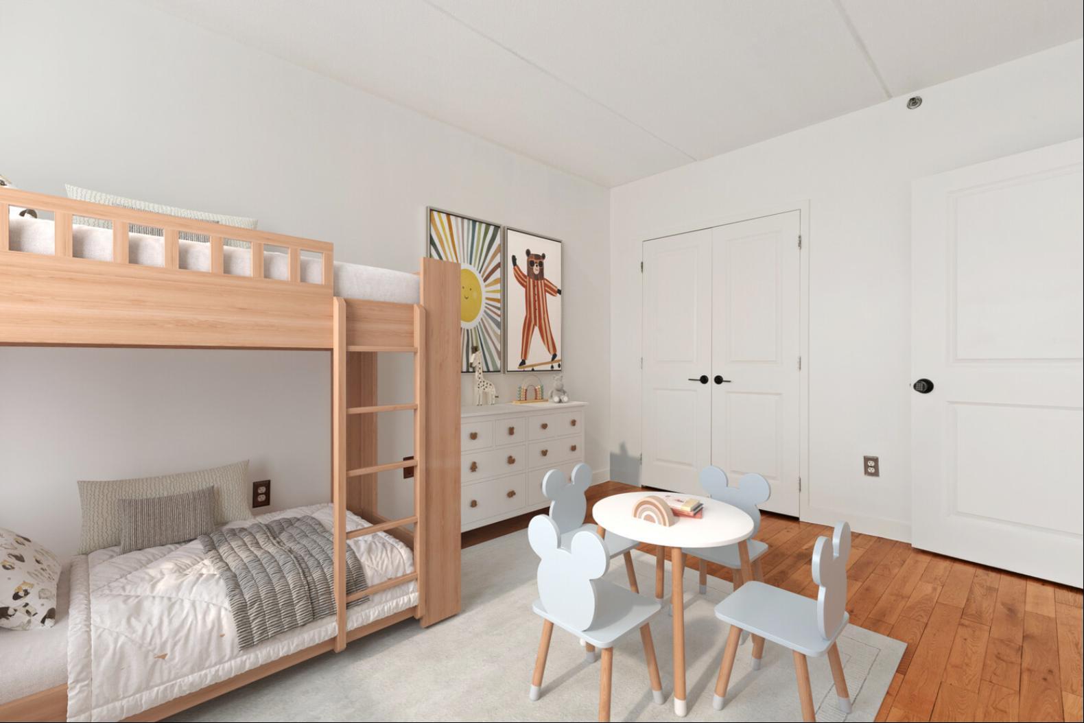 This unit is 797 square feet, has hardwood floors throughout, and large windows flood the space with natural light. The apartment overlooks the residents' private landscaped outdoor space.