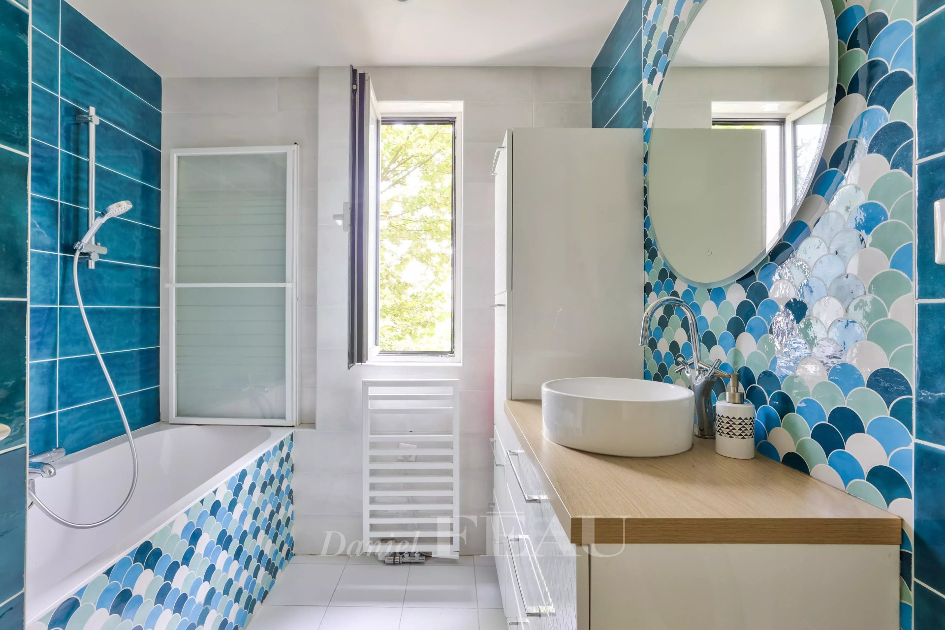 Triple-facing and particularly bright and peaceful, it includes a spacious living/reception room and dining room opening onto a wide balcony, an equipped open-plan kitchen, three bedrooms, a dressing room, a bathroom, a shower room and a separate wc.
