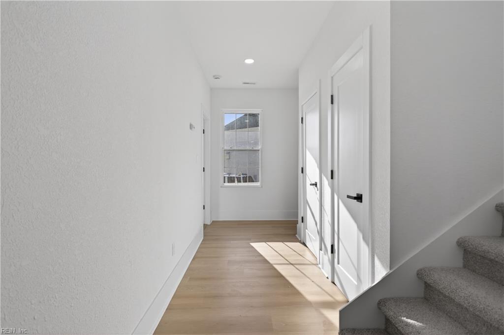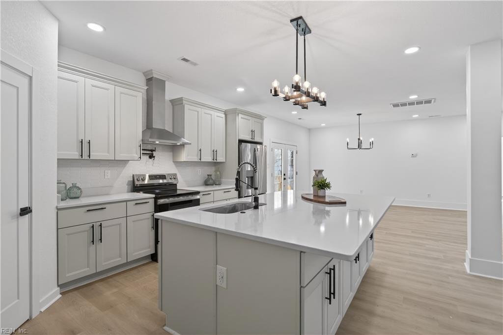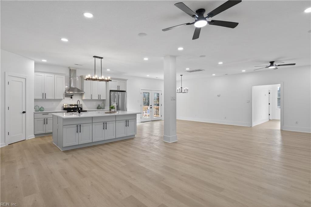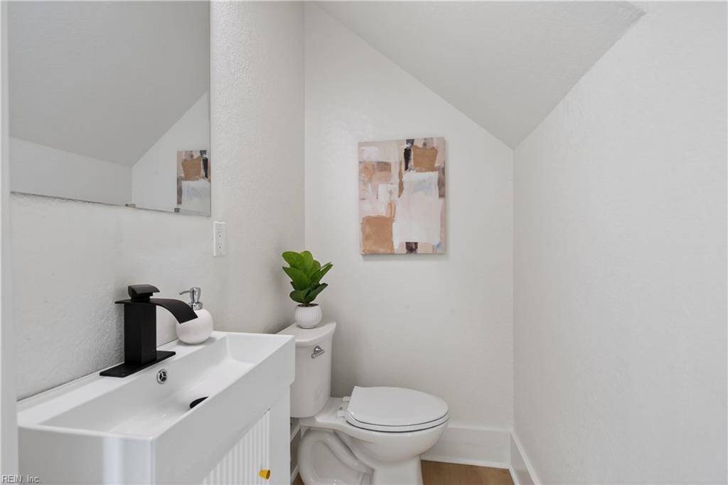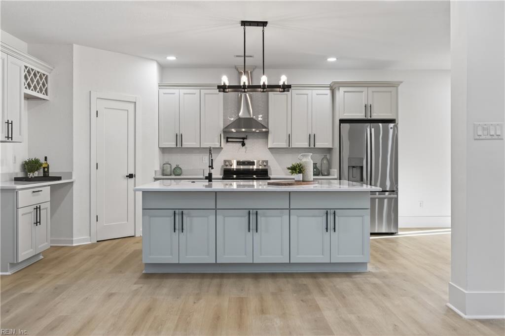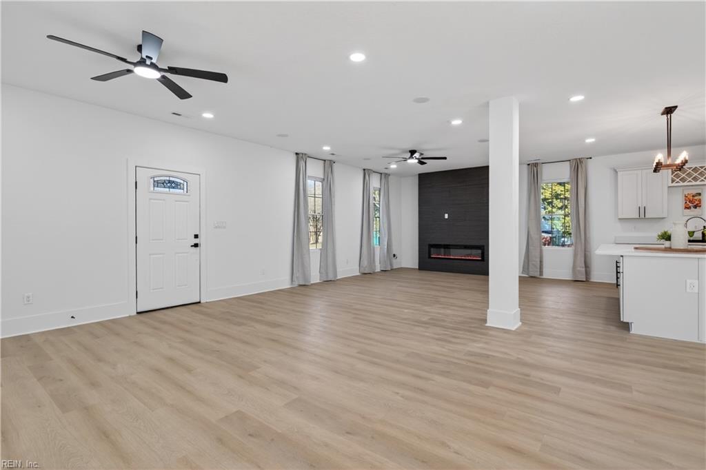 Where contemporary design meets tranquil waterfront living. home in the established Sweetbriar neighborhood of Portsmouth. The open-concept main level is perfect for entertaining and features a spacious living area with a stunning fireplace, dining space, and a versatile flex area ideal for an office, reading nook, or game table. The Chef's kitchen is appointed with all-new stainless steel appliances, an oversized quartz countertop island, a walk-in pantry and side bar Sliding glass doors from the dining area lead to a waterfront-facing deck overlooking the water and a generous backyard perfect for relaxing or entertaining. The first floor includes a private bedroom with ensuite bath. Upstairs offers a laundry area, two bedrooms with a shared hall bath, and an additional ensuite bedroom with walk-in closet. Two-car garage and driveway provide ample parking and storage.