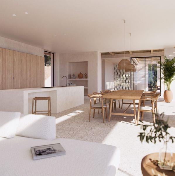 To the right of the hallway, you enter a large open plan area where there is a state-of-the-art fully fitted kitchen, dining area and at the furthest end, a living room with fireplace. This whole space is surrounded by large glass openings that give access to the wonderful front facing verandas as well as to the right side of the villa, where there is a beautiful, covered terrace, seating areas and the stunning pool.