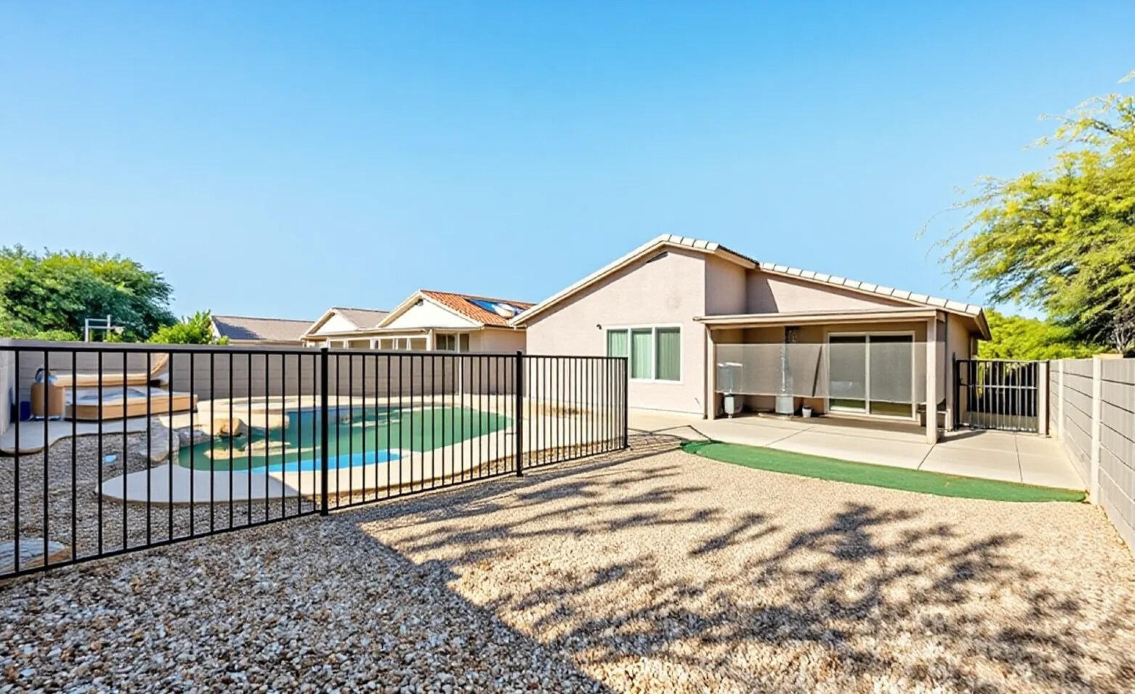 Nestled in the beautiful and tranquil Arroyo Ridge Subdivision, this meticulously maintained single-story home is the perfect place to create lasting memories. With three spacious bedrooms, two bathrooms, and a private backyard oasis, this home offers both comfort and style. The home's thoughtful design, modern features, and unbeatable location make it a must-see for anyone seeking a blend of convenience and serenity.The backyard of this home is where the magic truly happens. With a covered patio and low-maintenance landscaping, the outdoor space is perfect for relaxing, dining, or hosting gatherings with friends and family. The spacious backyard offers the privacy and peace you've been looking for, with the added bonus of a sparkling, fenced-in pool.