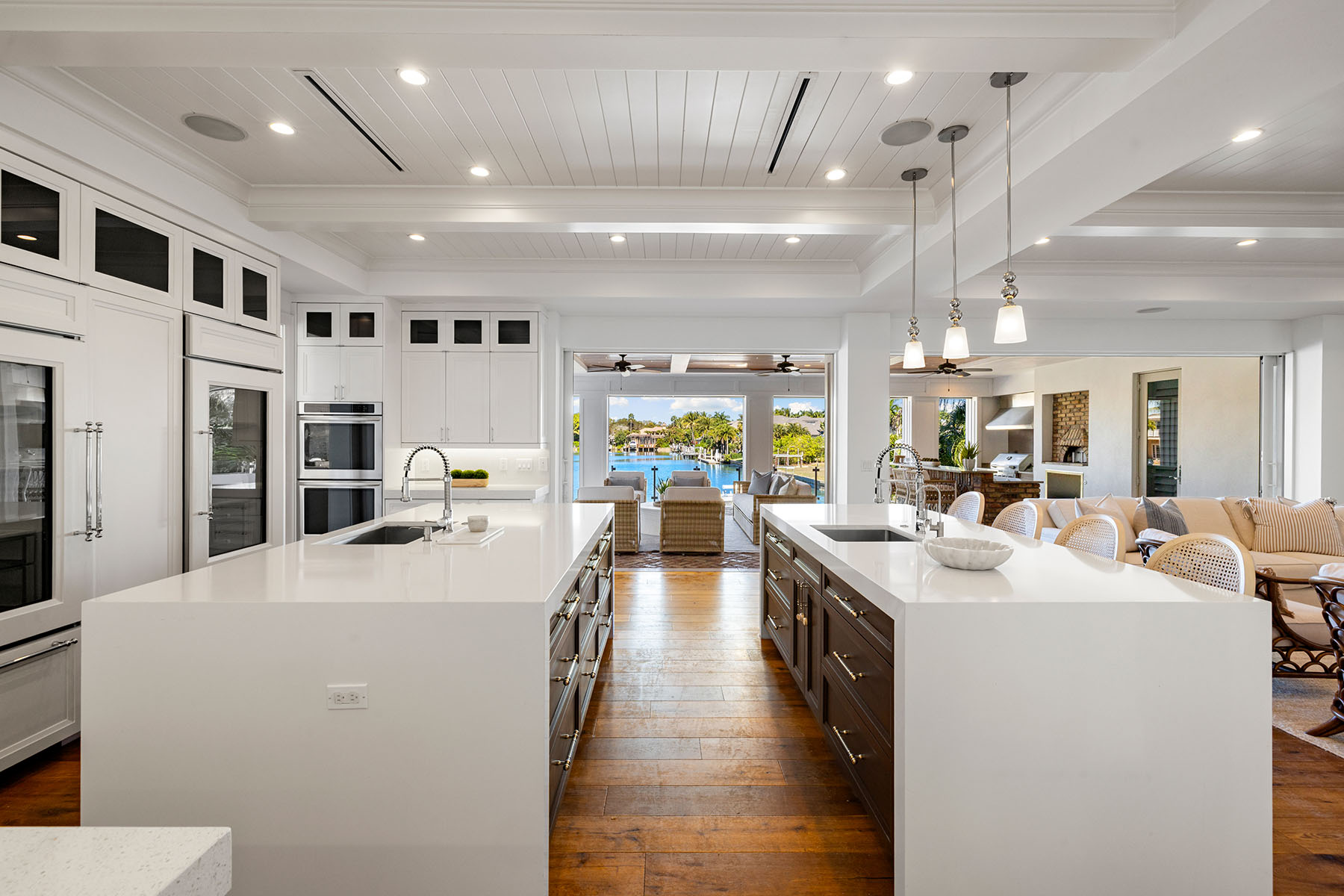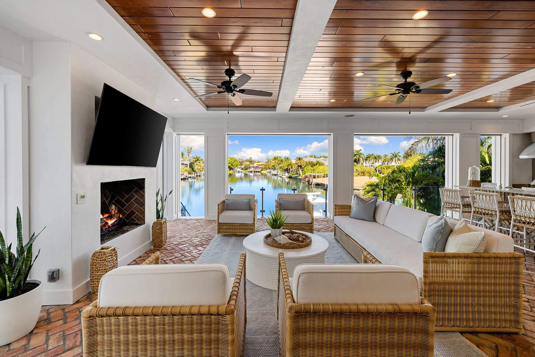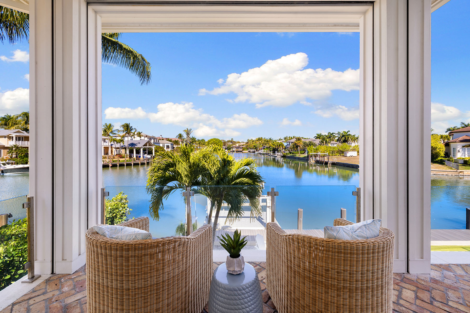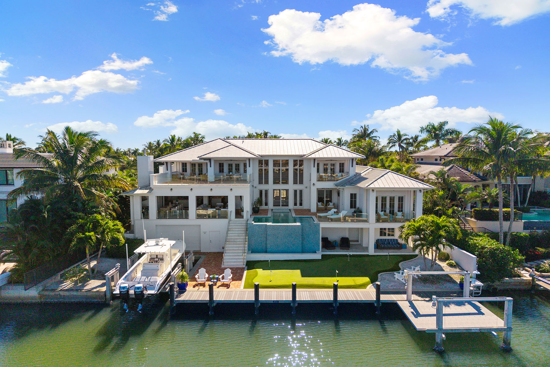 Views, Views, Views! An unparalleled expression of coastal grandeur, this extraordinary waterfront estate showcases luxury living in the heart of Aqualane Shores, one of Old Naples prestigious neighborhoods, just minutes to the Gulf of Mexico, a short distance to the beach and downtown's historic Third Avenue South. Positioned along one of the community's widest canals, this architectural masterpiece captures the essence of Old Naples elite lifestyle, where timeless design, masterful craftsmanship and effortless elegance converge. A boater's and car collector's dream, the 6,130-square-foot residence seamlessly blends old Florida charm with refined sophistication, highlighted by exquisite millwork, rich hardwood flooring, shiplap accents and tranquil water views throughout the home. Designed for grand entertaining and intimate gatherings, the open-concept layout features a dramatic two-story great room, a gourmet kitchen with dual islands, and a spacious family room flowing naturally to a covered lanai with outdoor kitchen, pizza oven and fireplace. The primary suite, on the main level, affords the utmost privacy and elegance, featuring dual dressing areas and an adjoining study that easily transitions into an additional guest suite when desired. A separate guest residence, reached by private elevator, offers a full kitchen and living area, ideal for extended stays or hosting with complete independence. Among the home's many refined appointments are a temperature-controlled 500-plus bottle wine room, a stylish wet bar, a secure safe room and an impressive 12-car garage designed for the connoisseur of fine automobiles. Outside, the resort-inspired grounds unfold with a waterfront vanishing-edge pool, spa, putting green and a private boat slip with a 34,000-pound lift offering seamless, bridge-free navigation from your backyard to the open Gulf of Mexico, where turquoise waters and endless horizons await, completing this extraordinary tropical retreat.