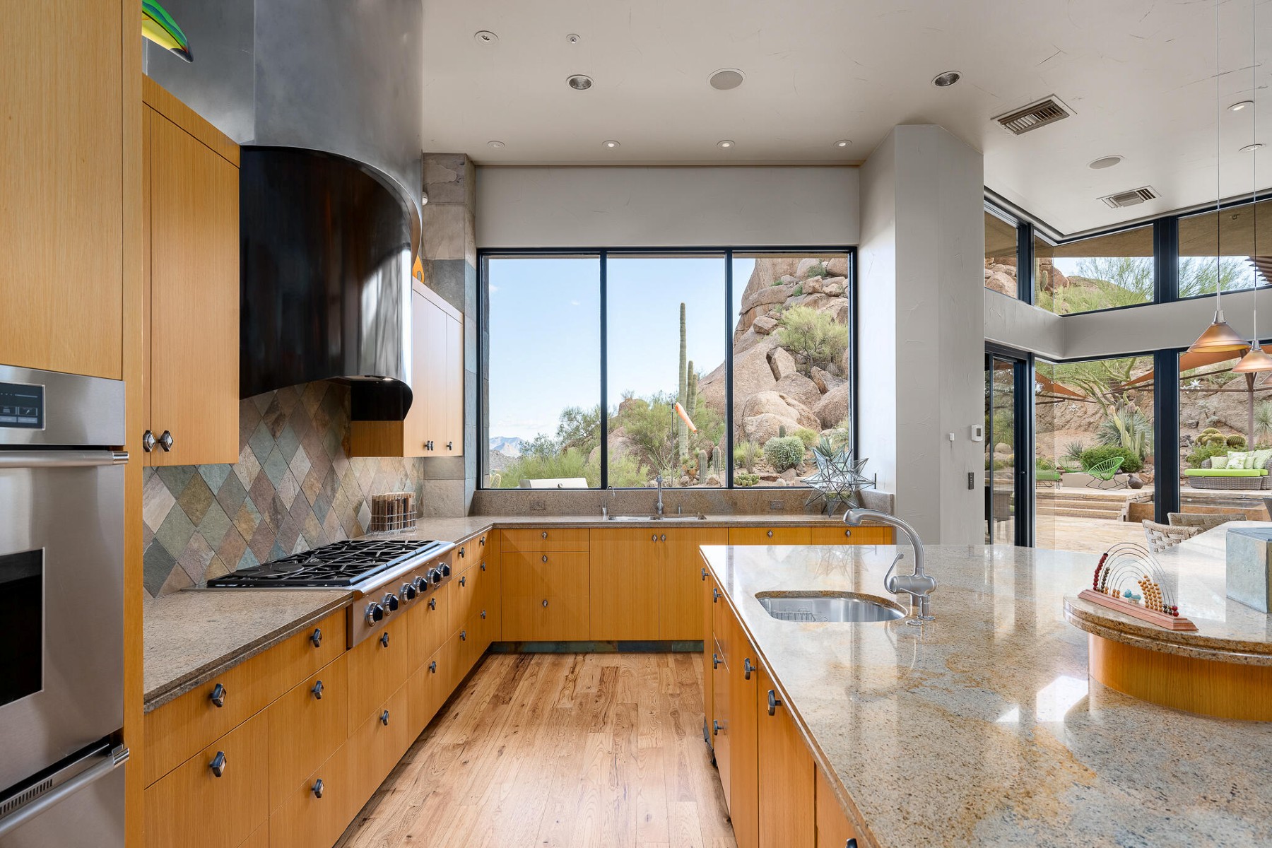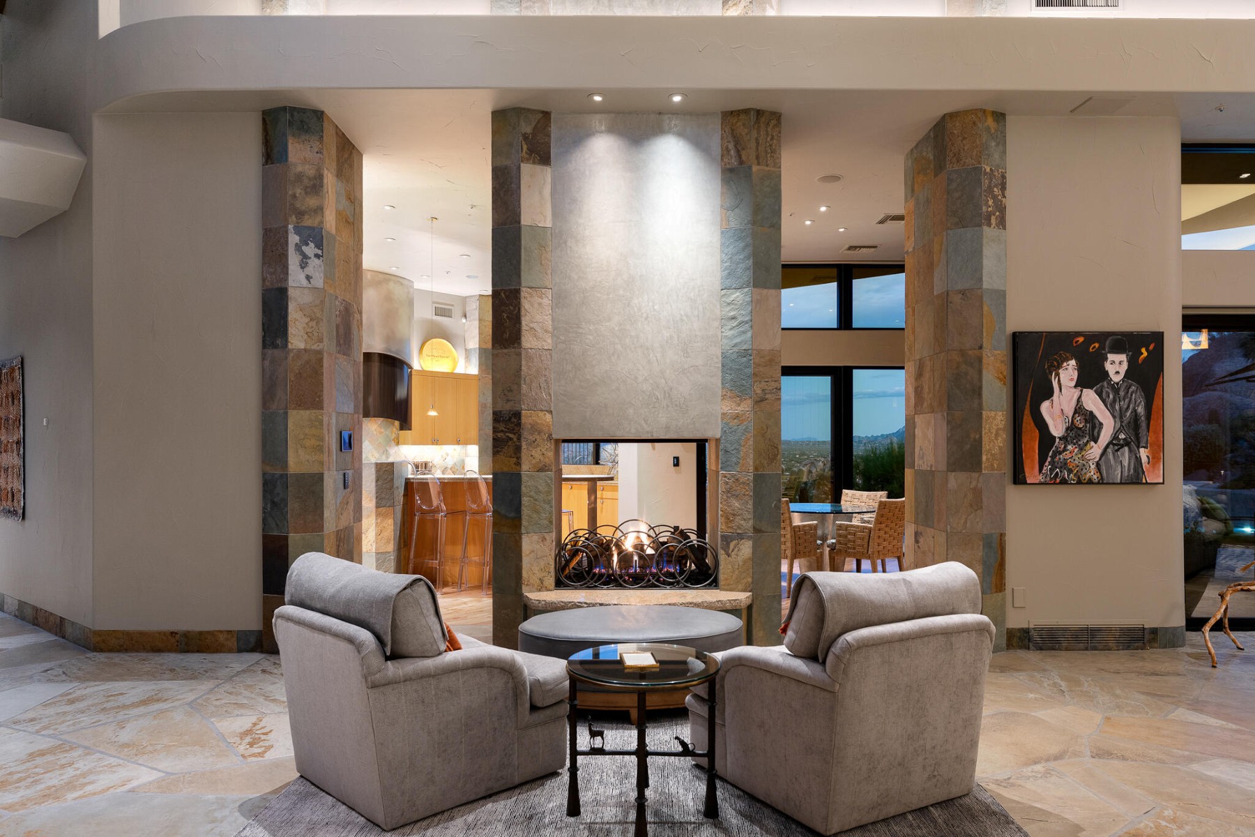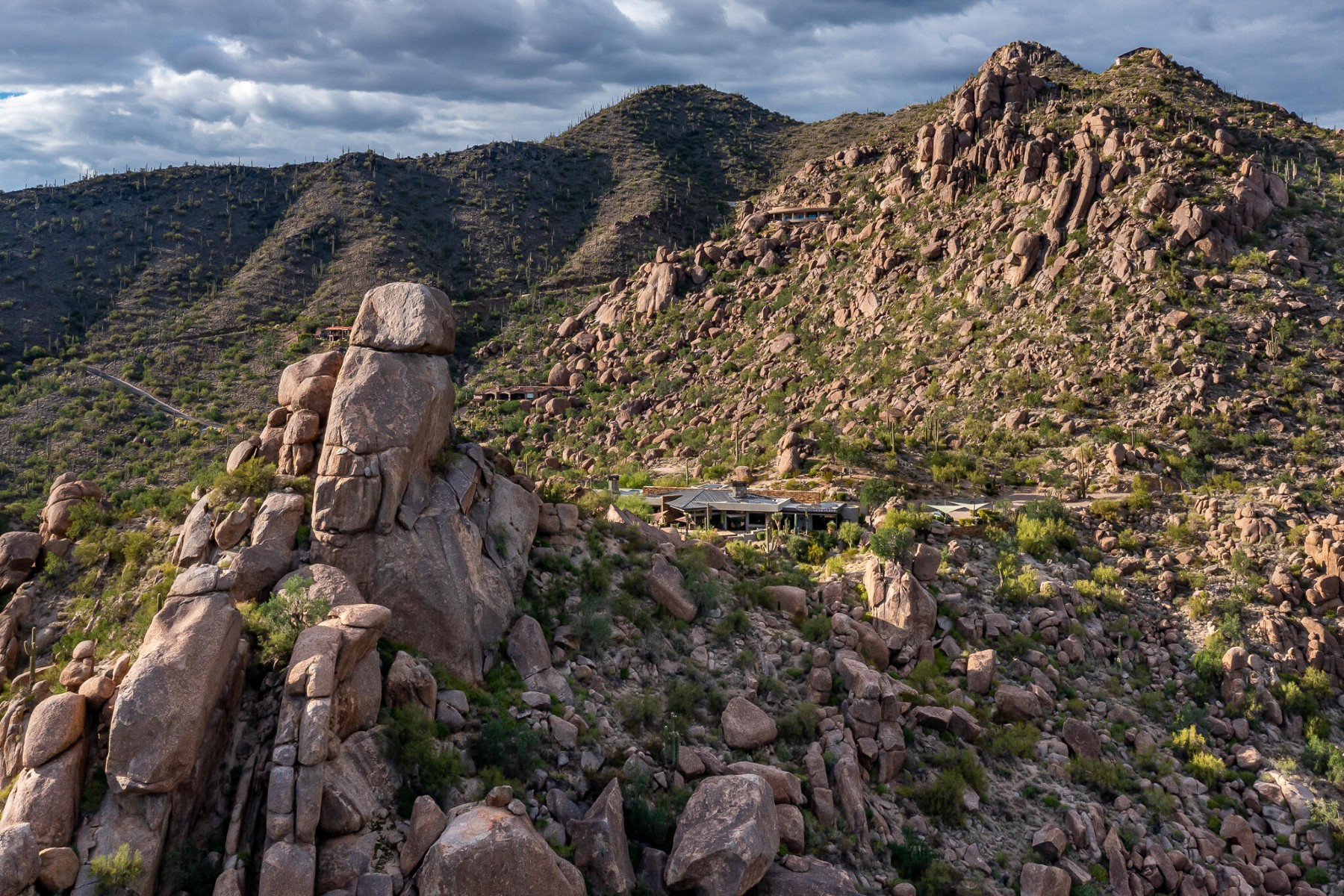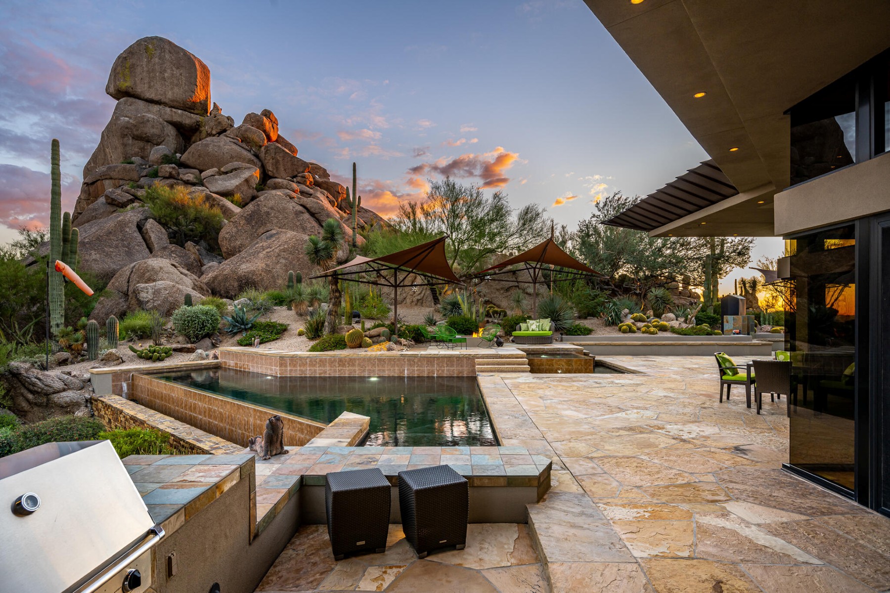 Nestled among the boulders on the south side of Black Mountain, this private, single-level retreat spans over 22 acres, including an adjacent buildable lot, offering exceptional privacy and breathtaking views from every room. Accessed via a gated private drive, this remarkable property is just minutes from shopping and dining, yet feels like a secluded sanctuary. This exceptional architectural estate by Andy Gramling is a study in refined craftsmanship, intentional design, and timeless elegance. An expansive open floor plan creates seamless balance and comfort featuring a stunning great room with a two-way fireplace that opens gracefully to the surrounding outdoor living spaces. Designed to celebrate its breathtaking setting, every room has direct patio access to enjoy the endless views. The primary suite is a peaceful sanctuary featuring a fireplace, private sitting area, and dual walk-in closets. Two additional ensuite bedrooms, each with walk-in closets, open to a secluded patio. Thoughtfully appointed spaces include a versatile fourth bedroom, currently used as an office, a dedicated office with custom built-ins, and an exercise room with beverage cooler. The gourmet kitchen is equipped with Dacor double ovens, gas cooktop, two Miele dishwashers, two warming drawers and two Sub-Zero refrigerators. Additional highlights include a temperature-controlled wine room, a wet bar with dishwasher and Sub-Zero wine refrigerator, and Asko washer and dryer located in both the laundry room and primary suite, heated floors, owned solar panels, automatic backup generator and Savant whole-home automation. Outdoor amenities include multiple patios, a negative-edge heated pool and spa, outdoor fireplace and firepit, and a built-in gas grill, ideal for entertaining while enjoying the surrounding expansive views. Parking features include a three-car garage with built-ins and five EV charging outlets, along with four sail-covered parking spaces. This exceptional Black Mountain estate is a true sanctuary, offering privacy, luxury, advanced technology, and timeless design. For additional details, please refer to the Features List located in the document tab.