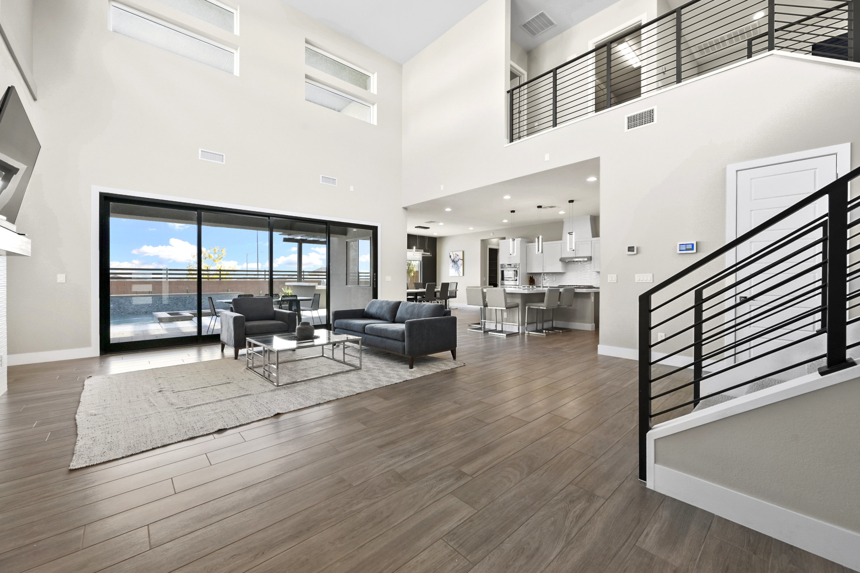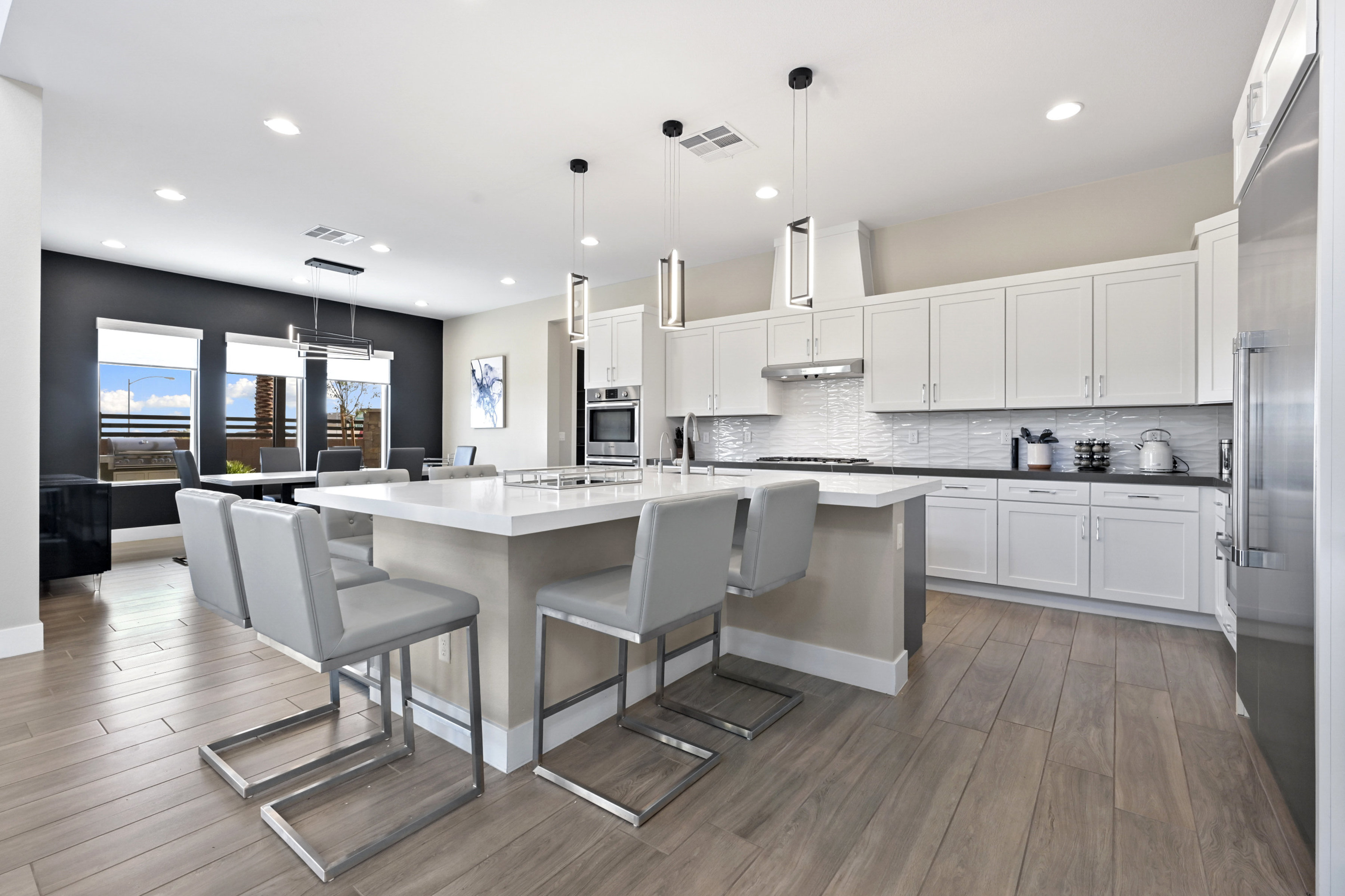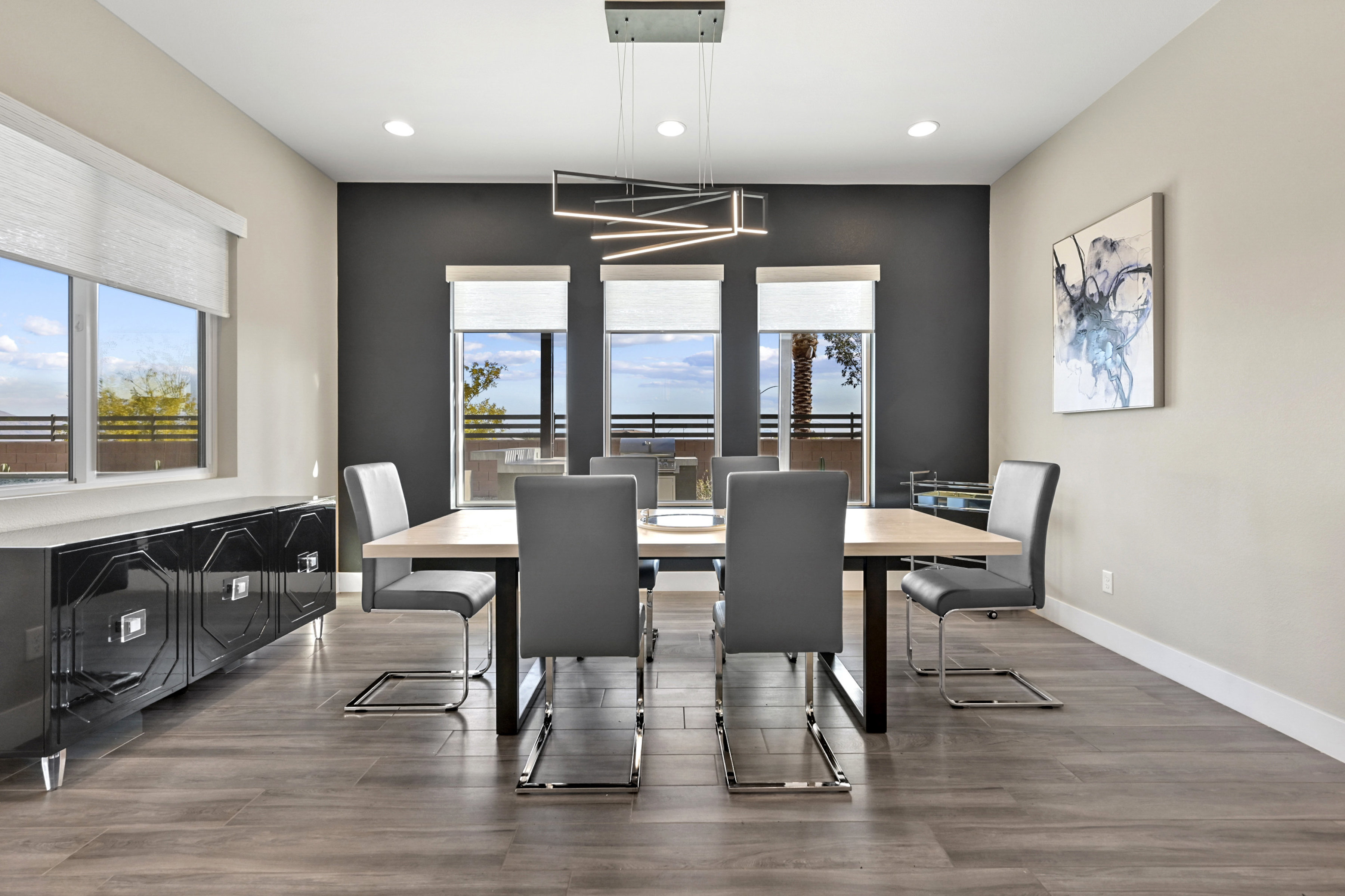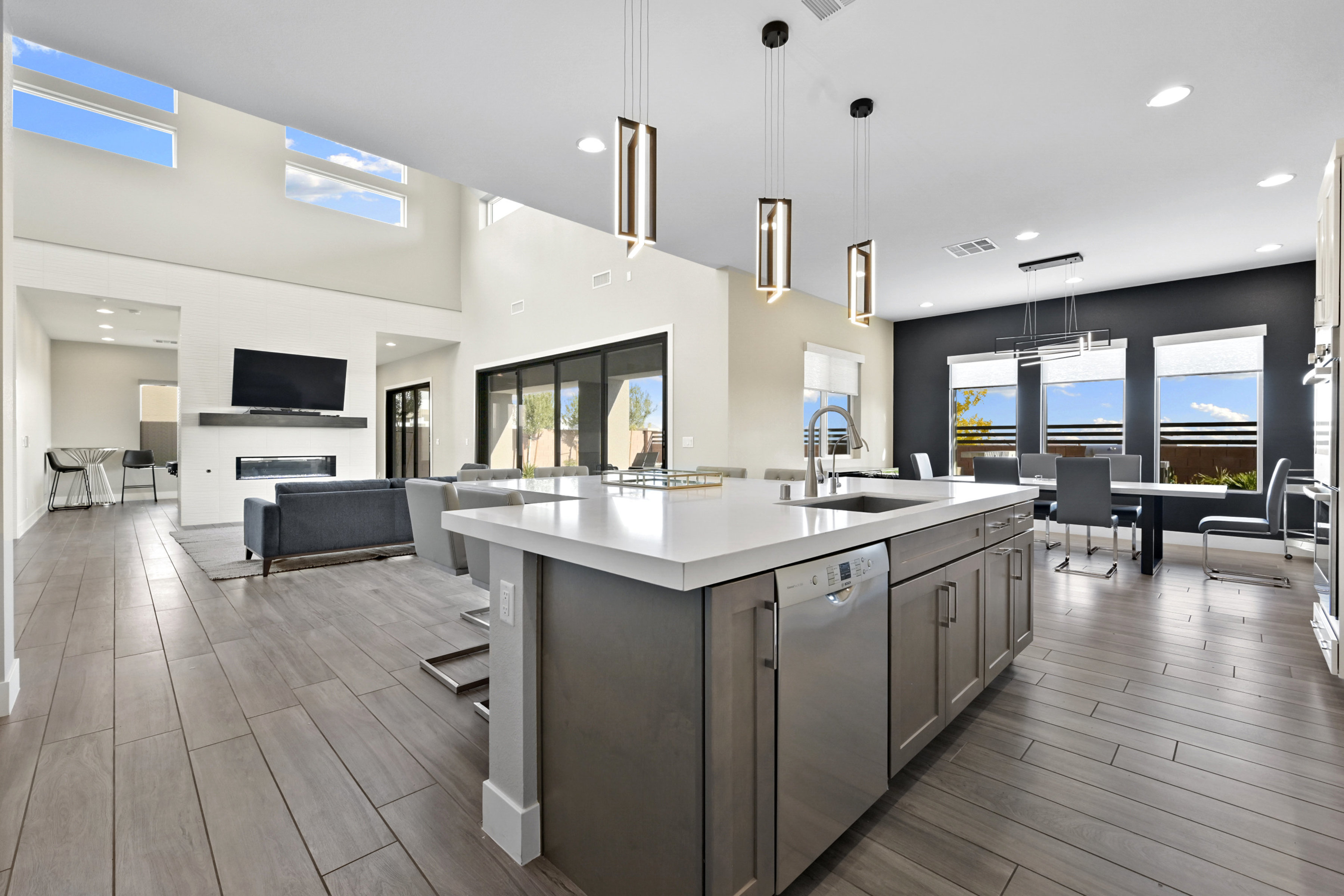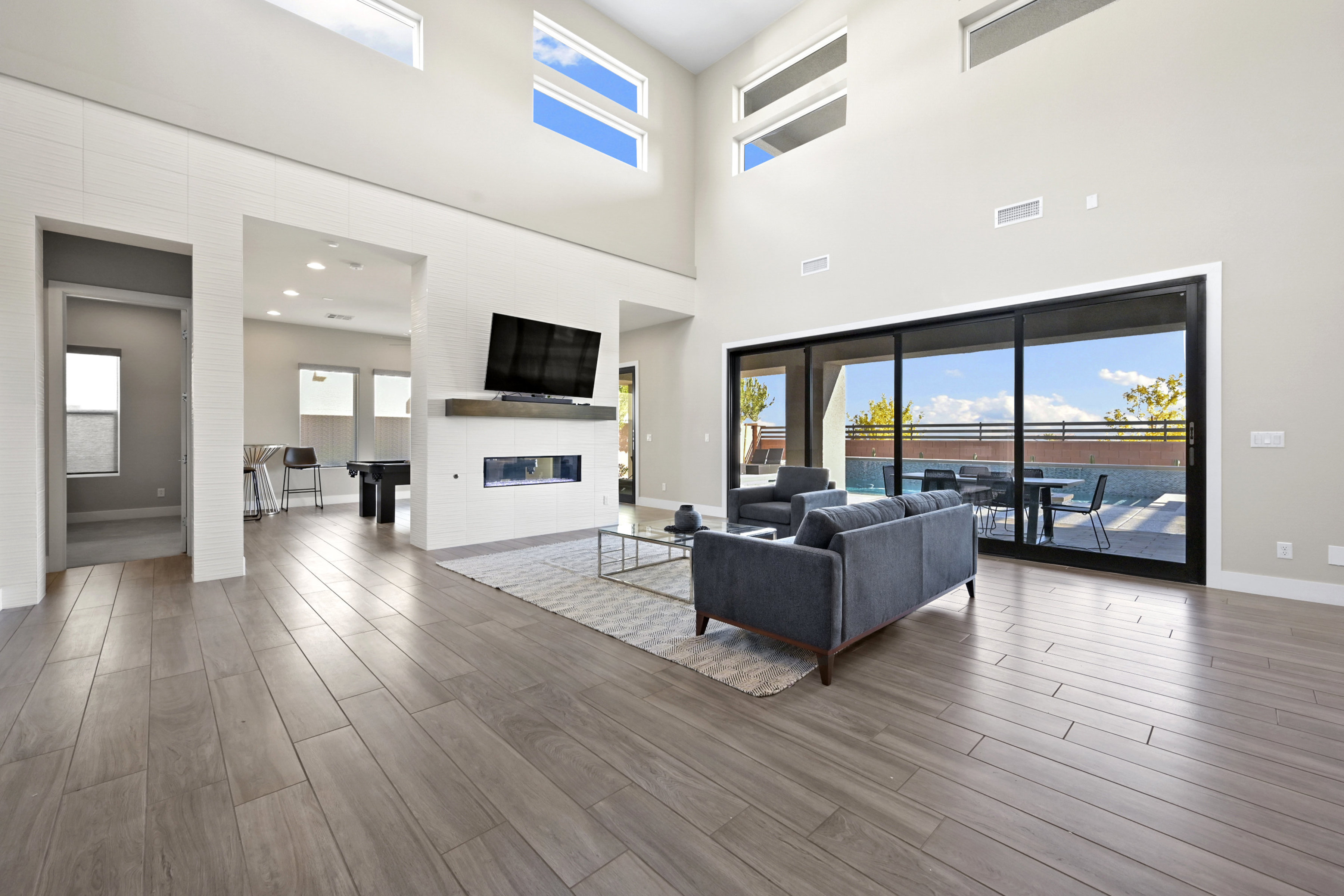This modern 3 bed /3 bath luxurious retreat is a must-see home with stunning mountain, strip and city views! A stunning open and bright floorplan and is centered around a dual sided fireplace. The kitchen is an entertainer's delight; featuring shaker door cabinetry, soft close drawers, quartz countertops, a huge kitchen island, stainless appliances, Thermador refrigerator/freezer, and a spacious walk in pantry. Beautifully designed primary suite with balcony, modern and bright primary bath with separate shower and freestanding soaking tub. Large sliding doors open to the professionally designed backyard that features large pool, infinity edge hot tub, 3 waterfalls, and fire feature /bar. Spacious covered patio with built in outdoor kitchen. This one won't last, make your appointment today. Home is offered fully furnished and available after 6/1/2026