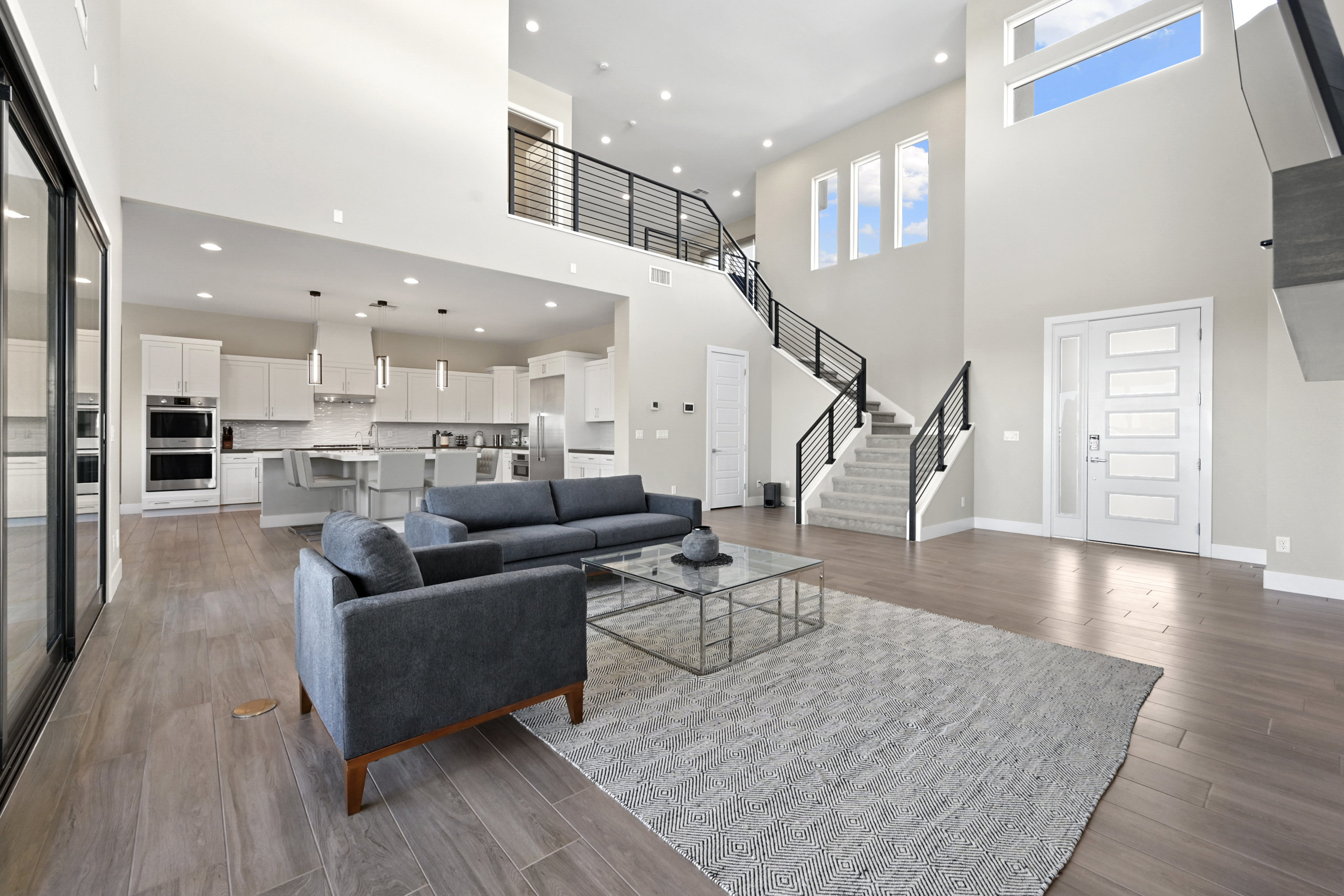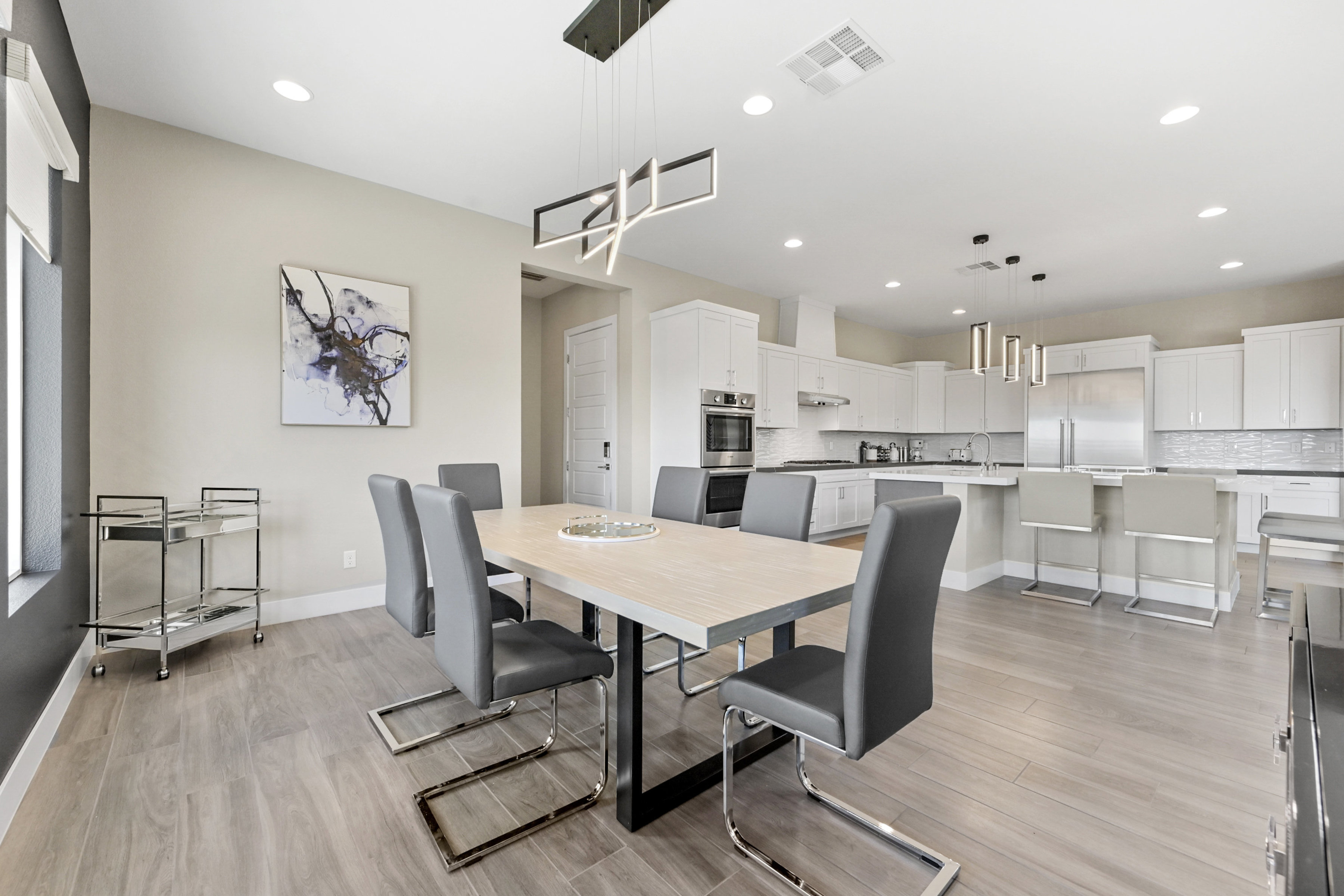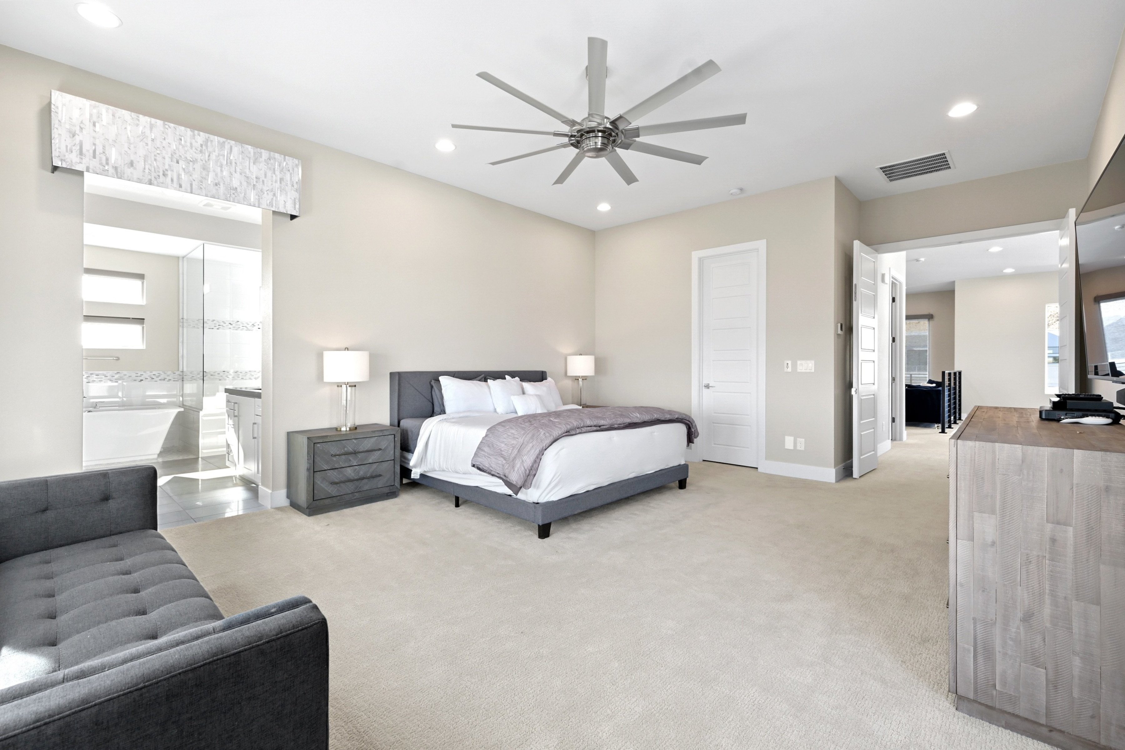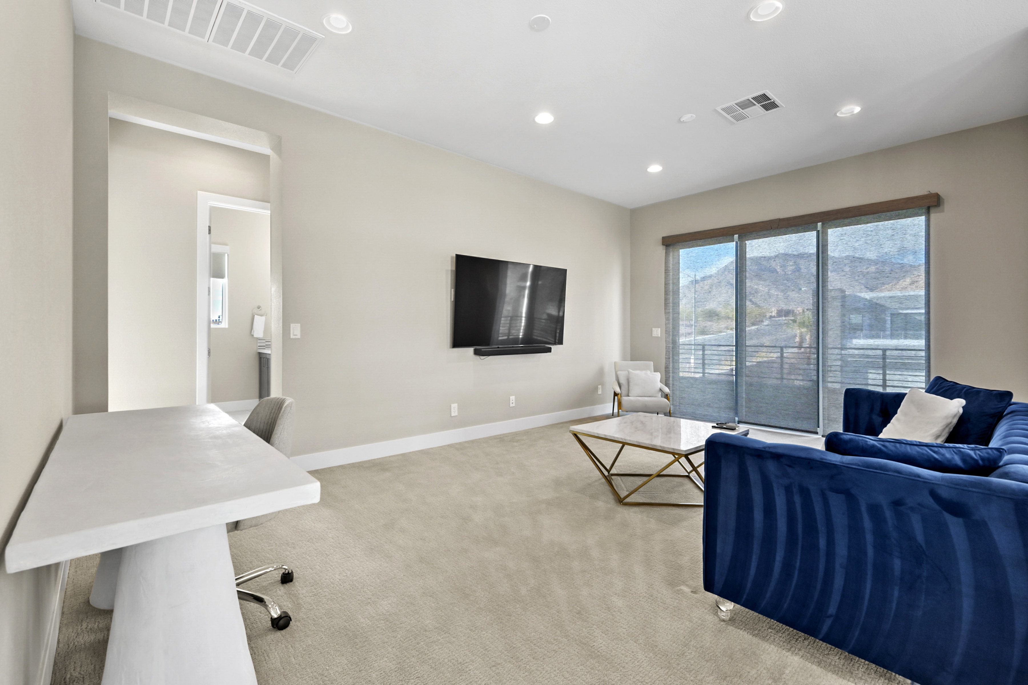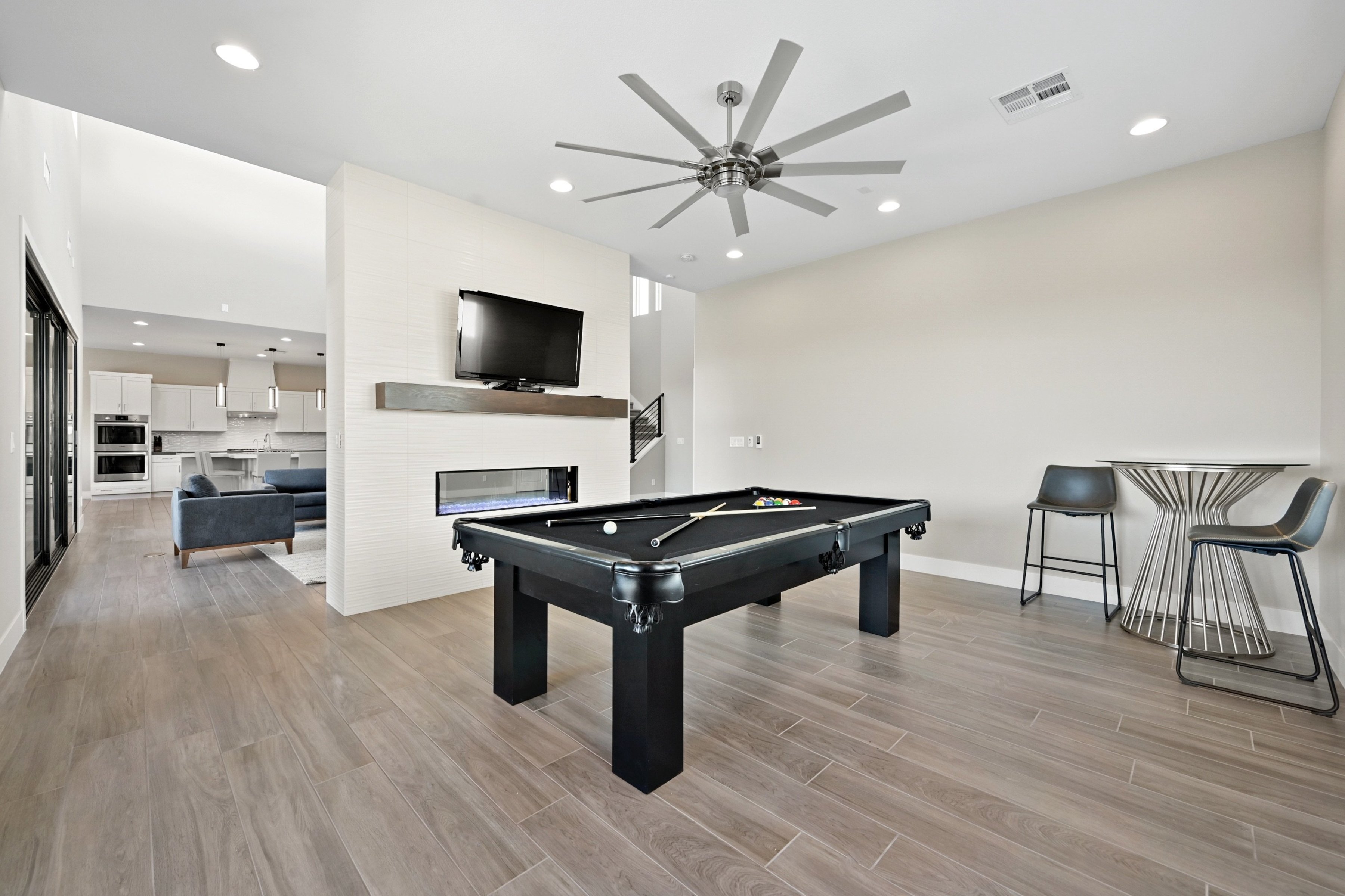 This modern 3 bed /3 bath luxurious retreat is a must-see home with stunning mountain, strip and city views! A stunning open and bright floorplan and is centered around a dual sided fireplace. The kitchen is an entertainer's delight; featuring shaker door cabinetry, soft close drawers, quartz countertops, a huge kitchen island, stainless appliances, Thermador refrigerator/freezer, and a spacious walk in pantry. Beautifully designed primary suite with balcony, modern and bright primary bath with separate shower and freestanding soaking tub. Large sliding doors open to the professionally designed backyard that features large pool, infinity edge hot tub, 3 waterfalls, and fire feature /bar. Spacious covered patio with built in outdoor kitchen. This one won't last, make your appointment today. Home is offered fully furnished and available after 6/1/2026
