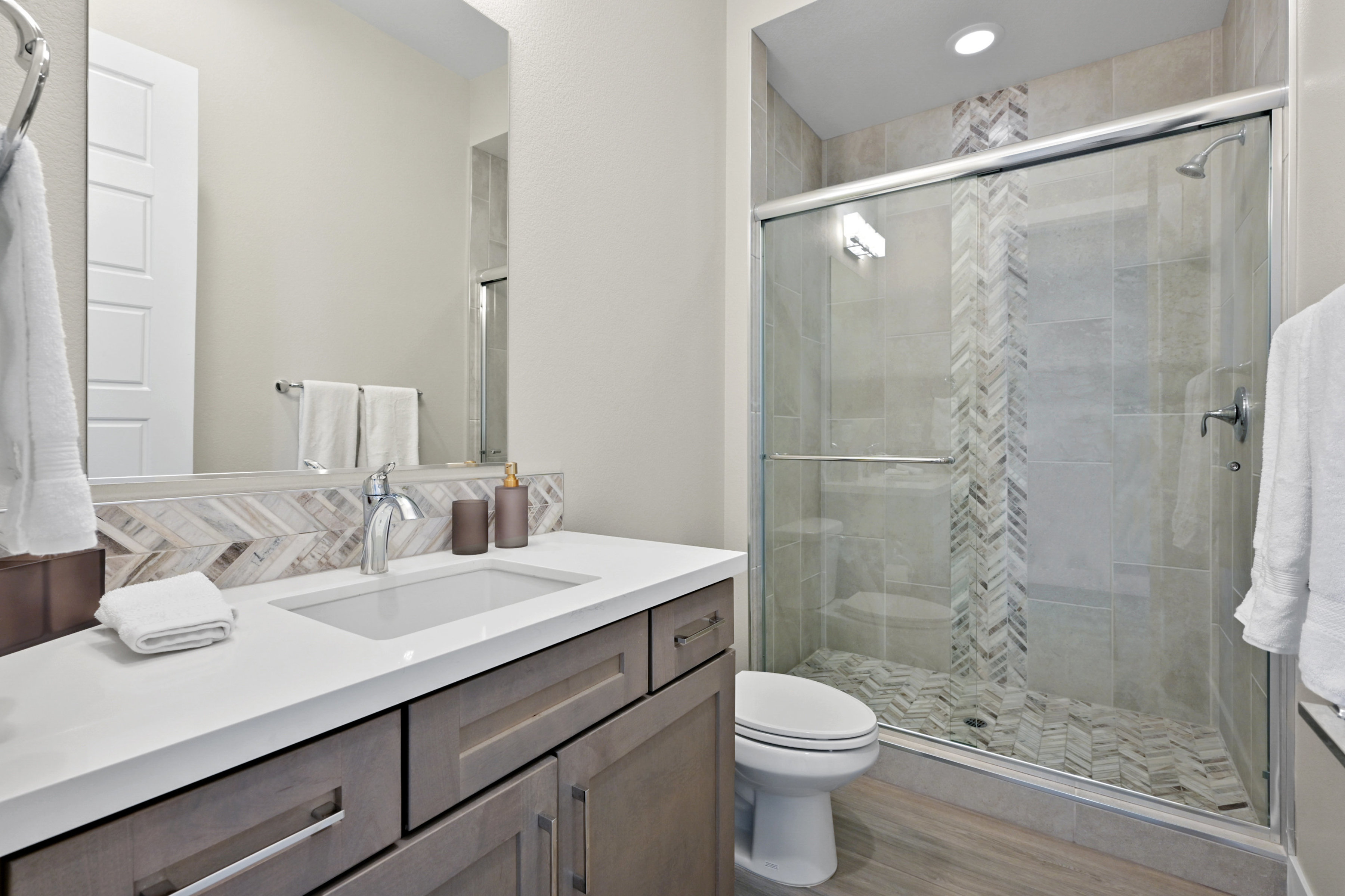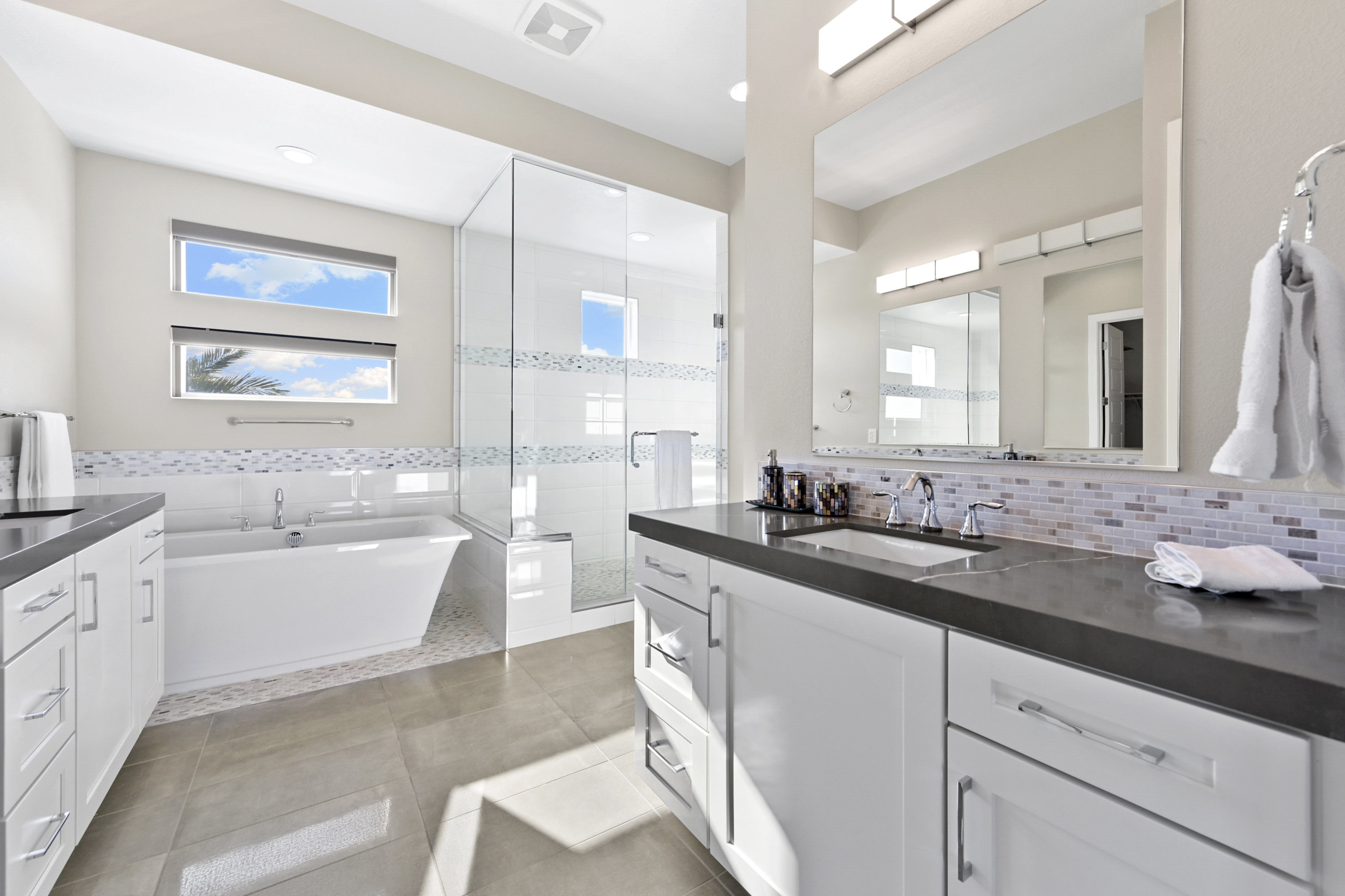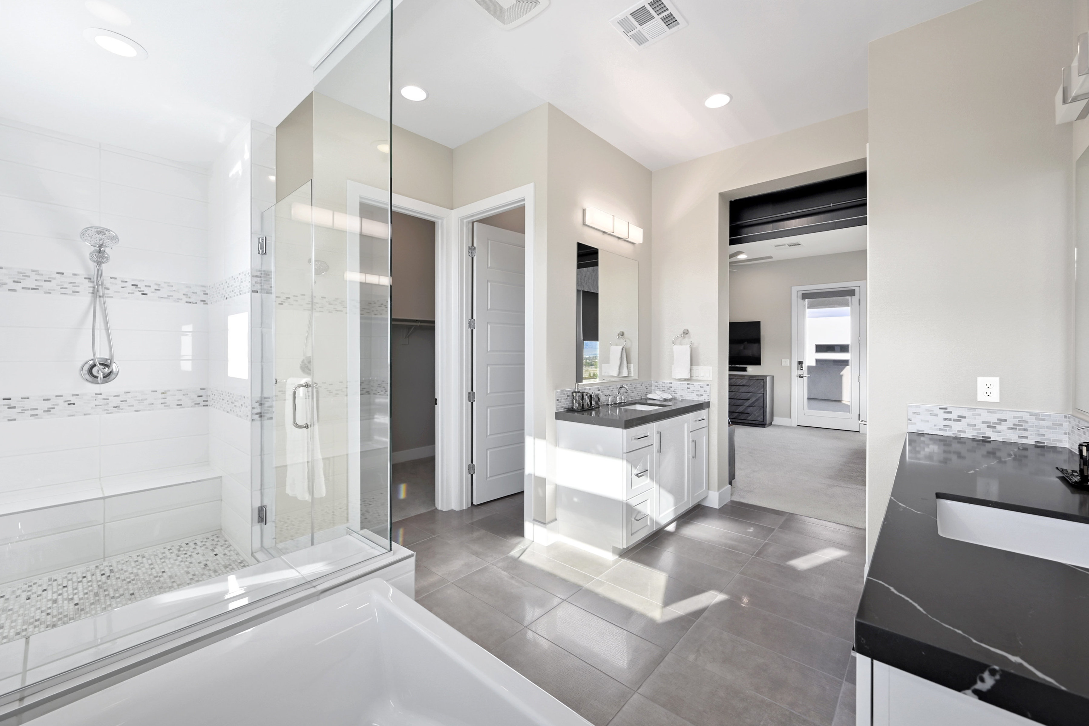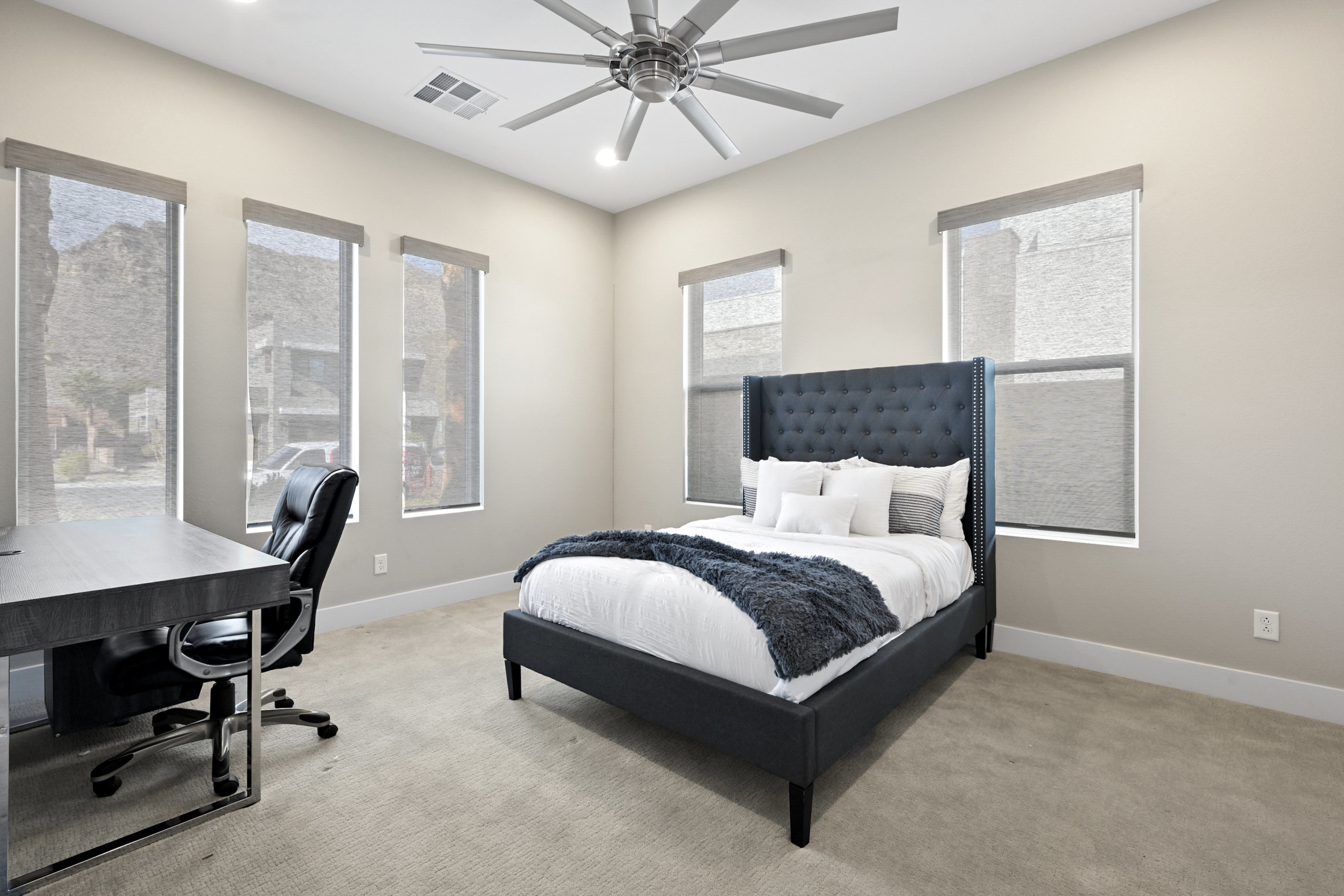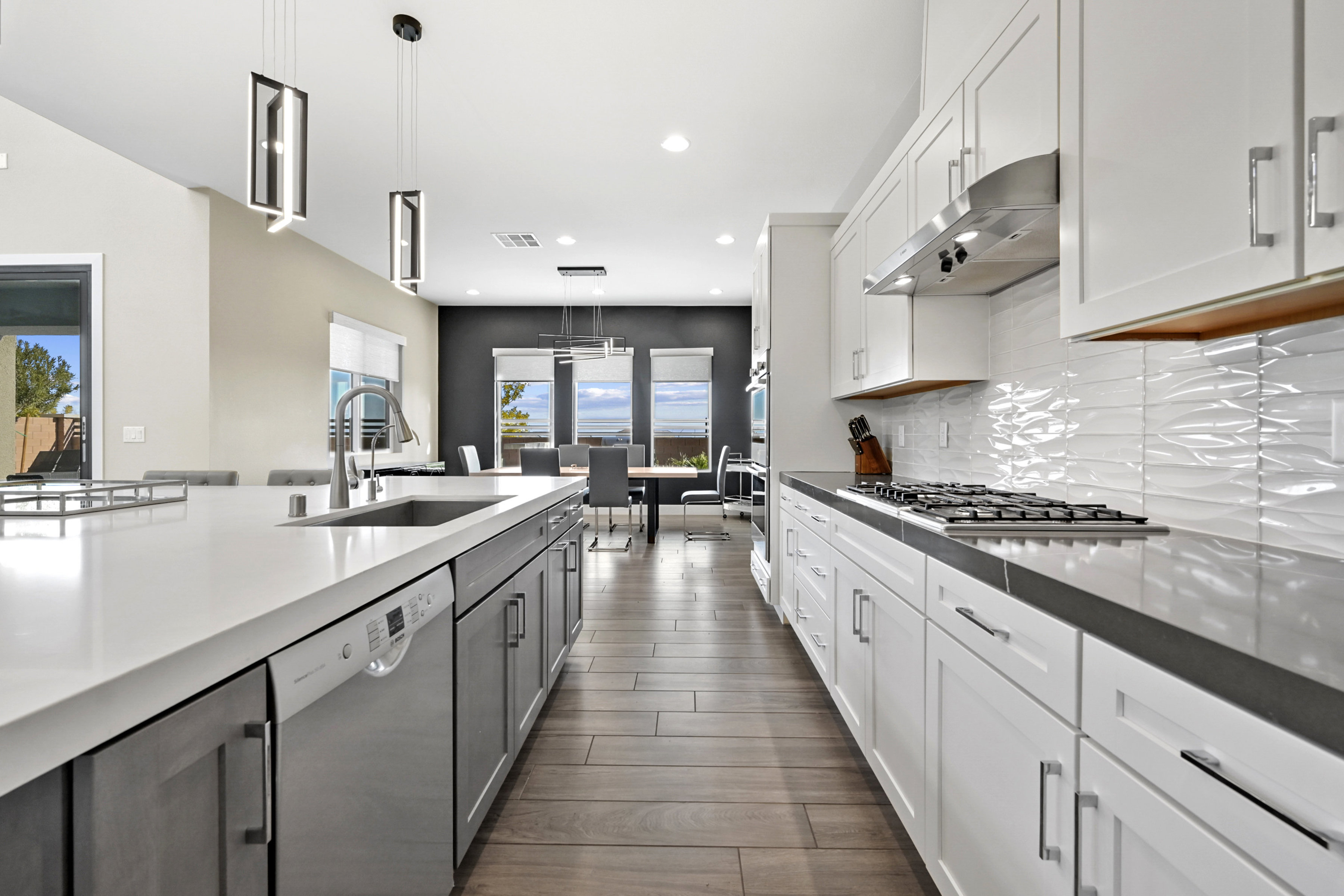 This modern 3 bed /3 bath luxurious retreat is a must-see home with stunning mountain, strip and city views! A stunning open and bright floorplan and is centered around a dual sided fireplace. The kitchen is an entertainer's delight; featuring shaker door cabinetry, soft close drawers, quartz countertops, a huge kitchen island, stainless appliances, Thermador refrigerator/freezer, and a spacious walk in pantry. Beautifully designed primary suite with balcony, modern and bright primary bath with separate shower and freestanding soaking tub. Large sliding doors open to the professionally designed backyard that features large pool, infinity edge hot tub, 3 waterfalls, and fire feature /bar. Spacious covered patio with built in outdoor kitchen. This one won't last, make your appointment today. Home is offered fully furnished and available after 6/1/2026