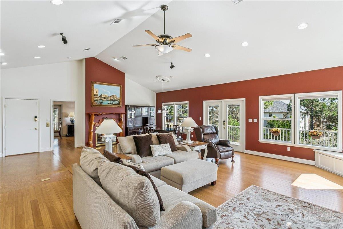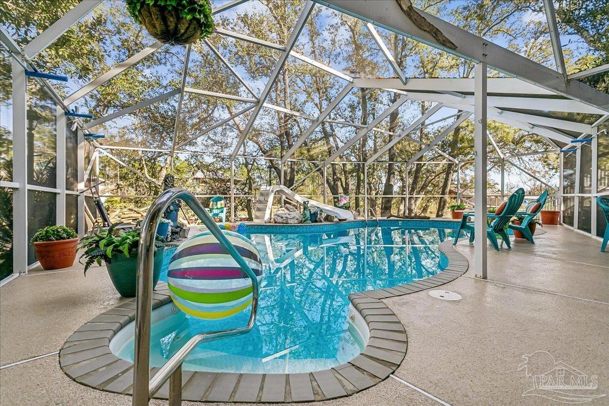 Assumable VA Loan! Get away from it all while being close to it all! Imagine ending each day with the sun setting over the bay as the water moves gently through the canal behind your home. Here, waterfront living is more than a view, it is a lifestyle. With approximately 125 feet of canal frontage and direct access to Escambia bay, this home is designed for life on the water. Featuring a private boat ramp and floating dock that make it easy to launch a boat or a jetski for a fishing trip, paddle out for a quiet morning on the water, or cruise into the bay for a spectacular sunset. The backyard is built for gathering and relaxing with a heated in-ground saltwater pool inside a spacious screened enclosure AND a hot tub. With a covered entertaining area, waterside cabana, fire pit gathering space, and your own personal stone pizza oven! Inside, this well maintained home captures westward views of Escambia Bay through a wall of windows that fills the great room with natural light. The open kitchen is ideal for hosting and features a gas range, double wall ovens, warming drawer, wine cooler, large center island, walk in pantry, and abundant cabinetry. The primary suite opens to the wraparound deck and includes a garden tub, separate shower, dual sinks, and walk in closet. Additional features include a double sided ELEVATOR, screened in balcony, extensive storage below the home, three car carport, RV/boat parking, and a cute, detached shed installed in 2017 that could serve as a hobby studio, fishing gear headquarters, workshop, or creative space. A gas fueled generator conveys with the home, and recent improvements include a brand new HVAC system in February 2026, new water heater in 2025, updated dock and seawall, paver walkways, and garden area with fruit trees and scuppernong grape vines! Tucked near the end of the street for added privacy, this property offers a rare opportunity to enjoy true waterfront living while remaining a short drive from Pensacola.